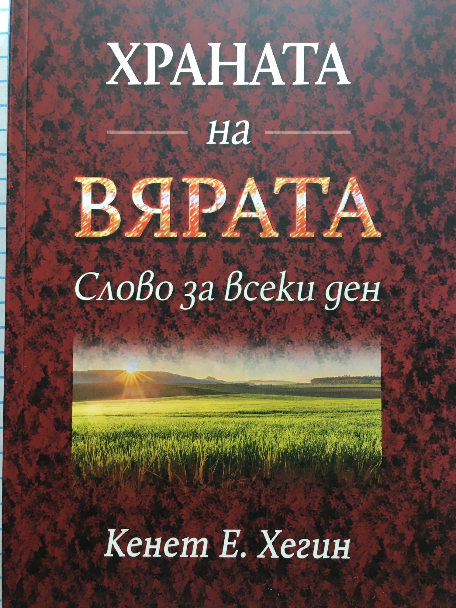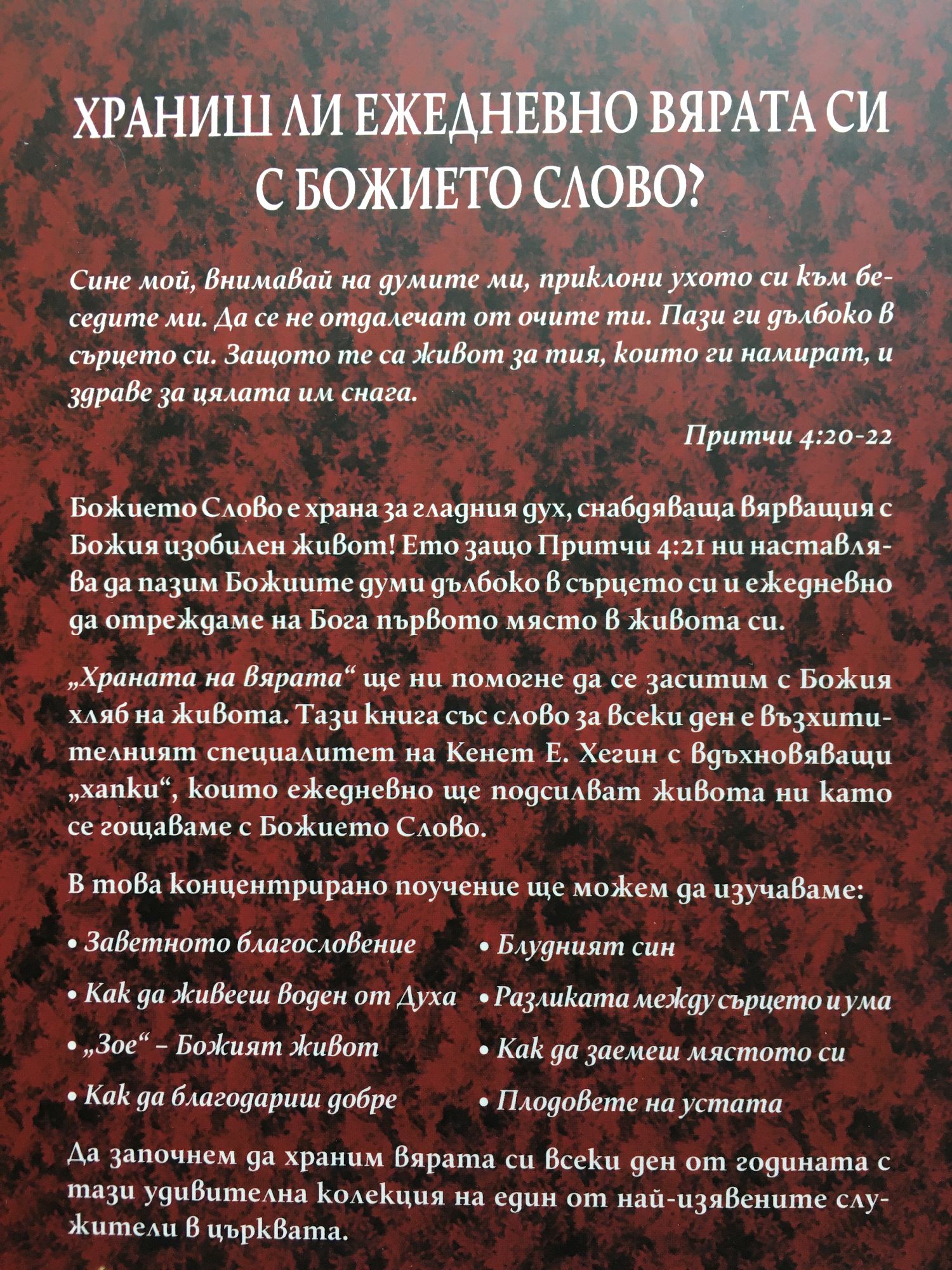 "Сине мой, внимавай на думите ми, приклони ухото си към беседите ми. Да не се отдалечавам от очите ти, пази ги дълбоко в сърцето си. Защото те са живот за тези, които ги намират, и здраве за цялата им снага." Притчи 4:20-22 Божието слово е храна за гладния дух, снабдяваща вярващия с Божия изобилен живот! Ето защо Притчи 4:21 ни наставлява да пазим Божиите думи дълбоко в сърцето си, и ежедневно да отреждаме на Бог първо място в живота си. "Храната на вярата" ще ти помогне да се заситиш с Божия хляб на живота. Тази книга със слово за всеки дене възхитителният специалитет на Кенет Е. Хегинс вдъхновяващи "хапки", които ежедневно ще подсилват живота ви като се гощаваш с Божието Слово. В това концентритано поучение ще можеш да изучаваш: Заветното благословение Как да живееш, воден от Духа "Зое" - Божият живот Как да благодариш добре Блудният син Разликата между сърцето и ума Как да заемеш мястото си Плодовете на устата Започни да храниш вярата си всеки ден от годината с тази удивителна колекция на един от най-изявените служители в Църквата.