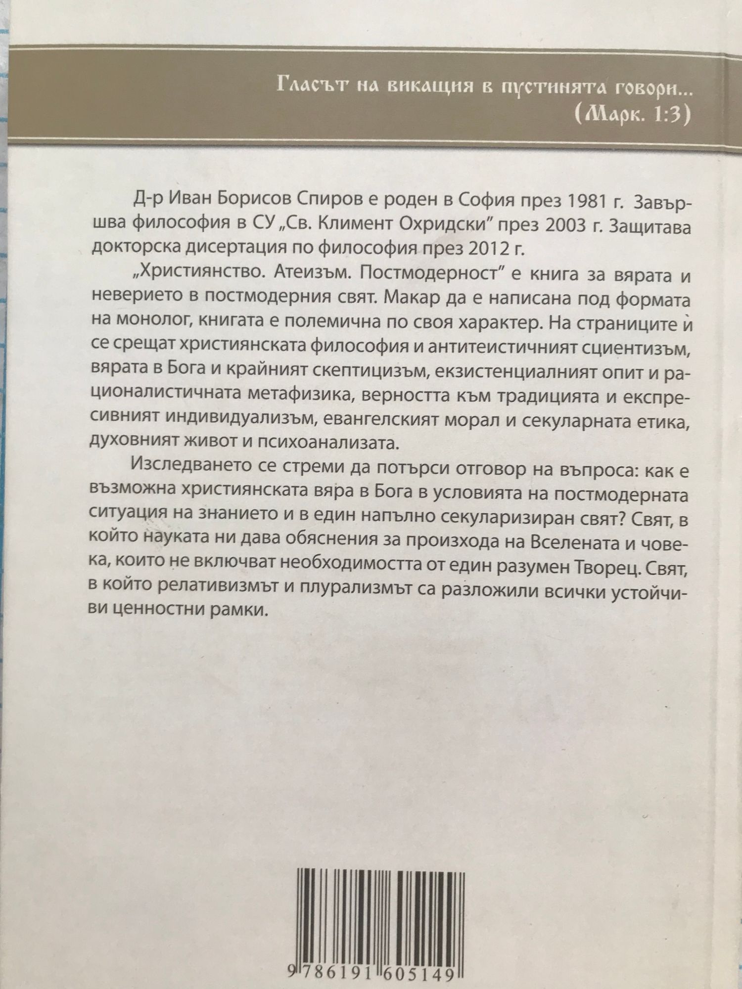 Д-р Иван Борисов Спиров е роден в София през 1981 г. Завършва философия в СУ "Св. Климент Охридски" през 2003 г. Защитава докторска дисертация по философия през 2012 г. "Християнство. Атеизъм. Постмодерност" е книга за вярата и неверието в постмодерния свят. Макар и написана под формата на монолог, книгата е полемична по своя характер. На страниците й се срещат християнската философия и антитеистичният сциентизъм, вярата в Бога и крайният скептицизъм, екзистенциалният опит и рационалистичната метафизика, верността към традицията и експресивният индивидуализъм, евангелският морал и секуларната етика, духовният живот и психоанализата. Изследването се стреми да потърси отговор на въпроса: как е възможна християнската вяра в Бога в условията на постмодерната ситуация на знанието и в един напълно секуларизиран свят? Свят, в който науката ни дава обяснения за произхода на Вселената и човека, които не включват необходимостта от един разумен Творец. Свят, в който релативизмът и плурализмът са разложили всички устойчиви ценностни рамки.