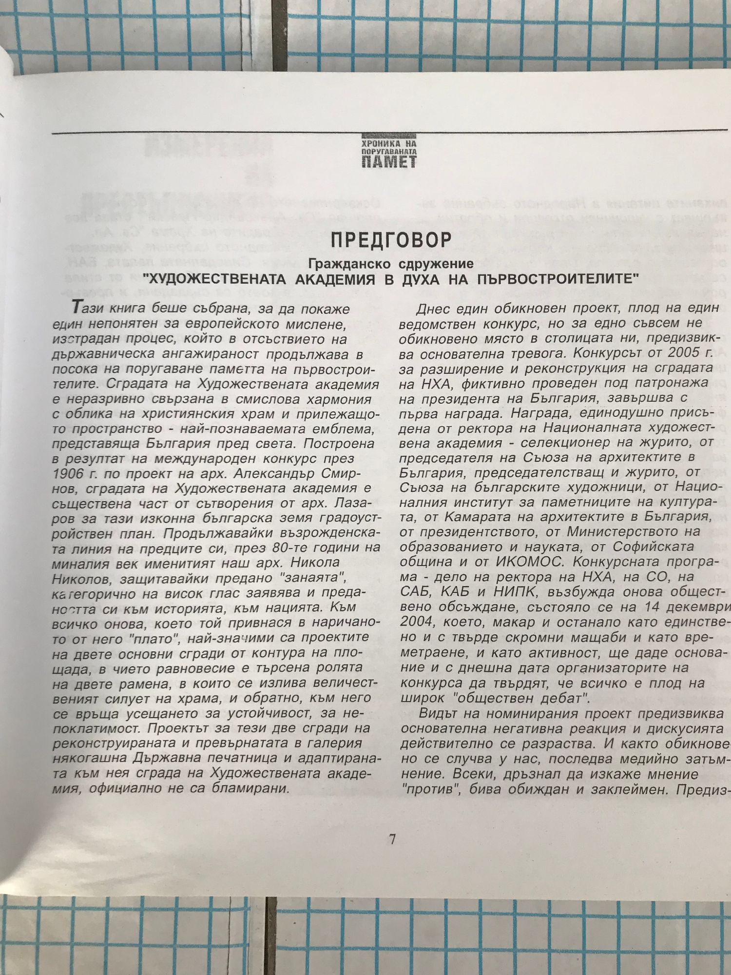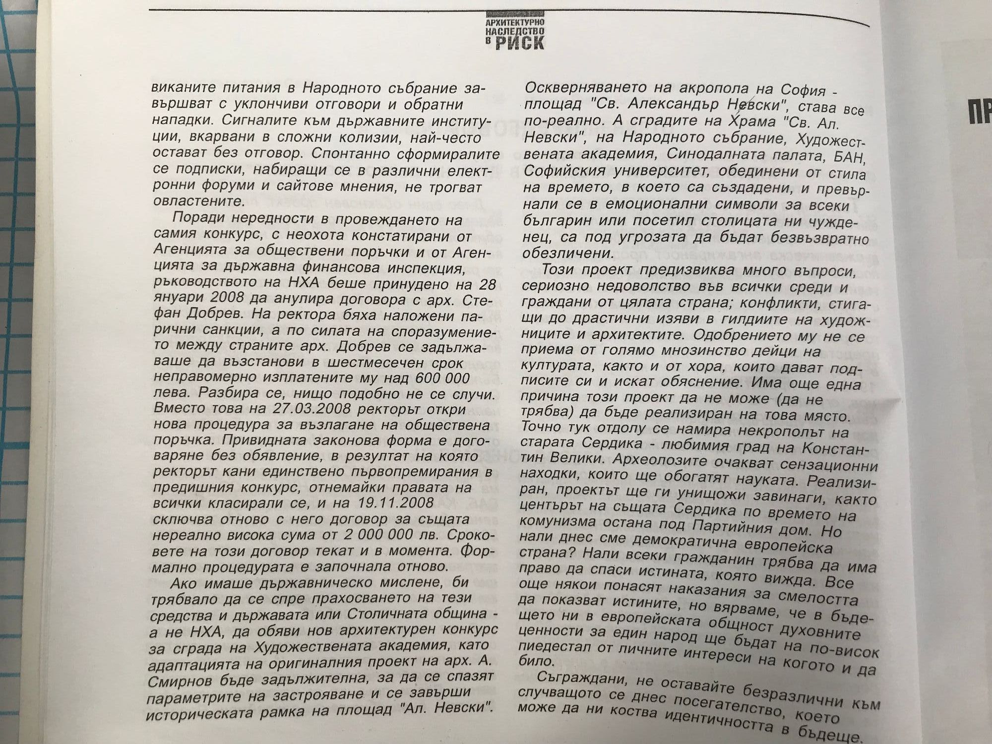 Книгата има за цел да предупреди широката българска общественост за посегателството срещу емблематичната за духовния център на столицата - Национална художествена академия. Тя включва статии от известни български архитекти, отворени писма, призиви и др. Тази книга беше събрана, за да покаже един непонятен за европейското мислене, изстрадан процес, който в отсъствието на държавническа ангажираност продължава в посока на поругаване паметта на първостроителите. Сградата на Художествената академия е неразривно свързана в смислова хармония с облика на християнския храм и прилежащото пространство - най-познаваемата емблема, представяща България пред света. Построена в резултат на международен конкурс през 1906 г. по проект на арх. Александър Смирнов, сградата на Художествената академия е съществена част от сътворения от арх. Лазаров за тази изконна българска земя градоустройствен план. Продължавайки възрожденската линия на предците си, през 80-те години на миналия век именитият наш арх. Никола Николов, защитавайки предано "занаята", Категорично на висок глас заявява и предаността си към историята, към нацията. Към всичко онова, което той привнася в наричаното от него "плато", най-значими са проектите на двете основни сгради от контура на площада, в чието равновесие е търсена ролята на двете рамена, в които се излива величественият силует на храма, и обратно, към него се връща усещането за устойчивост, за непоклатимост. Проектът за тези две сгради на реконструираната и превърнатата в галерия някогашна Държавна печатница и адаптираната към нея сграда на Художествената академия, официално не са бламирани.