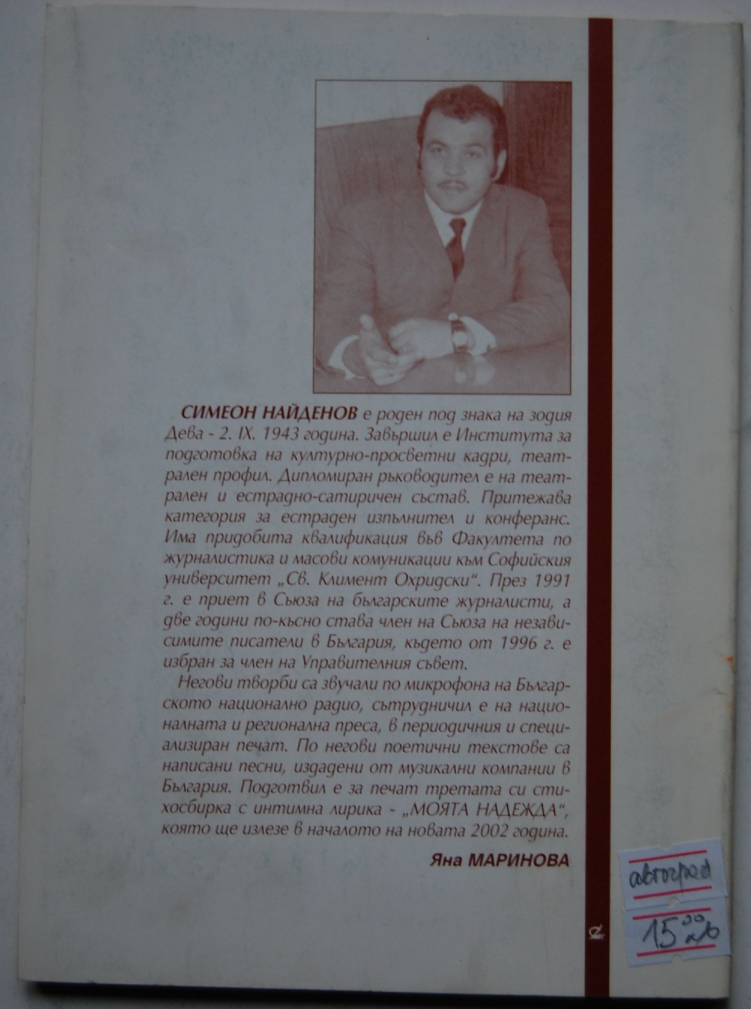 7,67 € / 15,00 лв.Много добро състояние на книжното тяло. С автограф