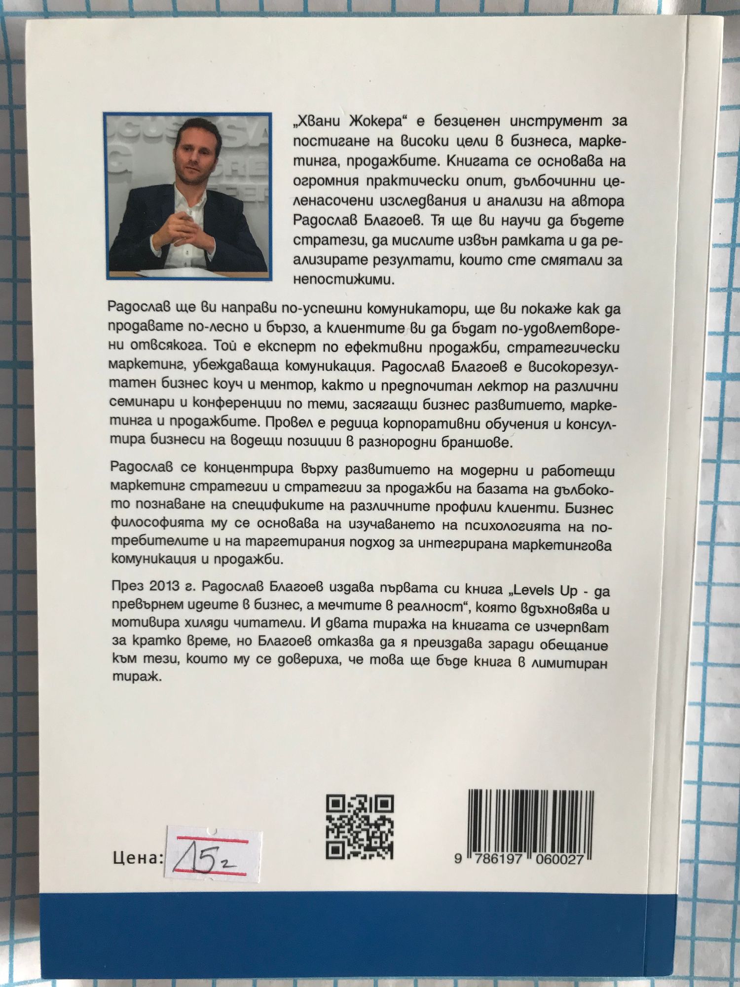 „Хвани Жокера“ е безценен инструмент за постигане на високи цели в бизнеса, маркетинга, продажбите. Книгата се основава на огромния практически опит, дълбочинни целенасочени изследвания и анализи на автора Радослав Благоев. Тя ще ви научи да бъдете стратези, да мислите извън рамката и да реализирате резултати, които сте смятали за непостижими. Радослав ще ви направи по-успешни комуникатори, ще ви покаже как да продавате по-лесно и бързо, а клиентите ви да бъдат по-удовлетворени отвсякога. Той е експерт по ефективни продажби, стратегически маркетинг, убеждаваща комуникация. Радослав Благоев е високорезултатен бизнес коуч и ментор, както и предпочитан лектор на различни семинари и конференции по теми, засягащи бизнес развитието, маркетинга и продажбите. Провел е редица корпоративни обучения и консултира бизнеси на водещи позиции в разнородни браншове. Радослав се концентрира върху развитието на модерни и работещи маркетинг стратегии и стратегии за продажби на базата на дълбокото познаване на спецификите на различните профили клиенти. Бизнес философията му се основава на изучаването на психологията на потребителите и на таргетирания подход за интегрирана маркетингова комуникация и продажби. През 2013 г. Радослав Благоев издава първата си книга „Levels Up – да превърнем идеите в бизнес, а мечтите в реалност“, която вдъхновява и мотивира хиляди читатели. И двата тиража на книгата се изчерпват за кратко време, но Благоев отказва да я преиздава заради обещание към тези, които му се довериха, че това ще бъде книга в лимитиран тираж.