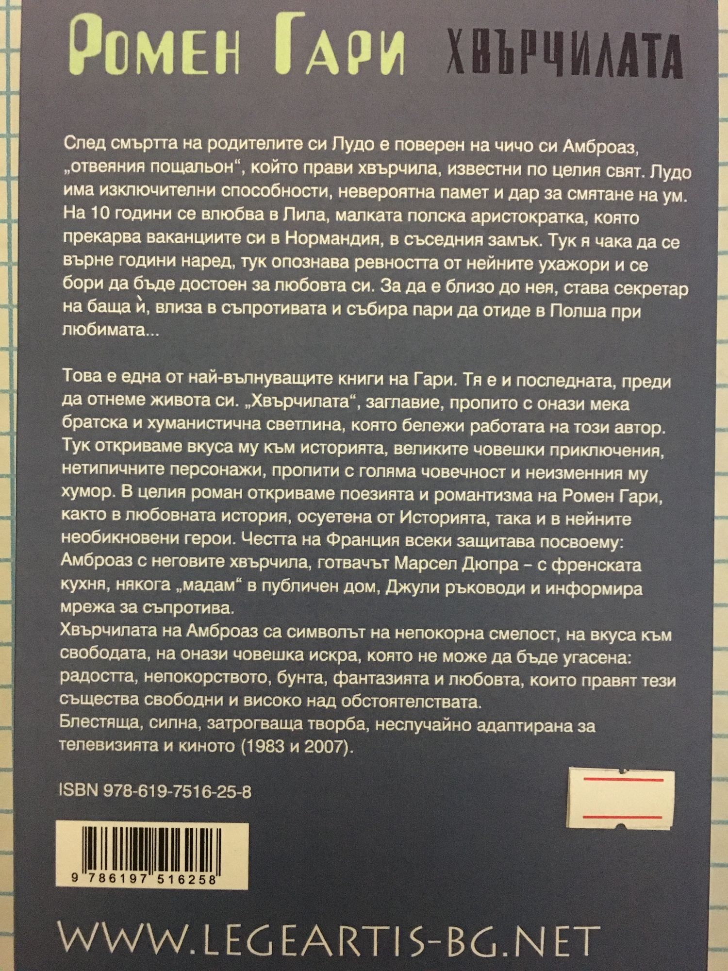 След смъртта на родителите си Лудо е поверен на чичо си Амброаз, "отвеяния пощальон", който прави хвърчила, известни по целия свят. Лудо има изключителни способности, невероятна памет и дар за смятане на ум. На 10 години се влюбва в Лила, малката полска аристократка, която прекарва ваканциите си в Нормандия, в съседния замък. Тук я чака да се върне години наред, тук опознава ревността от нейните ухажори и се бори да бъде достоен за любовта си. За да е близо до нея, става секретар на баща ѝ, влиза в съпротивата и събира пари да отиде в Полша при любимата... Това е една от най-вълнуващите книги на Гари. Тя е и последната, преди да отнеме живота си. "Хвърчилата", заглавие, пропито с онази мека братска и хуманистична светлина, която бележи работата на този автор. Тук откриваме вкуса му към историята, великите човешки приключения, нетипичните персонажи, пропити с голяма човечност и неизменния му хумор. В целия роман откриваме поезията и романтизма на Ромен Гари, както в любовната история, осуетена от Историята, така и в нейните необикновени герои. Честта на Франция всеки защитава посвоему: Амброаз с неговите хвърчила, готвачът Марсел Дюпра - с френската кухня, някога "мадам" в публичен дом, Джули ръководи и информира мрежа за съпротива. Хвърчилата на Амброаз са символът на непокорна смелост, на вкуса към свободата, на онази човешка искра, която не може да бъде угасена: радостта, непокорството, бунта, фантазията и любовта, които правят тези същества свободни и високо над обстоятелствата. Блестяща, силна, затрогваща творба, неслучайно адаптирана за телевизията и киното (1983 и 2007).