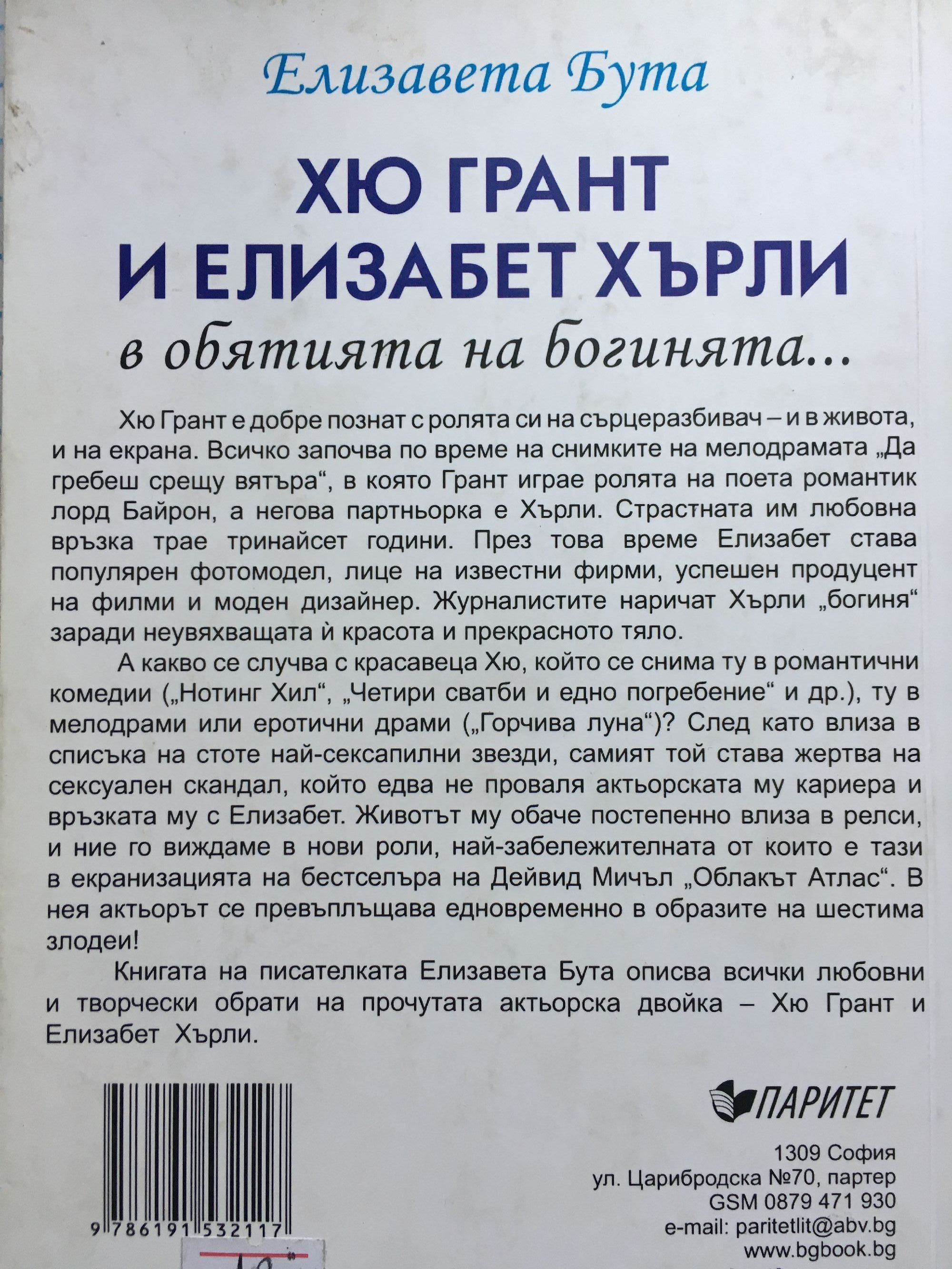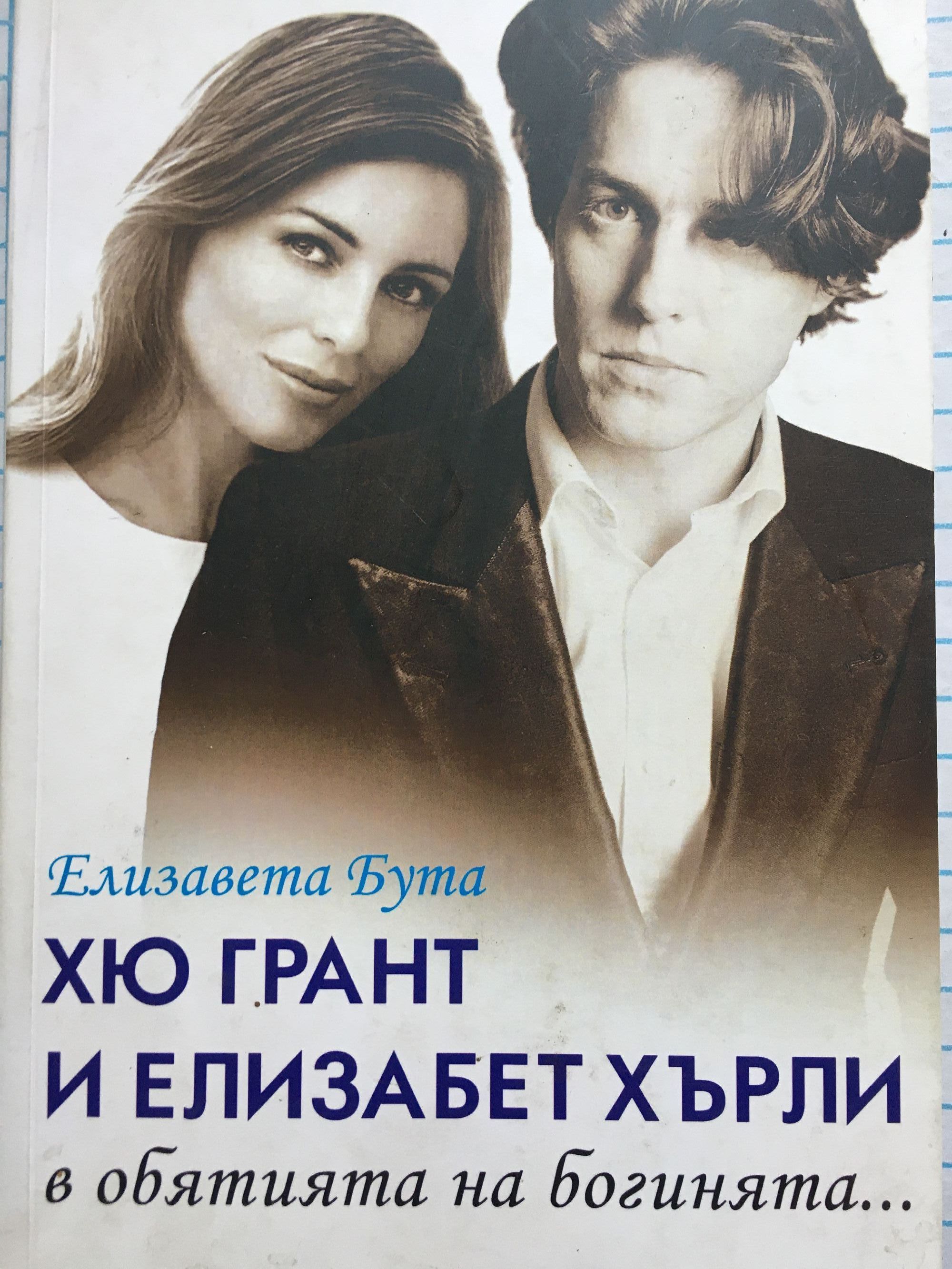 Хю Грант е добре познат с ролята си на сърцеразбивач – и в живота, и на екрана. Всичко започва по време на снимките на мелодрамата „Да гребеш срещу вятъра“, в която Грант играе ролята на поета романтик лорд Байрон, а негова партньорка е Хърли. Страстната им любовна връзка трае тринайсет години. През това време Елизабет става популярен фотомодел, лице на известни фирми, успешен продуцент на филми и моден дизайнер. Журналистите наричат Хърли „богиня“ заради неувяхващата ѝ красота и прекрасното тяло. А какво се случва с красавеца Хю, който се снима ту в романтични комедии („Нотинг Хил“, „Четири сватби и едно погребение“ и др.), ту в мелодрами или еротични драми („Горчива луна“)? След като влиза в списъка на стоте най-сексапилни звезди, самият той става жертва на сексуален скандал, който едва не проваля актьорската му кариера и връзката му с Елизабет. Животът му обаче постепенно влиза в релси, и ние го виждаме в нови роли, най-забележителната от които е тази в екранизацията на бестселъра на Дейвид Мичъл „Облакът Атлас“. В нея актьорът се превъплъщава едновременно в образите на шестима злодеи! Книгата на писателката Елизавета Бута описва всички любовни и творчески обрати на прочутата актьорска двойка – Хю Грант и Елизабет Хърли.