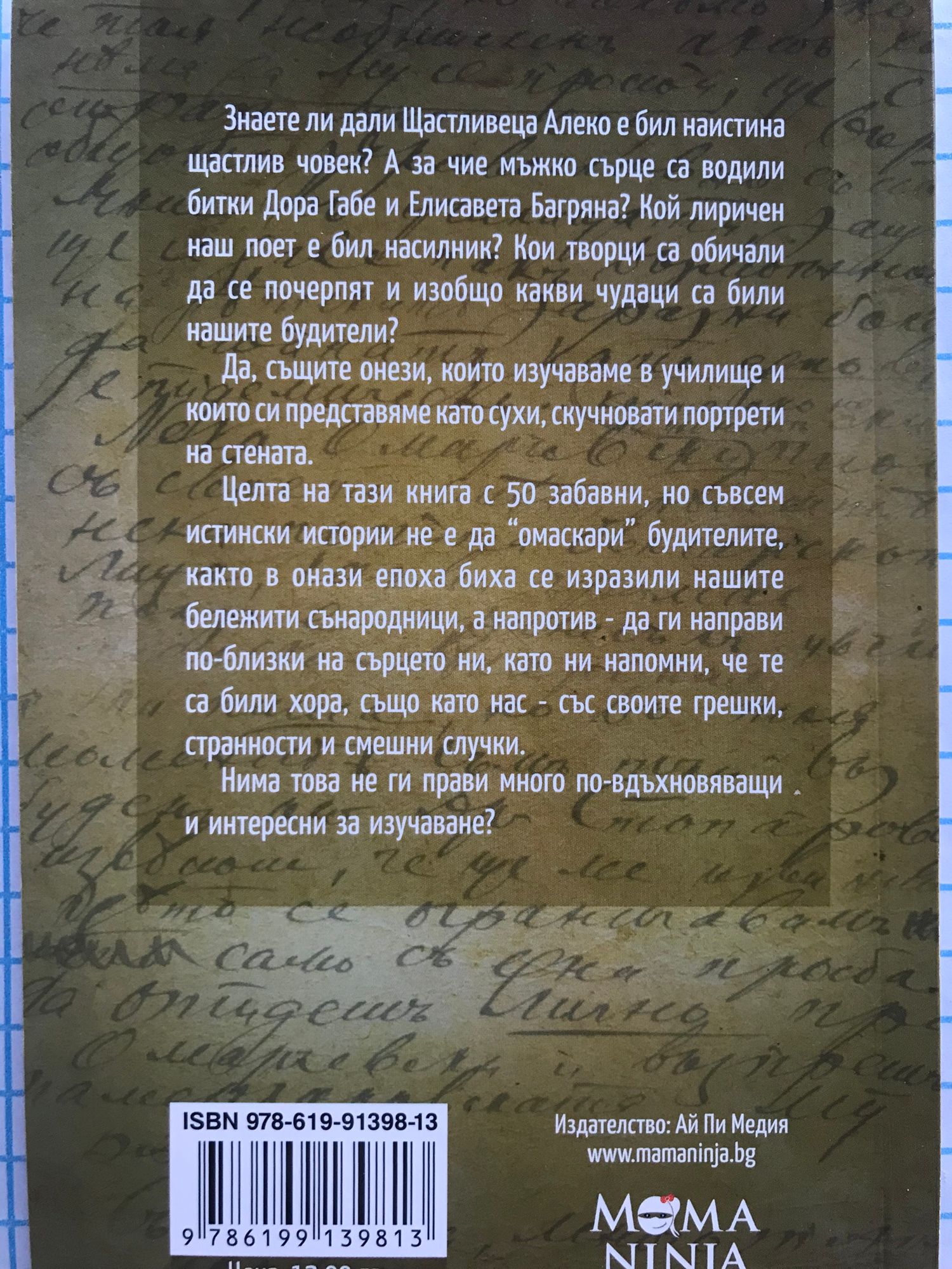 Знаете ли дали Щастливеца Алеко е бил наистина щастлив човек? А за чие мъжко сърце са водили битки Дора Габе и Елисавета Багряна? Кой лиричен наш поет е бил насилник? Кои творци са обичали да се почерпят и изобщо какви чудаци са били нашите будители? Да, същите онези, които изучаваме в училище и които си представяме като сухи, скучновати портрети на стената. Целта на тази книга с 50 забавни, но съвсем истински истории не е да “омаскари” (както в онази епоха биха се изразили) нашите бележити сънародници, а напротив - да ги направи по-близки на сърцето ни, като ни напомни, че те са били хора, също като нас - със своите грешки, странности и смешни случки.