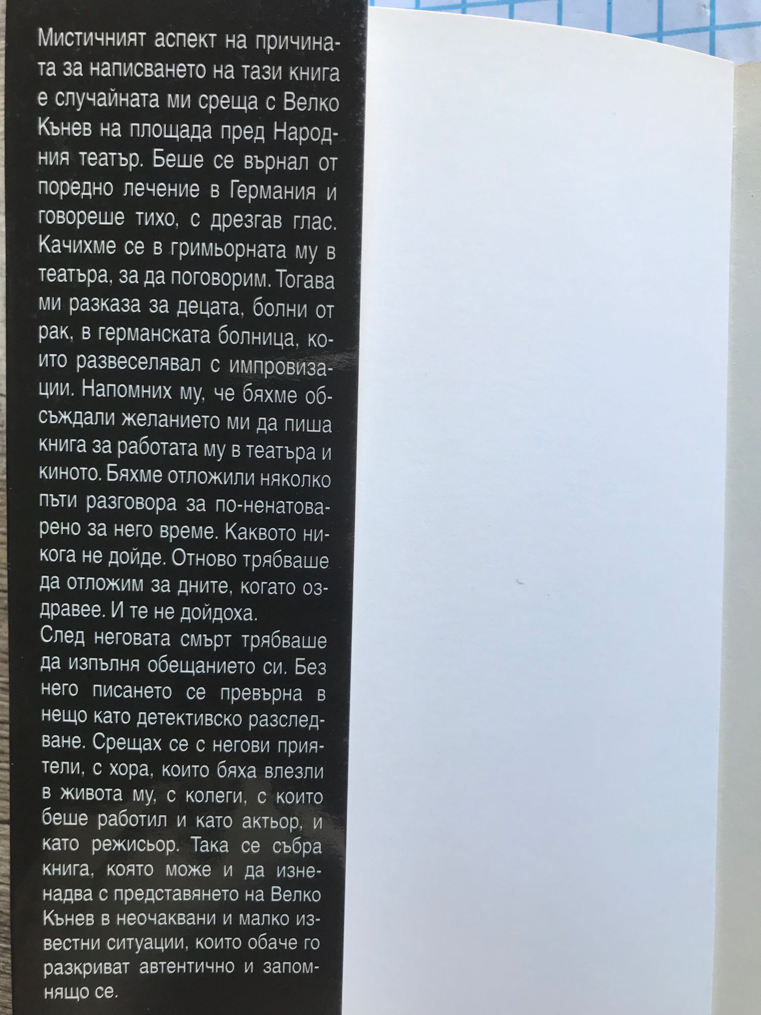 Мистичният аспект на причината за написването на тази книга е случайната ми среща с Велко Кънев на площада пред Народния театър. Беше се върнал от поредно лечение в Германия и говореше тихо с дрезгав глас. Качихме се в гримьорната му в театъра, за да поговорим. Тогава ми разказа за децата, болни от рак в германската болница, които развеселявал с импровизации. Напомних му, че бяхме обсъждали желанието ми да пиша книга за работата му в театъра и киното. Бяхме отложили няколко пъти разговора за по-ненатоварено за него време. Каквото никога не дойде. Отново трябваше да отложим за дните, когато оздравее. И те не дойдоха. След неговата смърт трябваше да изпълня обещанието си. Без него писането се превърна в нещо като детективско разследване. Срещах се с негови приятели, с хора, които бяха влезли в живота му, с колеги, с които беше работил и като актьор, и като режисьор. Така се събра книга, която може и да изненадва с представянето на Велко Кънев в неочаквани и малко известни ситуации, които обаче го разкриват автентично и запомнящо се.