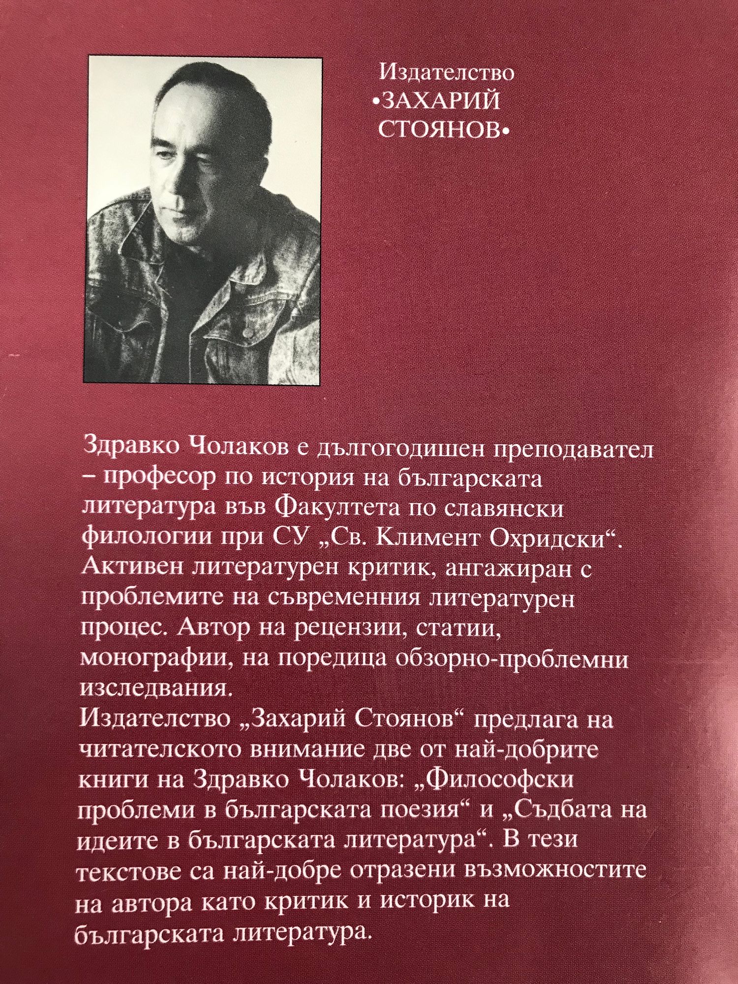 Здравко Чолаков е дългогодишен преподавател - професор по история на българската литература във Факултета по славянски филологии при СУ "Св. Климент Охридски". Активен литературен критик, ангажиран с проблемите на съвременния литературен процес. Автор на рецензии, статии, монографии, на поредица обзорно-проблемни изследвания. Издателство "Захарий Стоянов" предлага на читателското внимание две от най-добрите книги на автора: "Философски проблеми в българската поезия" и "Съдбата на идеите в българската литература". В тези текстове са най-добре отразени възможностите на автора като критик и историк на българската литература.