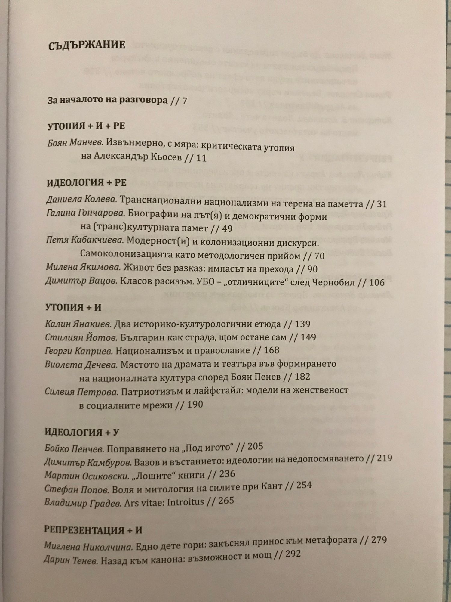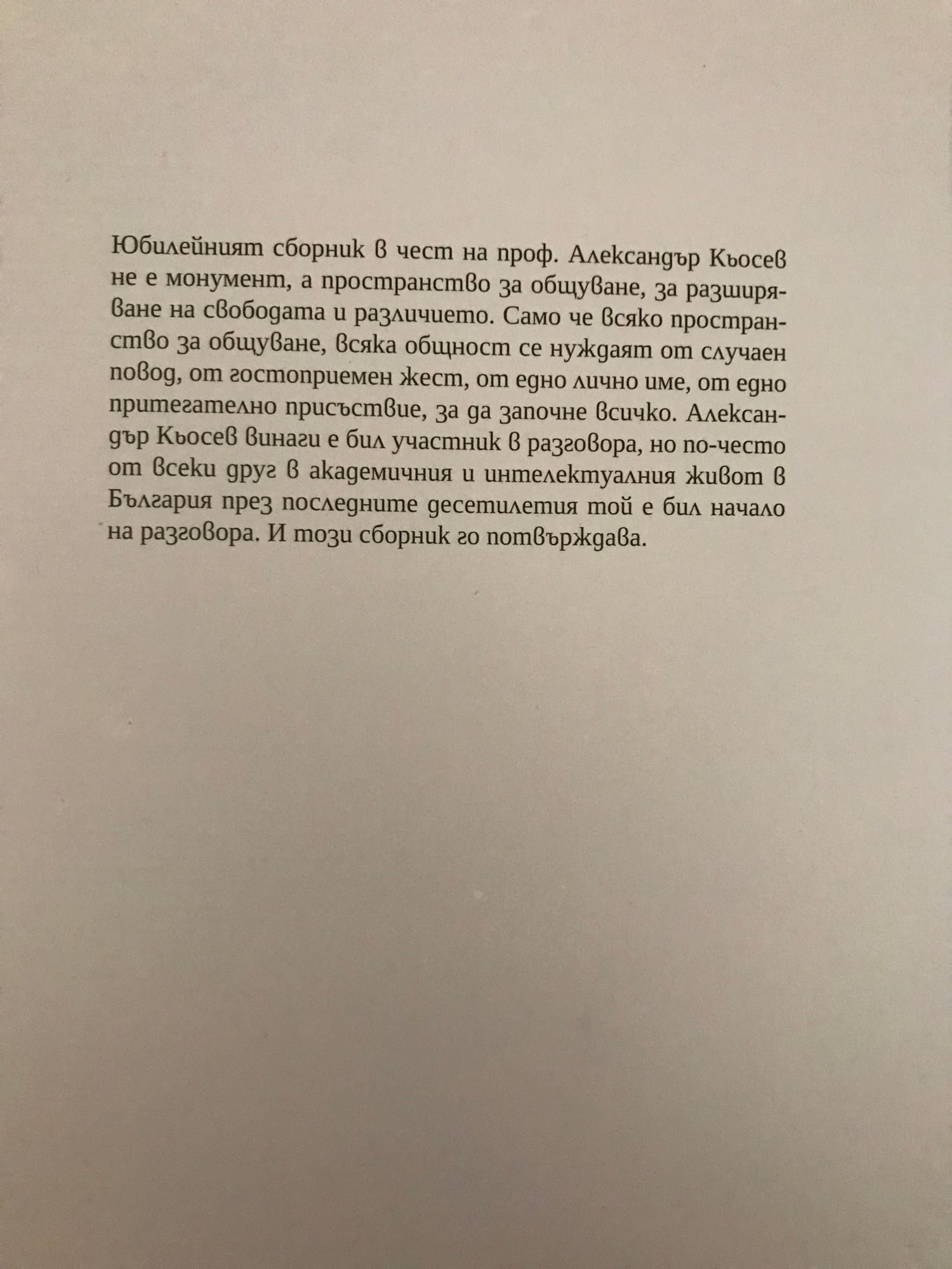 Юбилейният сборник в чест на проф. Александър Кьосев не е монумент, а пространство за общуване, за разширяване на свободата и различието. Само че всяко пространство за общуване, всяка общност се нуждаят от случаен повод, от гостоприемен жест, от едно лично име, от едно притегателно присъствие, за да започне всичко. Александър Кьосев винаги е бил участник в разговора, но по-често от всеки друг в академичния и интелектуалния живот в България през последните десетилетия той е бил начало на разговора. И този сборник го потвърждава.