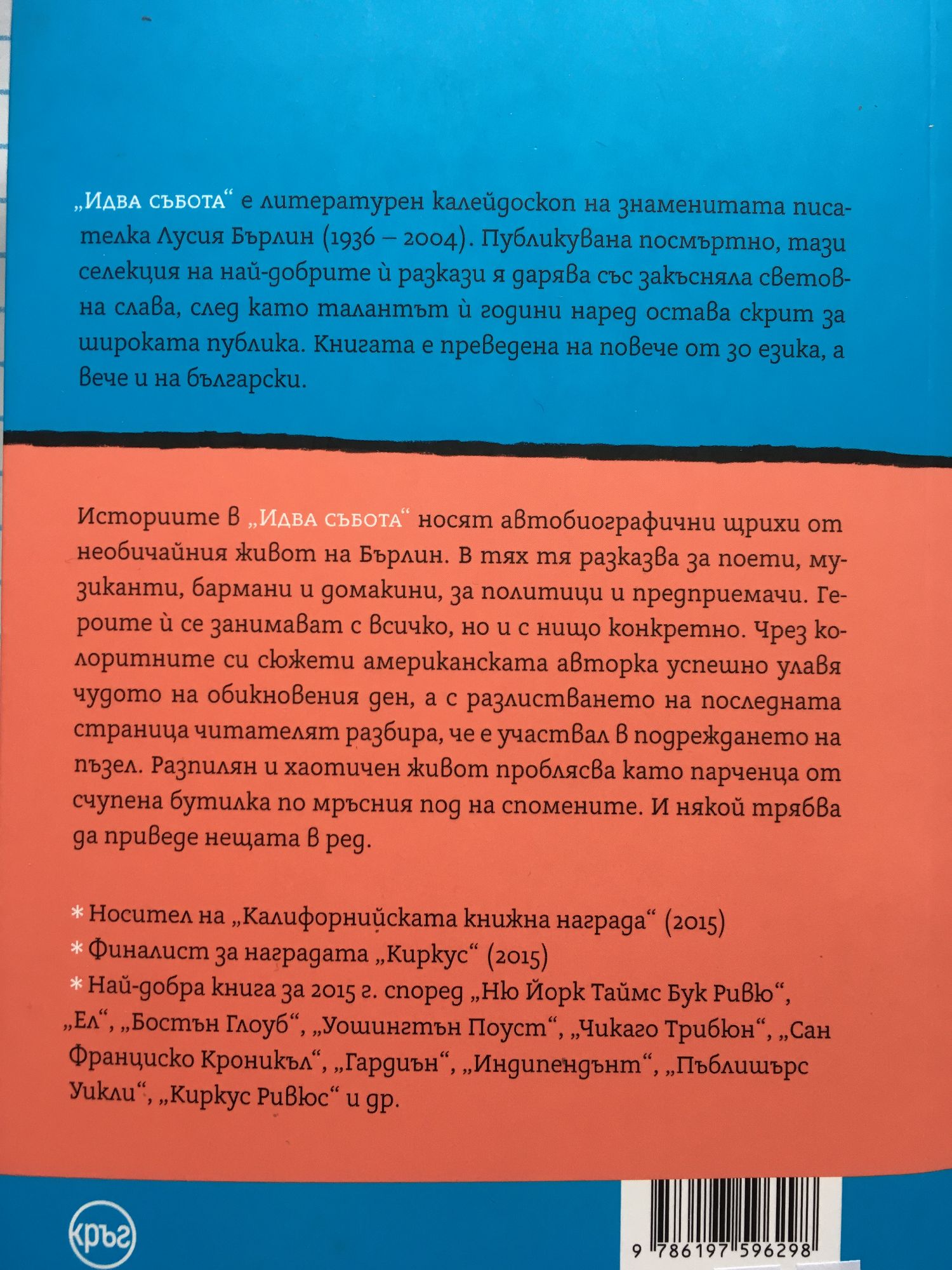 „Идва събота“ е литературен калейдоскоп на знаменитата писателка Лусия Бърлин (1936 – 2004). Публикувана посмъртно, тази селекция на най-добрите й разкази я дарява със закъсняла световна слава, след като талантът й години наред остава скрит за широката публика. Книгата е преведена на повече от 30 езика, а вече и на български. Историите в „Идва събота“ носят автобиографични щрихи от необичайния живот на Бърлин. В тях тя разказва за поети, музиканти, бармани и домакини, за политици и предприемачи. Героите ? се занимават с всичко, но и с нищо конретно. Чрез колоритните си сюжети американската авторка успешно улавя чудото на обикновения ден, а с разлистването на последната страница читателят разбира, че е участвал в подреждането на пъзел. Разпилян и хаотичен живот проблясва като парченца от счупена бутилка по мръсния под на спомените. И някой трябва да приведе нещата в ред. * Носител на „Калифорнийската книжна награда“ (2015) * Финалист за наградата „Киркус“ (2015) * Най-добра книга за 2015 г. според „Ню Йорк Таймс Бук Ривю„, „Ел“, „Бостън Глоуб“, „Уошингтън Поуст“, „Чикаго Трибюн“, „Сан Франциско Хроникъл“, „Гардиън“, „Индипендънт“, „Пъблишърс Уикли“, „Киркус Ревюс“ и др.