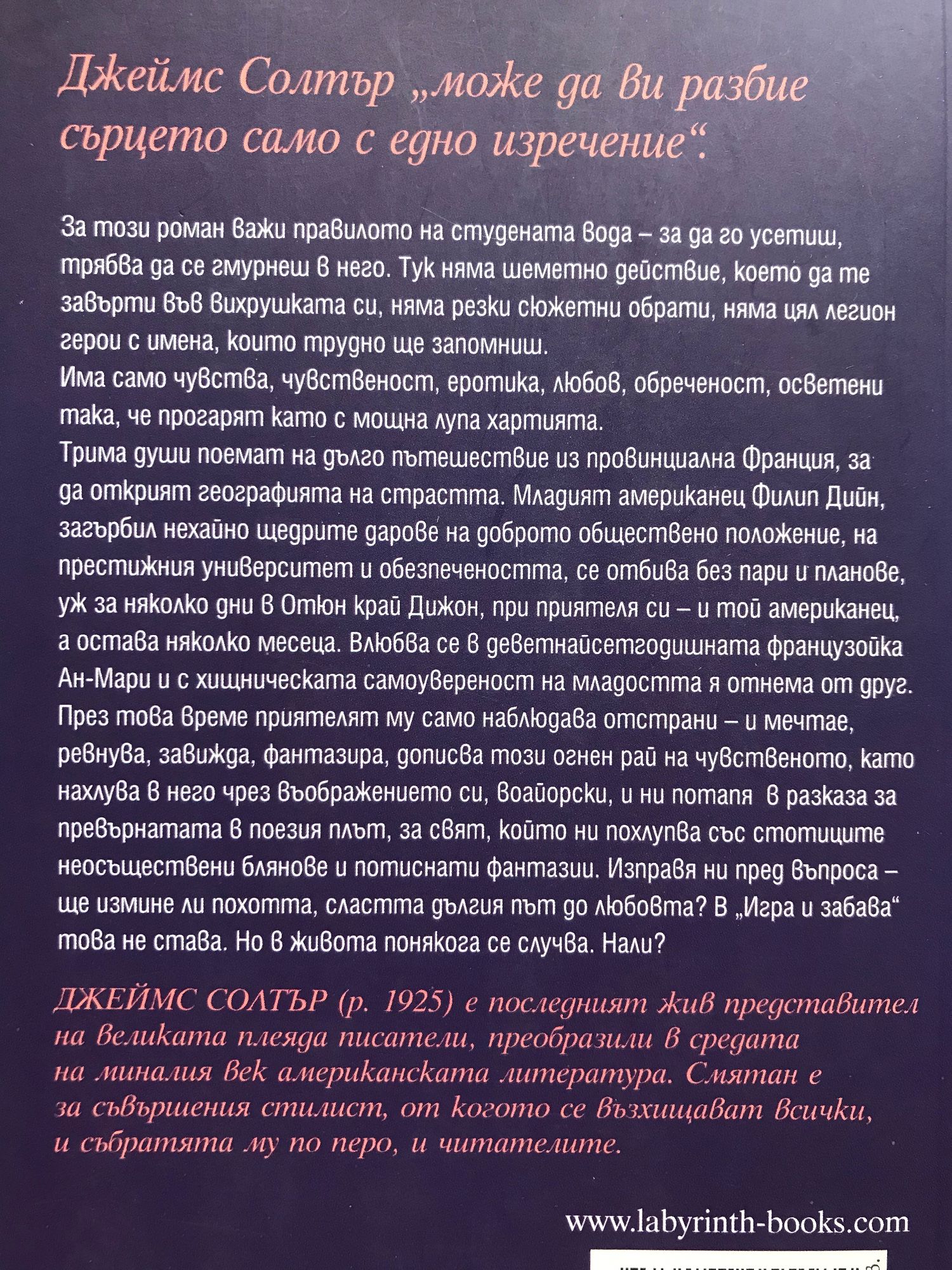 За този роман важи правилото на студената вода - за да го усетиш, трябва да се гмурнеш в него. Тук няма шеметно действие, което да те завърти във вихрушката си, няма резки сюжетни обрати, няма цял легион герои с имена, които трудно ще запомниш. Има чувства, чувственост, еротика, любов, обреченост, осветени така, че прогарят като с мощна лупа хартията. Трима души поемат на дълго пътешествие из провинциална Франция, за да открият географията на страстта. Младият американец Филип Дийн, загърбил нехайно щедрите дарове на доброто обществено положение, на престижния университет и обезпечеността, се отбива без пари и планове, уж за няколко дни в Отюн край Дижон, при приятеля си - и той американец, а остава няколко месеца. Влюбва се в деветнайсетгодишната французойка Ан-Мари и с хищническата самоувереност на младостта я отнема от друг. През това време приятелят му само наблюдава отстрани - и мечтае, ревнува, завижда, фантазира, дописва този огнен рай на чувственото, като нахлува в него чрез въображението си, воайорски, и ни потапя в разказа за превърнатата в поезия плът, за свят, който ни похлупва със стотиците неосъществени блянове и потиснати фантазии. Изправя ни пред въпроса - ще измине ли похотта, сластта дългия път до любовта? В "Игра и забава" това не става. Но в живота понякога се случва. Нали?