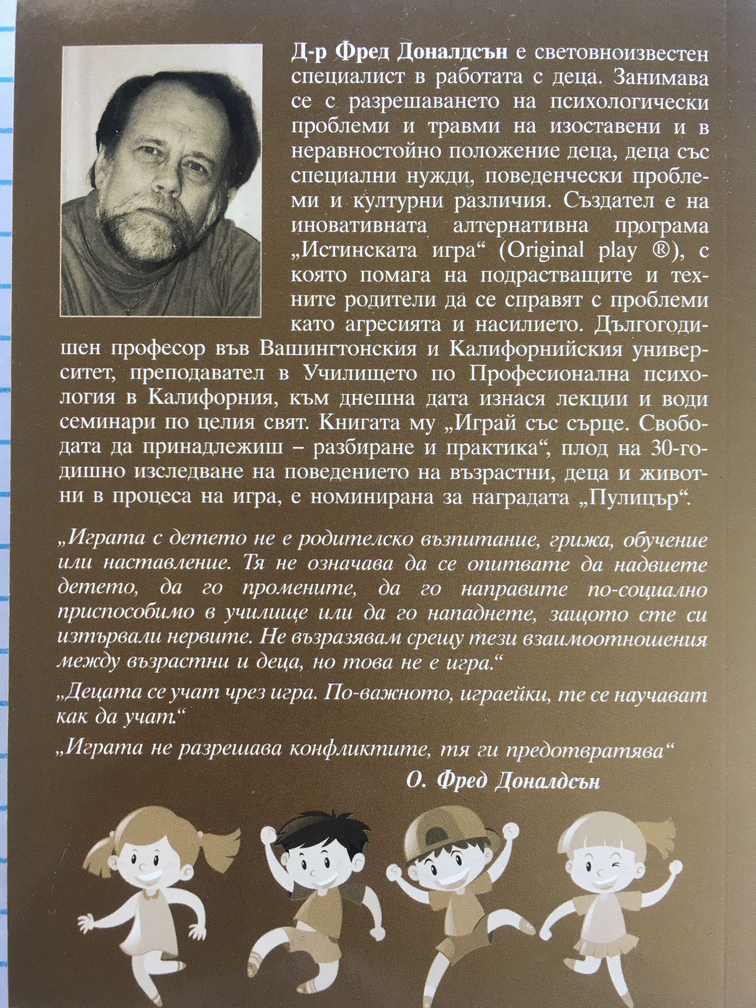 В „Играй със сърце“ един възрастен се обяснява в любов на детето, което някога е бил. Един професор с множество титли ляга на пода и изучава смисъла на детството и играта – вън от културните обременености и норми. Играта е разгледана в универсалния си смисъл, като акт на близост и любов, като един общ език, на който децата с лекота общуват. Като един надрасов и културен код, обединяващ, а не разделящ хората. В днешно време на играта не се гледа като акт на близост, възприемана е като изискване - учене на децата как да бъдат възрастни, директна подготовка за големия живот. Детството е откраднато, а играта отдавна не е свобода – тя е забрана. „Не играй с този или онзи, не играй така, играй по-тихо, играй иначе. Направо – по-добре не играй.“ Колко е важно да не забравяме да играем с децата си, ни напомня доктор Фред Доналдсън. Разбирането на играта като загуба на време, като детинщина, с която не си заслужава един възрастен да се занимава, е път към загубата на човешкото, на основните ни ценности. Загуба на искреността и обичта, които, макар понякога отдавна закърнели, всички имаме дълбоко в себе. Когато възрастните обещаят на децата да си поиграят с тях и след това кажат „Не сега. Нямам време. Хайде друг път“, тази връзка започва да изтънява, докато накрая съвсем прекъсне. Детето започва да свързва играта с нещо, което не му носи наслада, а разочарование, и накрая спира да търси близост с родителя. Отчуждава се. Затвореността и притеснението да се впуснем в играта ни отдалечават едни от други. Правят ни хладни и ни карат да забравим какво е чувството на топлота и обич. В „Играй със сърце“ Фред Доналдсън не само посочва проблемите в отношенията между днешните възрастни и деца, но и дава отговори за разрешаването им. Откритостта, вниманието и отпускането на страха са първите стъпки към детето. Книгата е дълбоко философско и психологическо изследване на играта. Фред Доналдсън обединява в страниците си имената на Буда, Ганди, Свети Франциск от Азиси, Руми, Херман Хесе, Уилям Уърдсуърт, Карл Юнг, Луис Карол и Шекспир, цитирайки едни от най-великите им мисли, възхваляващи играта като извор на живот. „Играта не разрешава конфликтите, тя ги предотвратява.“ – Фред Доналдсън.