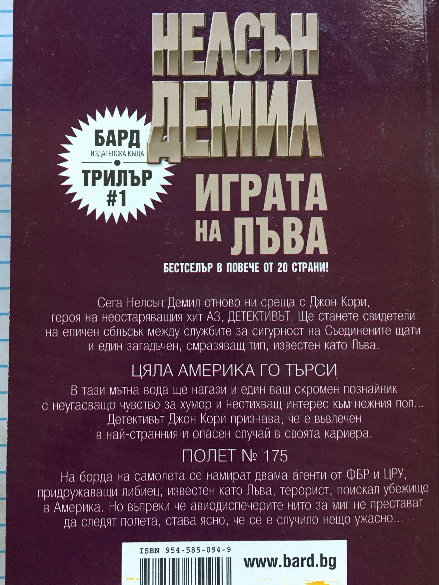 НАЙ-СТРАННИЯТ И НАЙ-ОПАСЕН СЛУЧАЙ В ИСТОРИЯТА НА АМЕРИКА... БЕСТСЕЛЪР В ПОВЕЧЕ ОТ 20 СТРАНИ! Нелсън Демил отново ни среща с Джон Кори, героя на неостаряващия хит АЗ, ДЕТЕКТИВЪТ. Ще станете свидетели на епичен сблъсък между службите за сигурност на Съединените щати и един загадъчен, смразяващ тип, известен като Лъва. ЦЯЛА АМЕРИКА ГО ТЪРСИ В тази мътна вода ще нагази и един ваш скромен познайник с неугасващо чувство за хумор и нестихващ интерес към нежния пол... Детективът Джон Кори признава, че е въвлечен в най-странния и опасен случай в своята кариера. ПОЛЕТ № 175 На борда на самолета се намират двама агенти от ФБР и ЦРУ, придружаващи либиец с прякор Лъва – терорист, поискал убежище в Америка. Но въпреки че авиодиспечерите нито за миг не престават да следят полета, става ясно, че се е случило нещо ужасно...