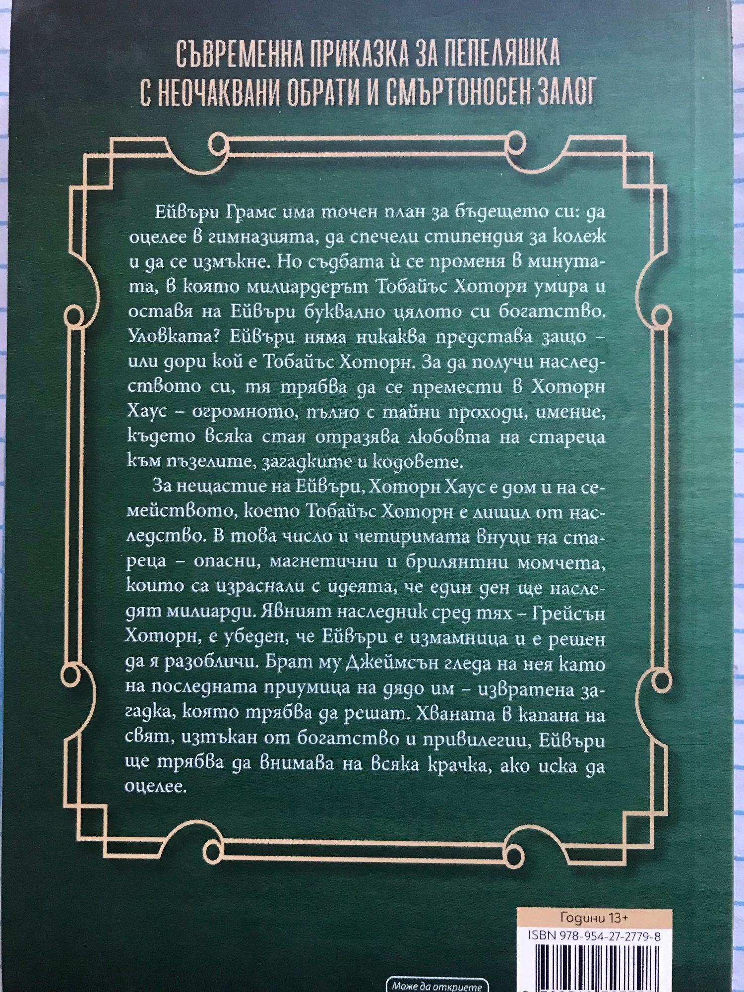Съвременна приказка за Пепеляшка с неочаквани обрати и смъртоносен залог Ейвъри Грамс има точен план за бъдещето си: да оцелее в гимназията, да спечели стипендия за колеж и да се измъкне. Но съдбата й се променя в минутата, в която милиардерът Тобайъс Хоторн умира и оставя на Ейвъри буквално цялото си богатство. Уловката? Ейвъри няма никаква представа защо – или дори кой е Тобайъс Хоторн. За да получи наследството си, тя трябва да се премести в Хоторн Хаус – огромното, пълно с тайни проходи, имение, където всяка стая отразява любовта на стареца към пъзелите, загадките и кодовете. За нещастие на Ейвъри, Хоторн Хаус е дом и на семейството, което Тобайъс Хоторн е лишил от наследство. В това число и четиримата внуци на стареца – опасни, магнетични и брилянтни момчета, които са израснали с идеята, че един ден ще наследят милиарди. Явният наследник сред тях – Грейсън Хоторн, е убеден, че Ейвъри е измамница и е решен да я разобличи. Брат му Джеймсън гледа на нея като на последната приумица на дядо им – извратена загадка, която трябва да решат. Хваната в капана на свят, изтъкан от богатство и привилегии, Ейвъри ще трябва да внимава на всяка крачка, ако иска да оцелее.