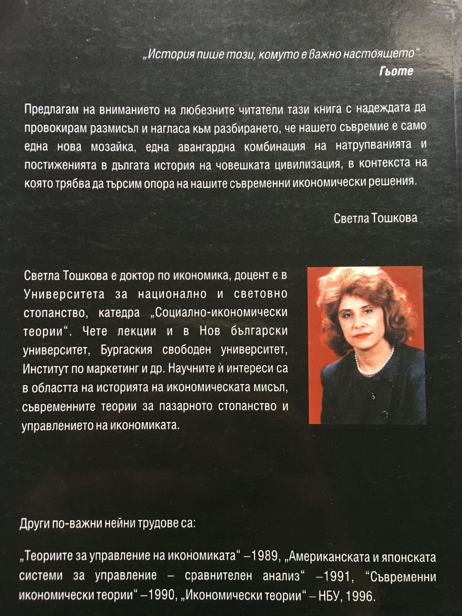 Предлагам на вниманието на читателите тази книга с надеждата да провокирам размисъл и нагласа към разбирането, че нашето съвремие е само една мозайка, една авангардна комбинация на натрупванията и постиженията в дългата история на човешката цивилизация, в контекста на която трябва да търсим опора на нашите съвременни икономически решения. Светла Тошкова