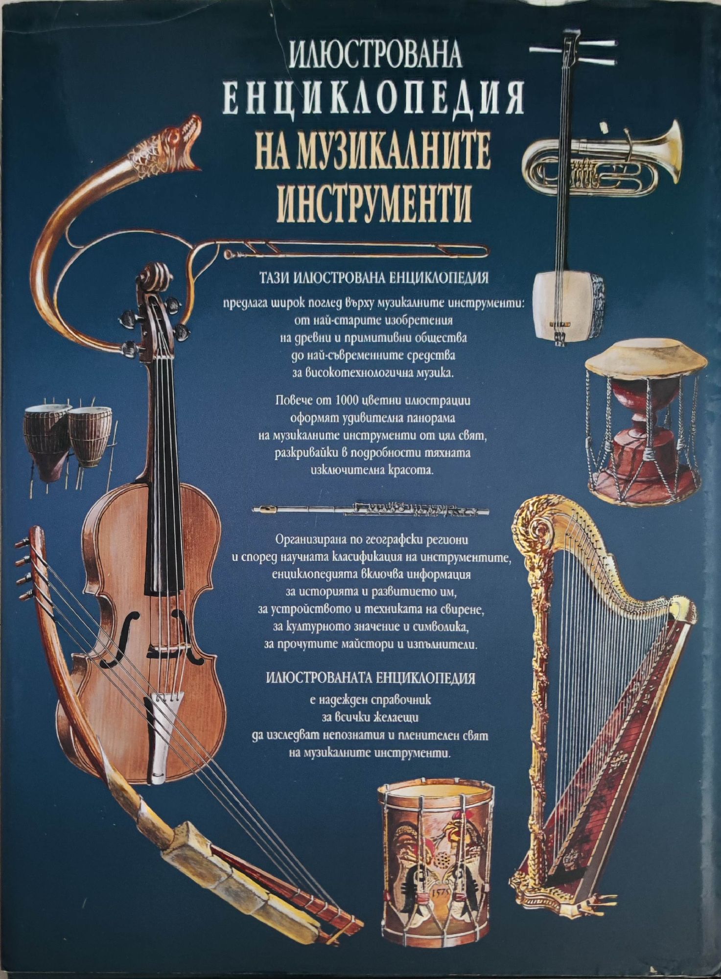 ТАЗИ ИЛЮСТРОВАНА ЕНЦИКЛОПЕДИЯ предлага широк поглед върху музикалните инструменти: от най-старите изобретения на древни и примитивни общества до най-съвременните средства за исокотехнологична музика. Повече от 1000 цветни илюстрации оформят удивителна панорама на музикалните инструменти от цял свят, разкривайки в подробности тяхната изключителна красота. Организирана по географски региони и според научната класификация на инструментите, енциклопедията включва информация за историята и развитието им, за устройството и техниката на свирене, за културното значение и символика, за прочутите майстори и изпълнители. ИЛЮСТРОВАНАТА ЕНЦИКЛОПЕДИЯ е надежден справочник за всички желаещи да изследват непознатия и пленителен свят на музикалните инструменти.