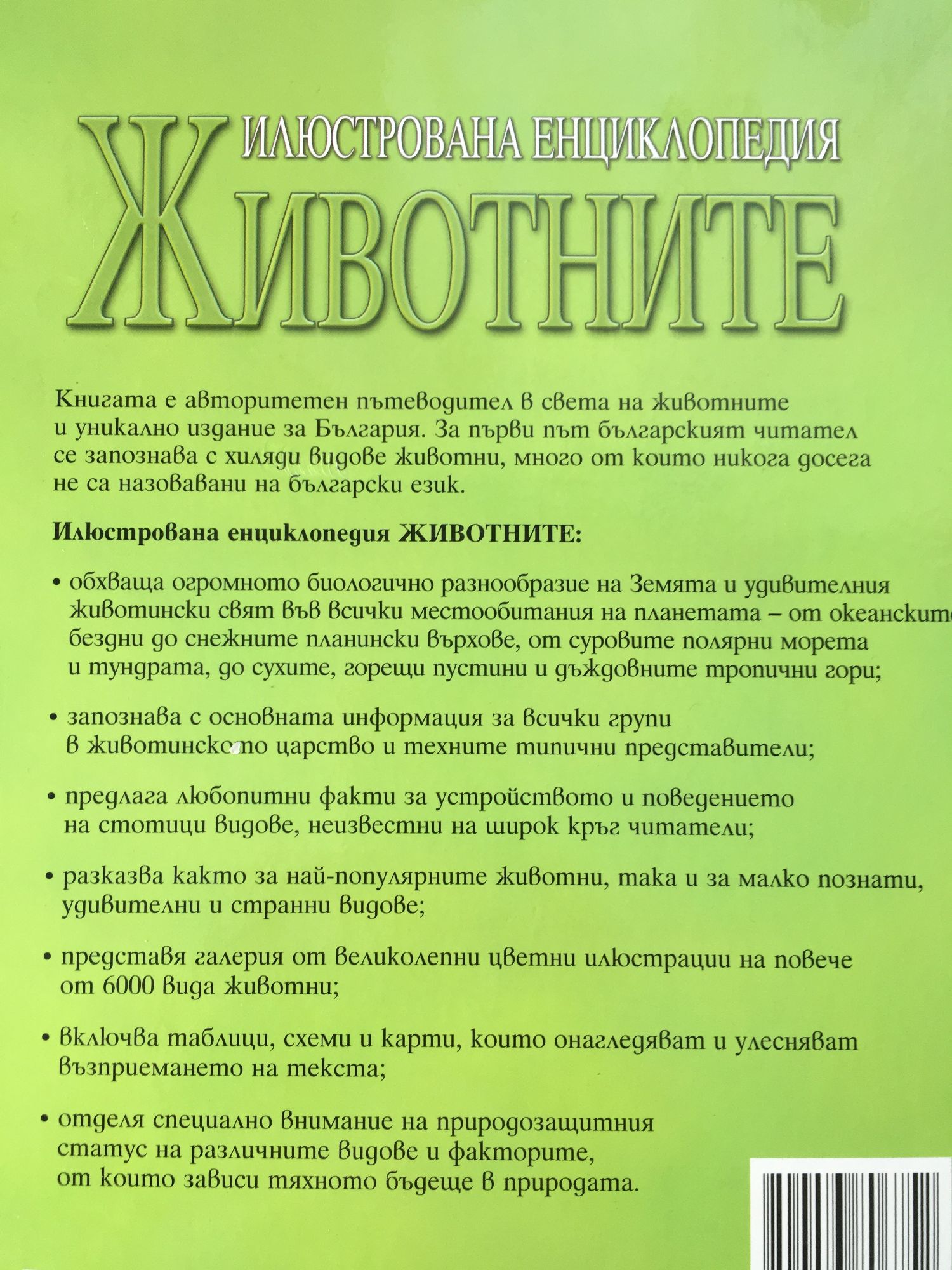 Илюстрована енциклопедия ЖИВОТНИТЕ е най-пълното издание до момента и обхваща огромното биологично разнообразие на Земята. Удивителният животински свят е представен във всички местообитания на планетата – от океанските бездни до снежните планински върхове, от суровите полярни морета и тундрата, до сухите, горещи пустини и дъждовните тропични гори. Илюстрованата енциклопедия съдържа галерия от великолепни цветни илюстрации на повече от 6000 животни. Тя запознава както с популярните видове, така и с малко познати, удивителни и странни представители на фауната.
