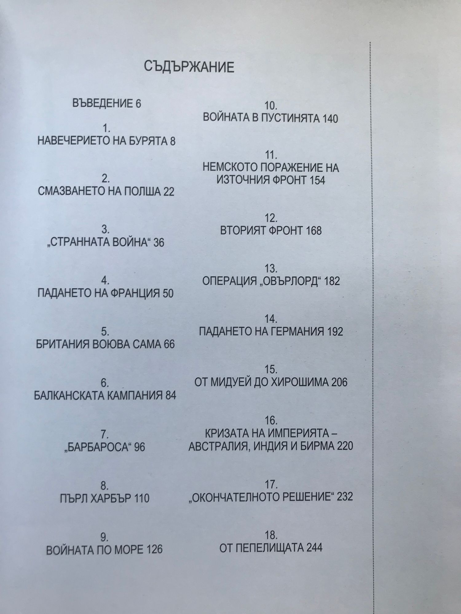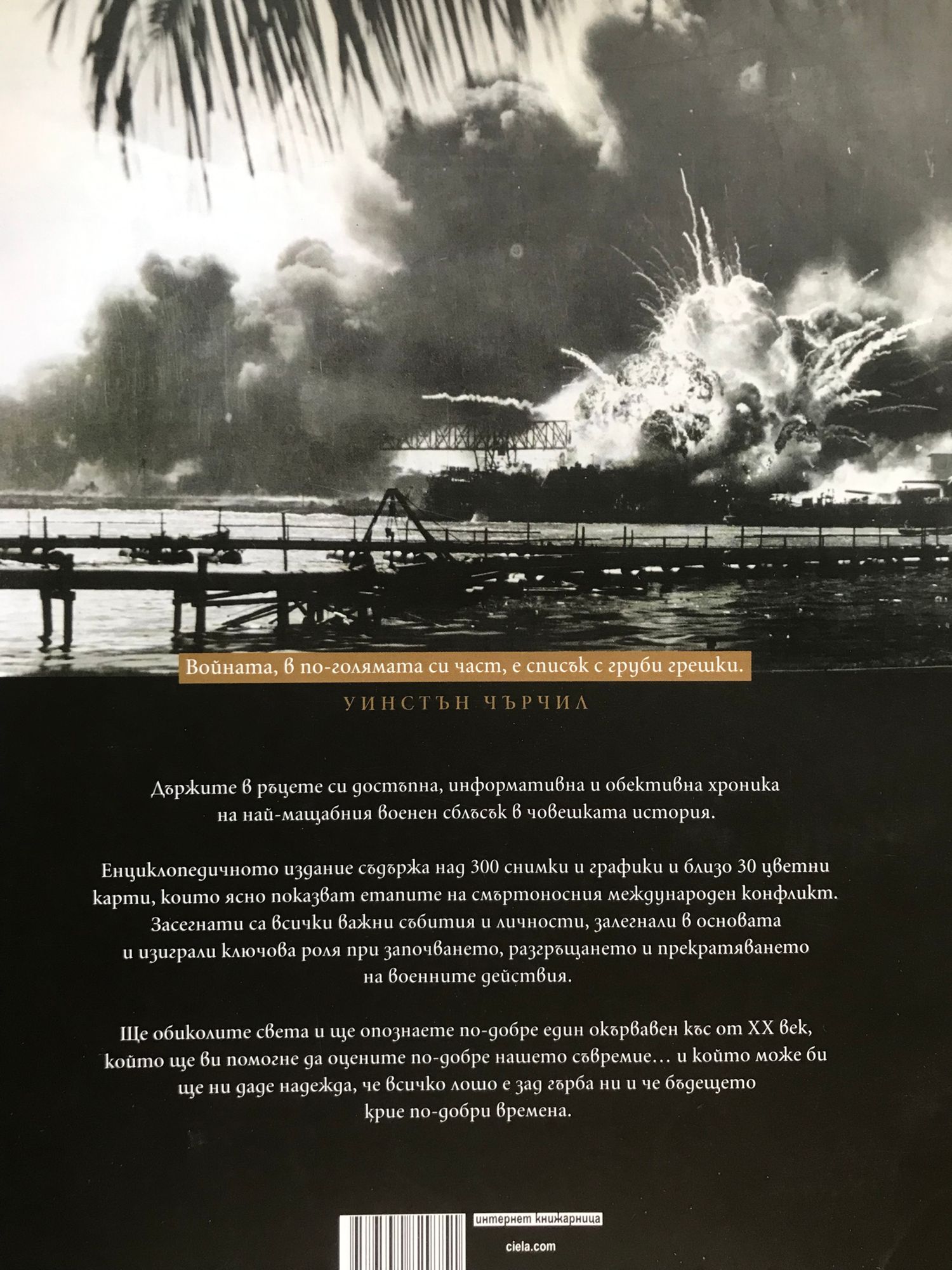 Войната, в по-голямата си част, е списък с груби грешки. Уинстън Чърчил Държите в ръцете си достъпна, информативна и обективна хроника на най-мащабния военен сблъсък в човешката история. Енциклопедичното издание съдържа над 300 снимки и графики и близо 30 цветни карти, които ясно показват етапите на смъртоносния международен конфликт. Засегнати са всички важни събития и личности, залегнали в основата и изиграли ключова роля при започването, разгръщането и прекратяването на военните действия. Ще обиколите света и ще опознаете по-добре един окървавен къс от XX век, който ще ви помогне да оцените по-добре нашето съвремие… и който може би ще ни даде надежда, че всичко лошо е зад гърба ни и че бъдещето крие по-добри времена.