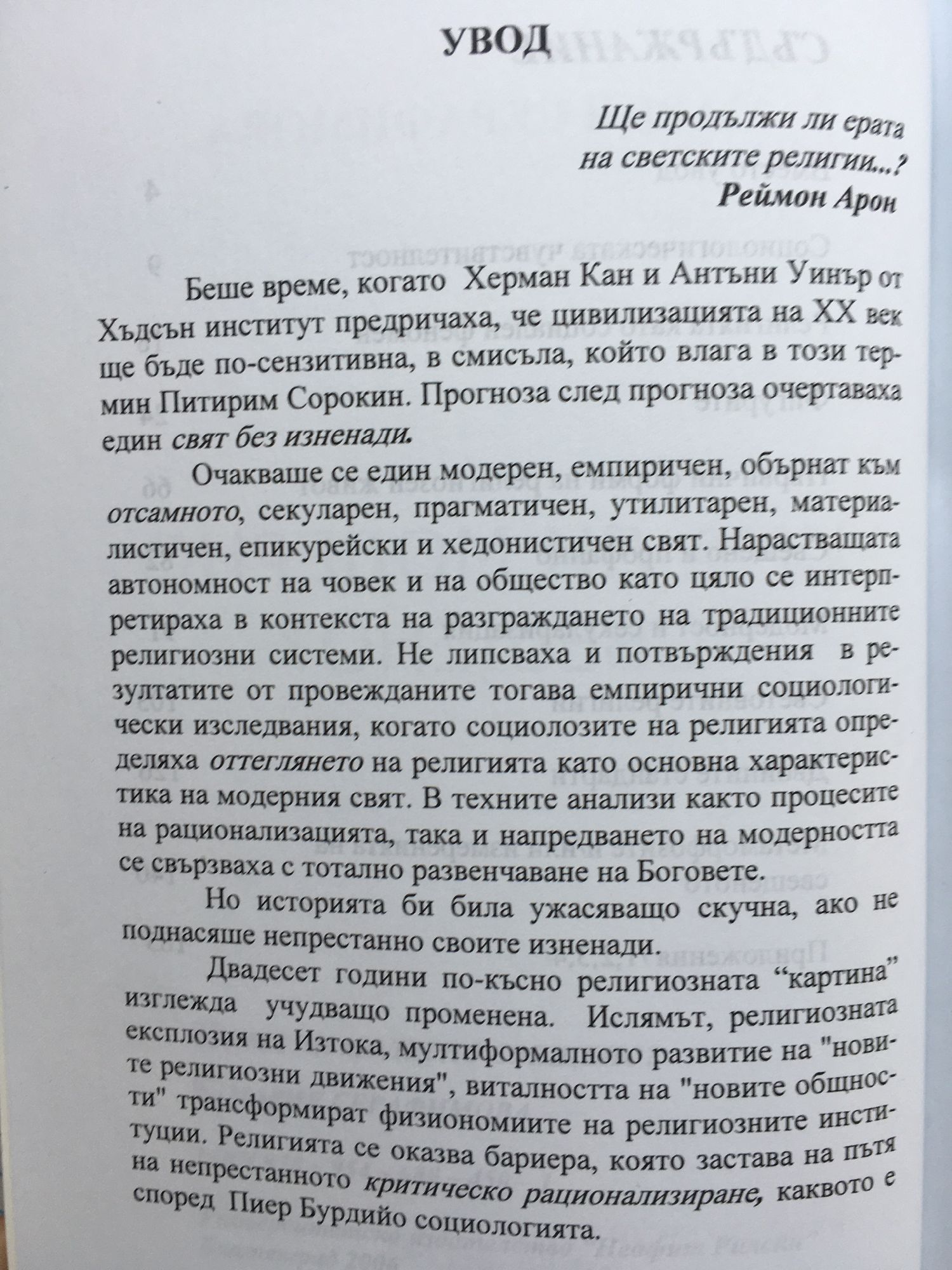 Няма нещо, което да не може да бъде превърнато в свещено и така да придобие в очите на хората несравним престиж. Чрез своеобразен бриколаж в модерното общество се създава религиозен инструментариум в отговор на въпроса: как това, което е, би могло да не бъде повече такова, каквото е било... Като чели в човешките представи свещеното – в класическите му форми, преминава на заден план. Съответно определението на модерното свещено се движи от виждането, че то е символна продукция на модерността до възприемането му като религиозно измерение на модерността. Като чели по-скоро от една лаическа сакралност модерните хора черпят сила за живот. В традиционните общества индивидът съществува единствено, доколкото заема своето място в дадена група, място, което му е отредено често по рождение чрез неговото раждане в определена социална йерархия. Той се подчинява на колективни вярвания, правила и норми, съществува в див свят на споделени от всички представи, които не се оспорват , защото идват “от горе” (трансцедентността основава социалната връзка) и “от преди” (митичното и ценно минало). Модерният религиозен човек е по-скоро един номад, който трудно определя своя път, защото повече пътува и често сменя своите места за живеене. Всеки е свободен да приеме и изостави онова символното съдържание на религиозните системи, което му допада, на него самия. Това е преход от световни религии към онова, което може да бъде определено като “индивидуална религия” т.е. към такъв тип религиозност, при която индивида конструира своя собствена смислова система. Подобен тип вярване се очертава като отличителен белег на модерните общества, в които се наблюдава коперникански обрат в религиозното съзнание. В центъра на моя изследователски интерес застава стремежът за свързване на модерната религиозност с неизчерпаемия свят, в който живеем, и в който по един или друг начин участваме. С други думи, това е опит за представяне на поредна социологическа перспектива към необятната сфера на религиозното.