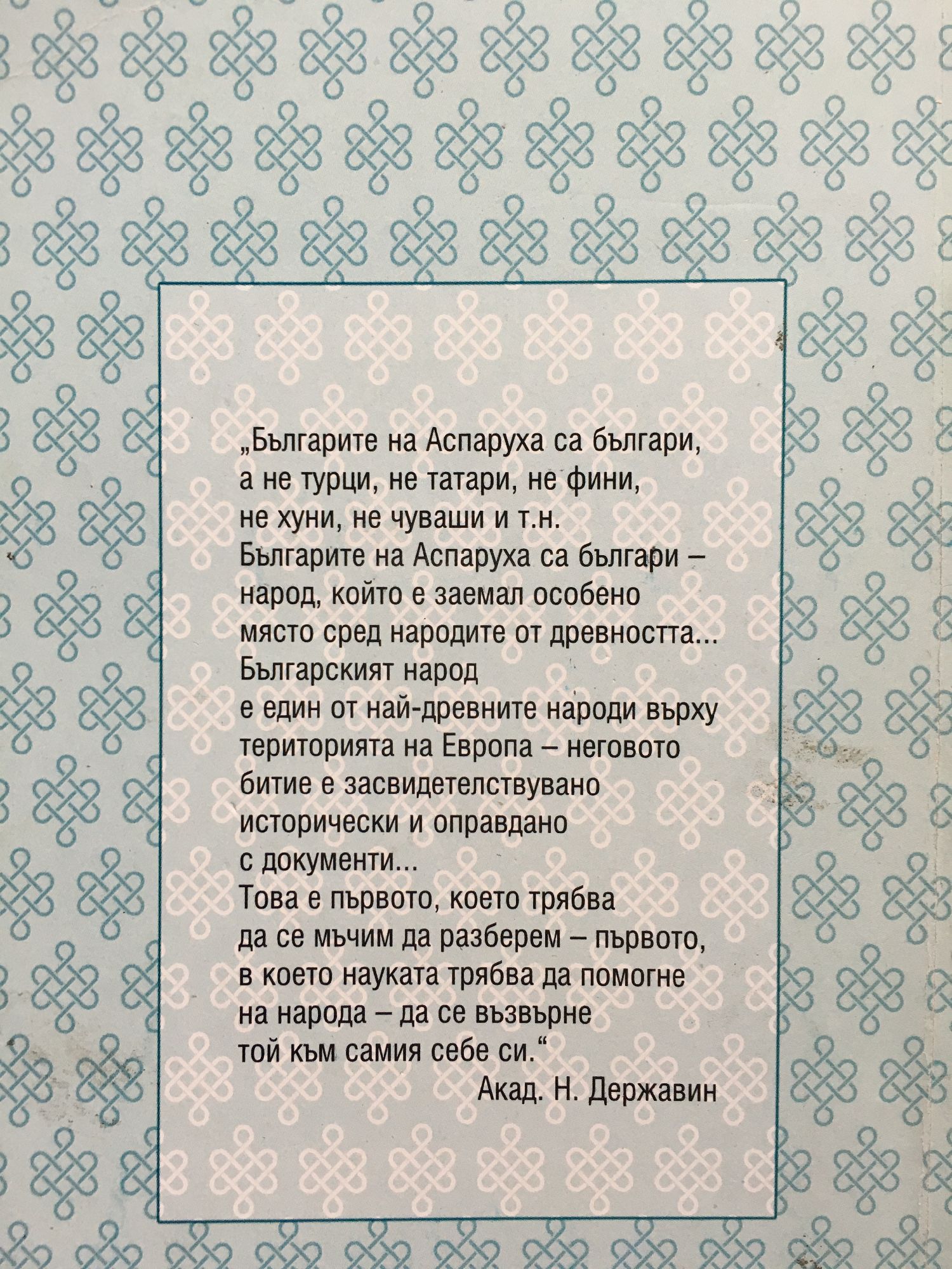 „Българите на Аспаруха са българи, а не турци, не татари, не фини, не хуни, не чуваши и т.н. Българите на Аспаруха са българи - народ, който е заемал особено място сред народите от древността… Българският народ е един от най-древните народи върху територията на Европа - неговото битие е засвидетелствувано исторически и оправдано с документи... Това е първото, което трябва да се мъчим да разберем - първото, в което науката трябва да помогне на народа - да се възвърне той към самия себе си." Акад. Н. Державин