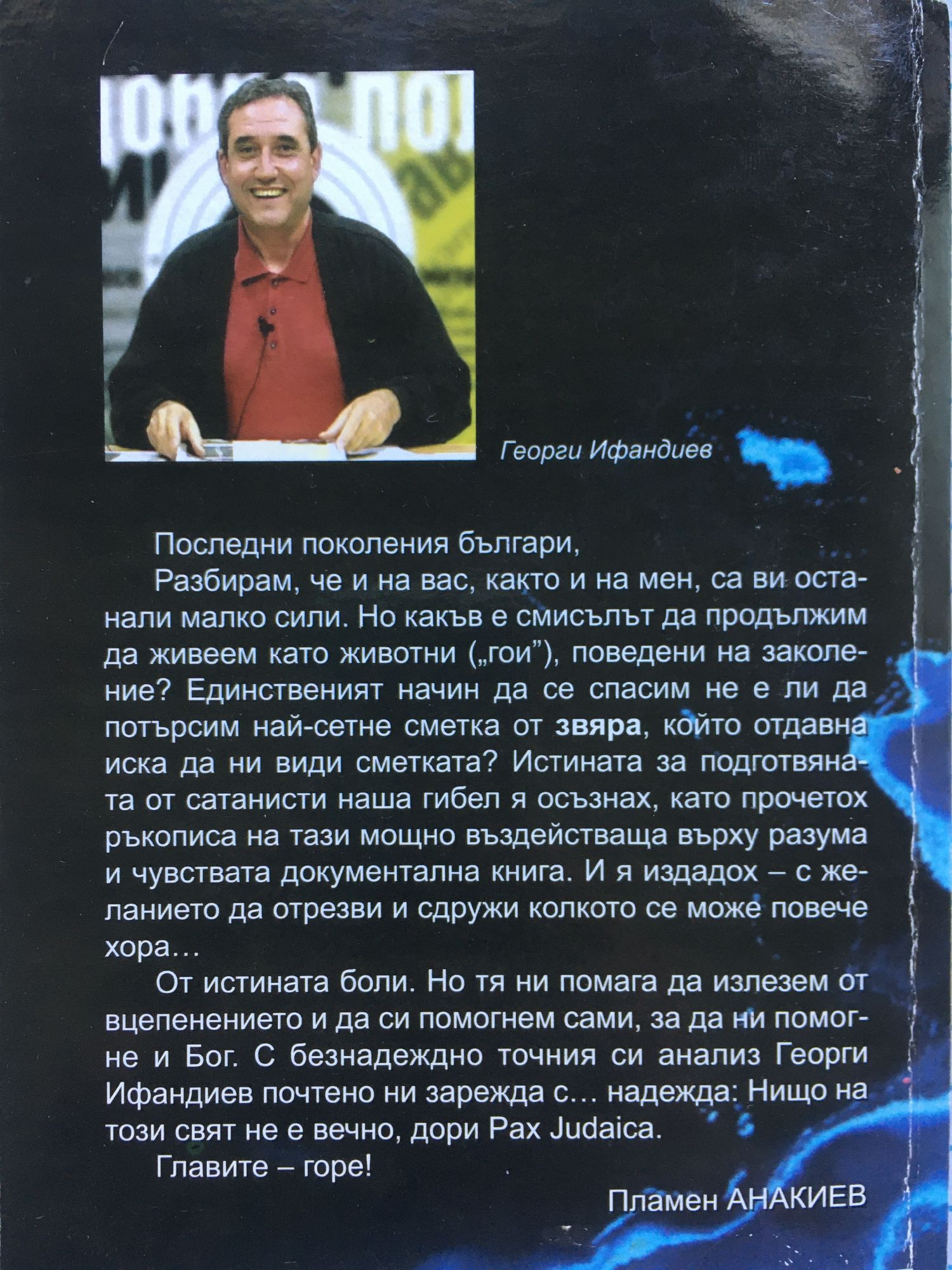 Последни поколения българи, Разбирам, че и на вас, както и на мен, са ви останали малко сили. Но какъв е смисълът да продължим да живеем като животни ('гои"), поведени на заколение? Единственият начин да се спасим не е ли да потърсим най-сетне сметка от звяра, който отдавна иска да ни види сметката? Истината за подготвяната от сатанисти наша гибел я осъзнах, като прочетох ръкописа на тази мощно въздействаща върху разума и чувствата документална книга. И я издадох - с желанието да отрезви и сдружи колкото се може повече хора... От истината боли. Но тя ни помага да излезем от вцепенението и да си помогнем сами, за да ни помогне и Бог. С безнадеждно точния си анализ Георги Ифандиев почтено ни зарежда с... надежда: Нищо на този свят не е вечно, дори Pax Judaica. Главите - горе! Пламен Анакиев