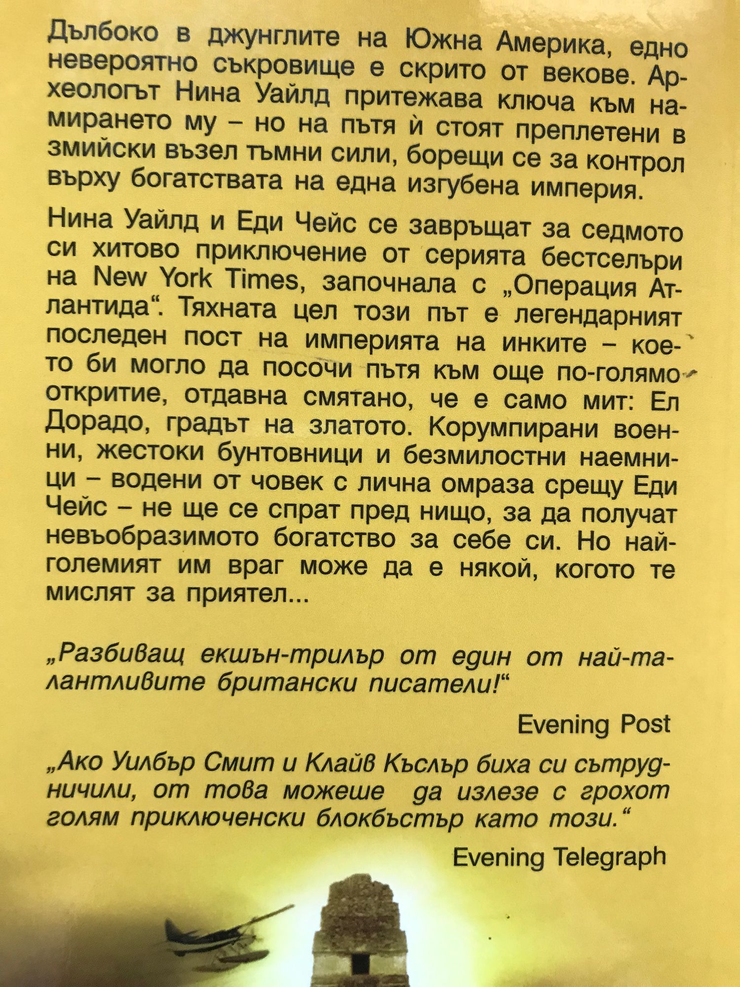 Дълбоко в джунглите на Южна Америка, едно невероятно съкровище е скрито от векове. Археологът Нина Уайлд притежава ключа към намирането му - но на пътя й стоят преплетени в змийски възел тъмни сили, борещи се за контрол върху богатствата на една изгубена империя. Нина Уайлд и Еди Чейс се завръщат за седмото си хитово приключение от серията бестселъри, започнала с "Операция Атлантида". Тяхната цел този път е легендарният последен пост на империята на инките - което би могло да посочи пътя към още по-голямо откритие, отдавна смятано, че е само мит: Ел Дорадо, градът на златото. Корумпирани военни, жестоки бунтовници и безмилостни наемници - водени от човек с лична омраза срещу Еди Чейс - не ще се спрат пред нищо, за да получат невъобразимото богатство за себе си. Но най-големият им враг може да е някой, когото те мислят за приятел...