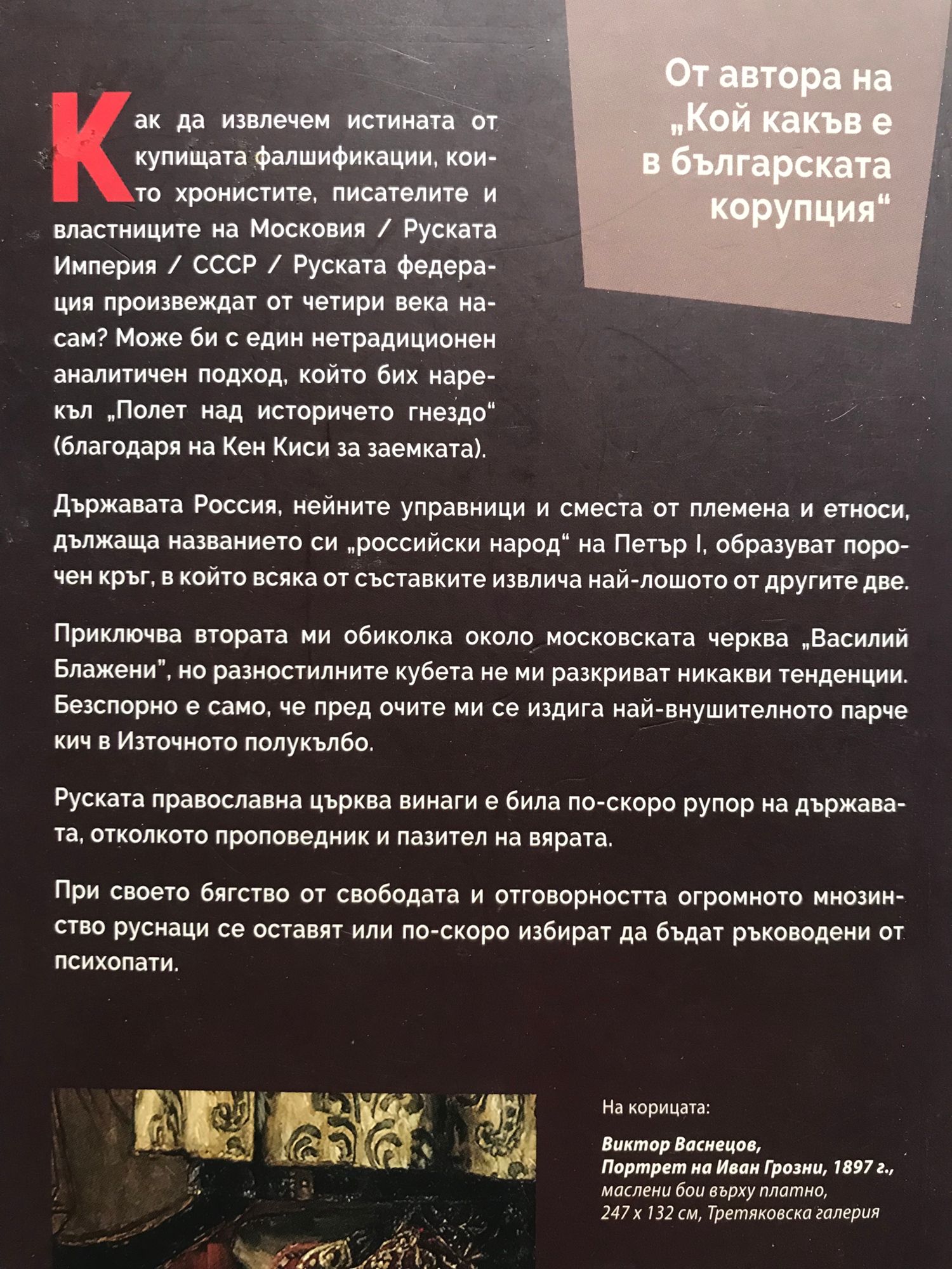 Как да извлечем истината от купищата фалшификации, които хронистите, писателите и властниците на Московия, Руската Империя, СССР, Руската федерация произвеждат от четири века насам? Може би с един нетрадиционен аналитичен подход, който бих нарекъл Полет над историчето гнездо (благодаря на Кен Киси за заемката). Държавата Россия, нейните управници и сместа от племена и етноси, дължаща названието си российски народ на Петър I, образуват порочен кръг, в който всяка от съставките извлича най-лошото от другите две. Приключва втората ми обиколка около московската черква Василий Блажени, но разностилните кубета не ми разкриват никакви тенденции. Безспорно е само, че пред очите ми се издига най-внушителното парче кич в Източното полукълбо. Руската православна църква винаги е била по-скоро рупор на държавата, отколкото проповедник и пазител на вярата. При своето бягство от свободата и отговорността огромното мнозинство руснаци се оставят или по-скоро избират да бъдат ръководени от психопати.