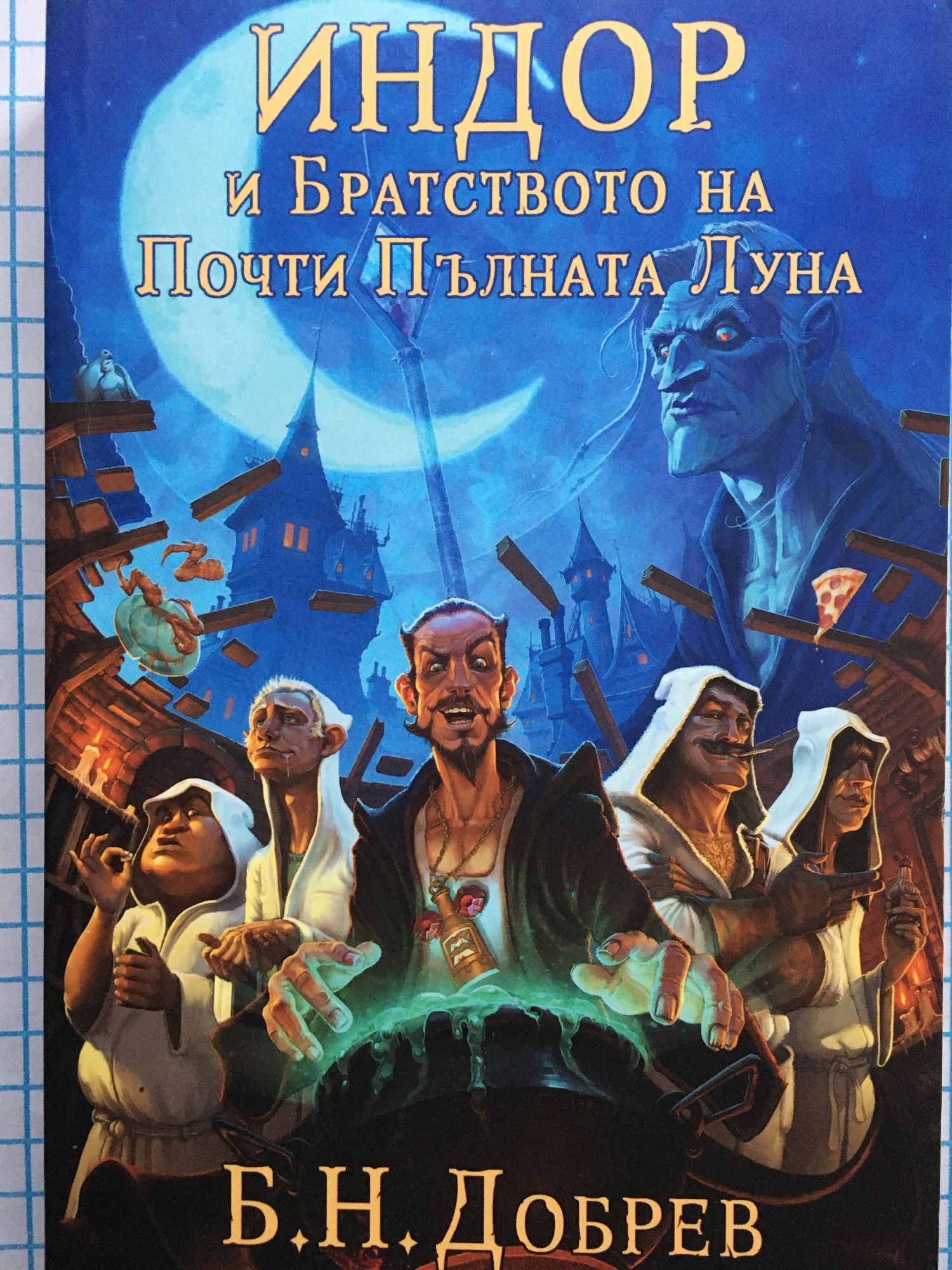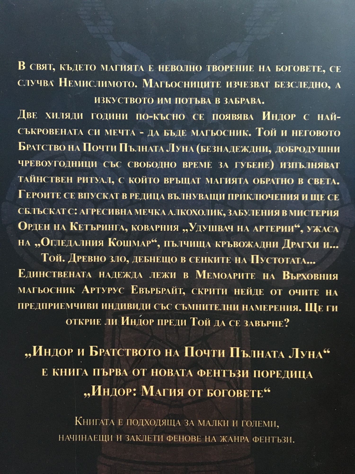 В свят, където магията е неволно творение на боговете, се случва Немислимото. Магьосниците изчезват безследно, а изкуството им потъва в забрава. Две хиляди години по-късно се появява Индор с най-съкровената си мечта - да бъде магьосник. Той и неговото Братство на Почти Пълната Луна (безнадеждни, добродушни, чревоугодници със свободно време за губене) изпълняват тайнствен ритуал, с който връщат магията обратно в света. Героите се впускат в редица вълнуващи приключения и ще се сблъскат с агресивна мечка алкохолик, забуления в мистерия Орден на кетъринга, коварния "Удушвач на артерии", ужаса на "Огледалния Кошмар", пълчища кръвожадни Драгхи и... Той. Древно, зло дебнещо в сенките на Пустотата... Единствената надежда лежи в Мемоарите на Върховния магьосник Артурус Евърбрайт, скрити нейде от очите на предприемчиви индивиди със съмнителни намерения. Ще ги открие ли Индор преди Той да се завърне? "Индор и Братството на Почти Пълната Луна" е книга първа от новата фентъзи поредица "Индор: Магия от боговете".