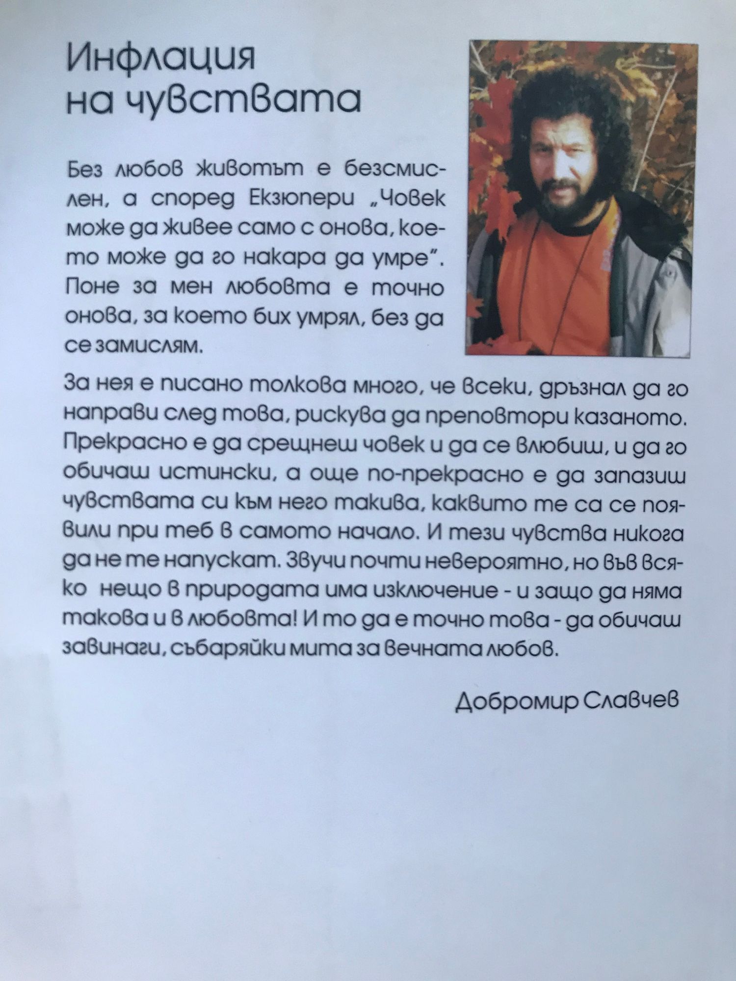 Без любов животът е безсмислен, а според Екзюпери "Човек може да живее само с онова, което може да го накара да умре". Поне за мен любовта е точно онова, за което бих умрял, без да се замислям. За нея е писано толкова много, че всеки, дръзнал да го направи след това, рискува да преповтори казаното, прекрасно е да срещнеш човек и да се влюбиш, и да го обичаш истински, а още по-прекрасно е да запазиш чувствата си към него такива, каквито те са се появили при теб в самото начало. И тези чувства никога да не те напускат. Звучи почти невероятно, но във всяко нещо в природата има изключение - и защо да няма такова и в любовта. И то да е точно това - да обичаш завинаги, събаряйки мита за вечната любов. /Добромир Славчев/