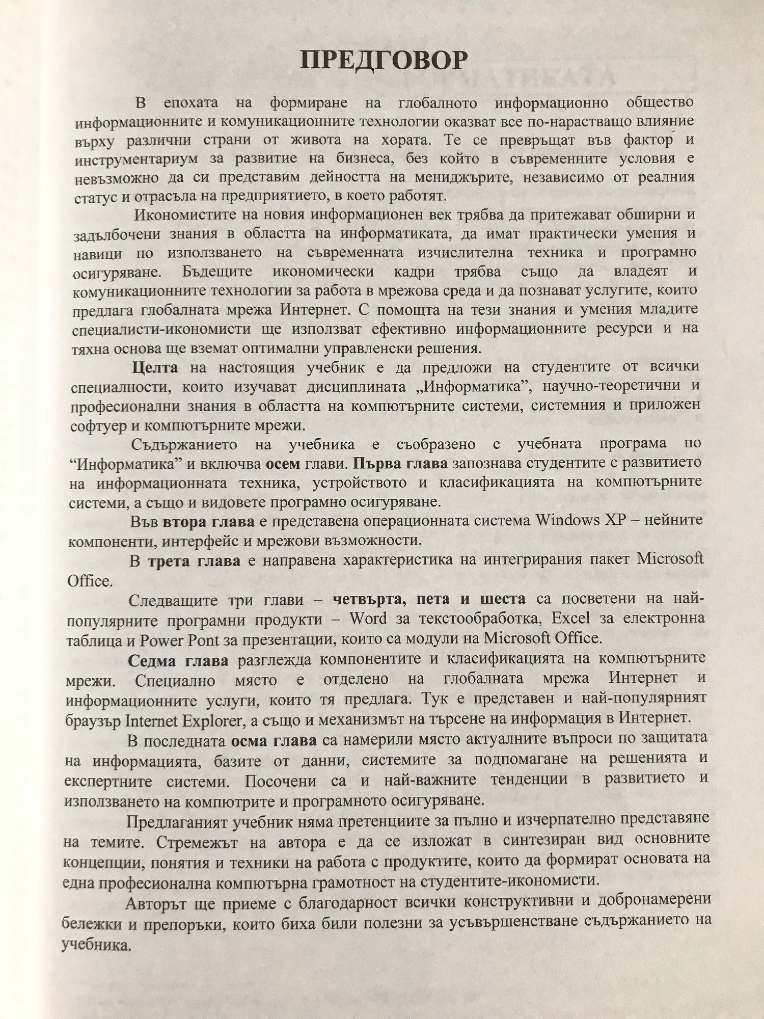 Целта на настоящия учебник е да предложи на студентите от всички специалности, които изучават дисциплината "Информатика", научно-теоретични и професионални знания в областта на компютърните системи, системния и приложен софтуер и компютърните мрежи. Съдържанието на учебника е съобразено с учебната програма по "Информатика".