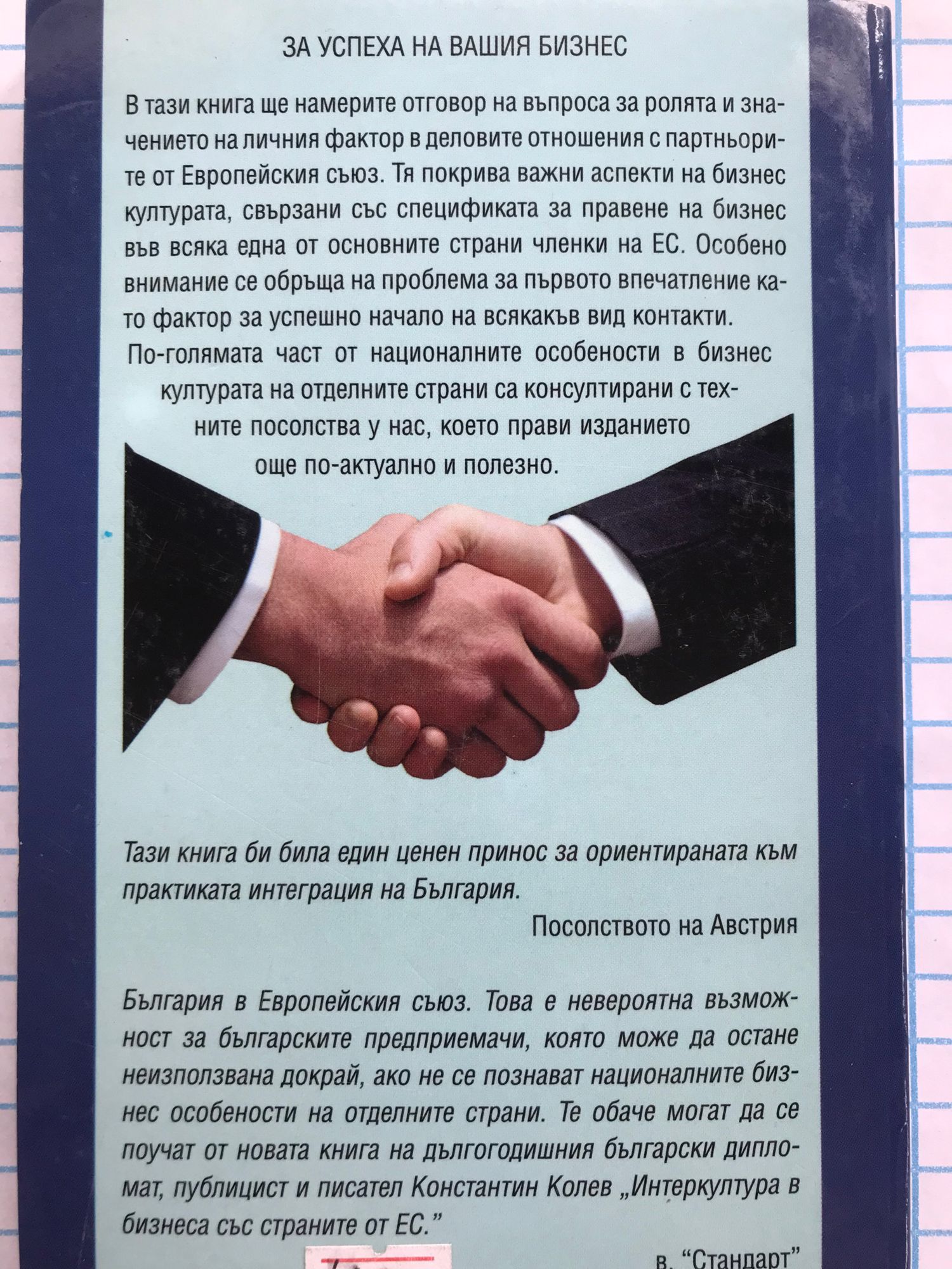 В тази книга ще намерите отговор на въпроса за ролята и значението наличния фактор в деловите отношения с партньорите от Европейския съюз. Тя покрива важни аспекти на бизнес културата, свързани със спецификата за правене на бизнес във всяка една от основните страни членки на ЕС. Особено внимание се обръща на проблема за първото впечатление като фактор за успешно начало на всякакъв вид контакти. По-голямата част от националните особености в бизнес културата на отделните страни са консултирани с техните посолства у нас, което прави изданието още по-актуално и полезно. Тази книга би била един ценен принос за ориентираната към практиката интеграция на България. Посолството на Австрия България в Европейския съюз. Това е невероятна възможност за българските предприемачи, която може да остане неизползвана докрай, ако не се познават националните бизнес особености на отделните страни. Те обаче могат да се поучат от новата книга на дългогодишния български дипломат, публицист и писател Константин Колев "Интеркултура в бизнеса със страните от ЕС." в. "Стандарт"