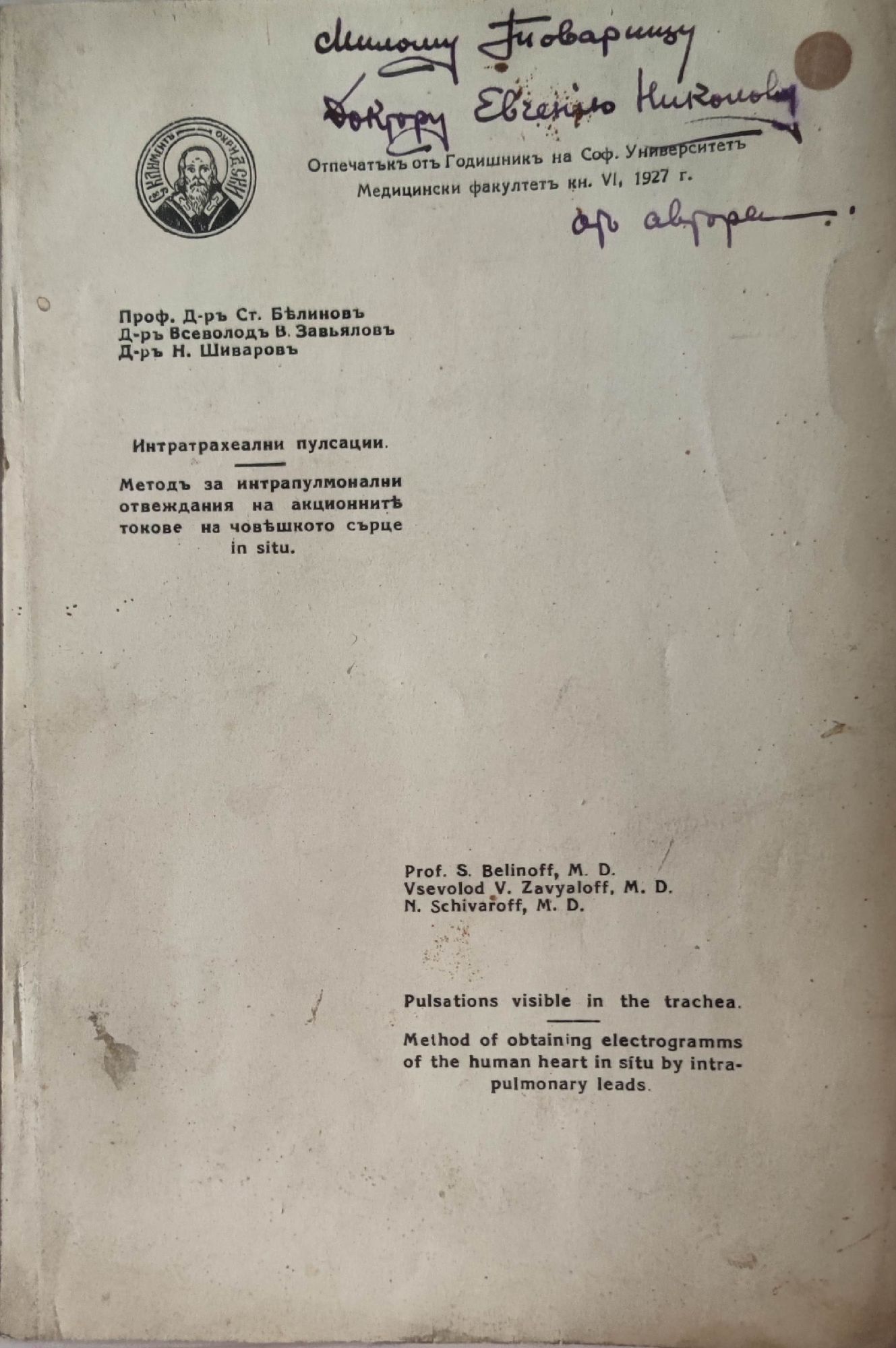 от проф. д-р Ст. Белинов, д-р Всеволод В. Завьялов, д-р Н. Шиваров