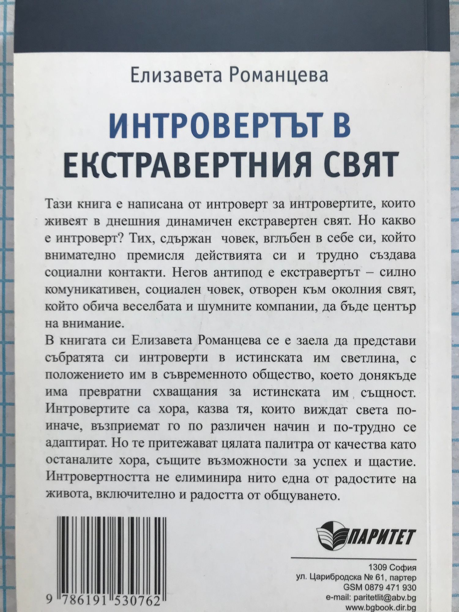 Тази книга е написана от интроверт за интровертите, които живеят в днешния динамичен екстравертен свят. Но какво е интроверт? Тих, сдържан човек, вглъбен в себе си, който внимателно премисля действията си и трудно създава социални контакти. Негов антипод е екстравертът - силно комуникативен, социален човек, отворен към околния свят, който обича веселбата и шумните компании, да бъде център на внимание. В книгата си Елизавета Романцева се е заела да представи събратята си интроверти в истинската им светлина, с положението им в съвременното общество, което донякъде има превратни схващания за истинската им същност. Интровертите са хора, казва тя, които виждат света по-иначе, възприемат го по различен начин и по-трудно се адаптират. Но те притежават цялата палитра от качества като останалите хора, същите възможности за успех и щастие. Интровертността не елиминира нито една от радостите на живота, включително и радостта от общуването.