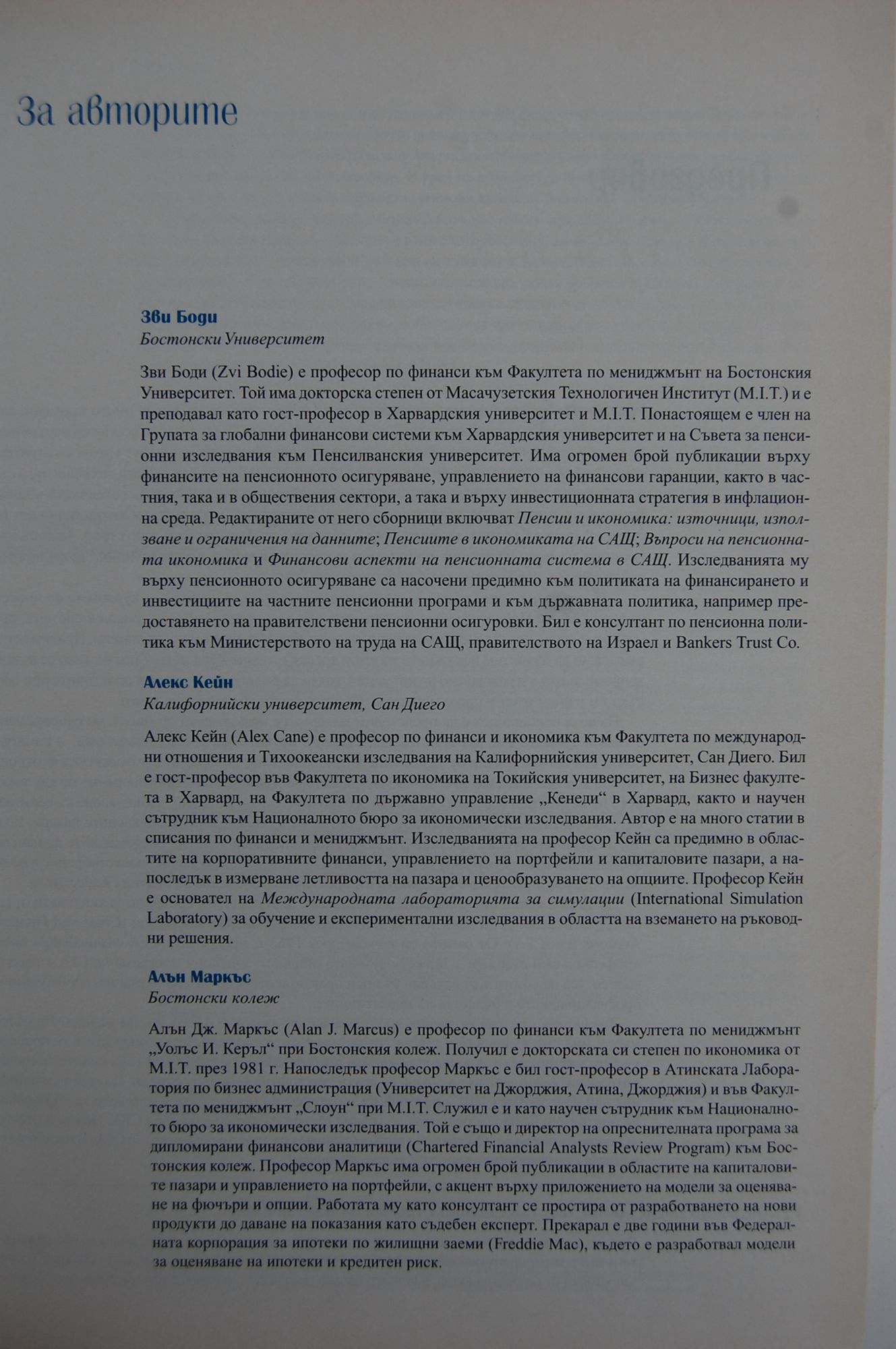 През последните две десетилетия областта на инвестициите претърпя много промени, както от гледна точка на преподаването й, така и в практиката. Това отчасти се дължи на изобилието на новосъздадени ценни книжа, донякъде - на появяването на нови търговски стратегии, които не биха били възможни без едновременния възход в компютърната технология, а също и на бързото развитие в теорията на инвестициите, осъществено от академичната общност. Вероятно в никоя друга област преходът от теорията към практиката на реалния свят не е ставал с такава бързина, каквато днес е обичайна за финансовата индустрия. Тези събития поставят на ново изпитание практиците и преподавателите по инвестиции, далеч надхвърляйки нивото, необходимо само преди няколко години. „Инвестиции “ има за цел да служи преди всичко като учебник за курсовете по инвестиционен анализ. Нашият ръководен принцип е бил да представим материала в система, организирана около централно ядро от непротиворечиви фундаментални принципи. Правим всичко възможно да изчистим ненужните математически и технически подробности, като се концентрираме върху изграждането на интуиция, която да ръводи студентите и практиците при сблъсъка им с нови идеи и предизвикателства в техния професионален живот. Нашата основна цел е да представим материал с практическа стойност, но едновременно с това и тримата сме активни изследователи в науката финансова икономика, и намираме почти всички материали от тази книга за изключително интересни в интелектуално отношение. За щастие, ние смятаме, че в областта на инвестициите няма противоречие между търсенето на истината и стремежа към пари. Точно обратното. Моделът за оценяване на капиталовите активи, моделът за оценяване на арбитражите, хипотезата за ефикасните пазари, моделът за ценообразуване при опциите и другите централни теми на съвременните финансови изследвания са обекти на научни проучвания, носещи интелектуално удовлетворение в не по-малка степен, отколкото е огромното им практическо значение за опитния инвеститор. От 1983 г. насам ние участваме в ежегодните опреснителни програми за кандидати от цял свят, подготвящи се за изпитите за дипломирани финансови аналитици (Chartered Financial Analysts или CFA). От самото си начало през 1963 г. програмата CFA символизира висок професионален стандарт в инвестиционната общност. Учебната програма на CFA е плод на консенсуса на комитет от изявени учени и практици относно базовите знания, необходими на професионалиста в областта на инвестициите. Тази книга спечели от нашия продължаващ ангажимент с CFA по два начина. На първо място, ние сме включили в текста голяма част от съдържанието на лекциите и останалите учебни материали от официалния учебен план на CFA. В резултат на това книгата включва материали, които липсват в повечето други текстове на тема инвестиции. Да обърнем внимание най-вече на Част VIII, представяща материала по принципите и методите за управление на портфейли, който се основава до голяма степен на учебния план на CFA. На второ място, задачите в края на всяка глава от книгата включват въпроси от изпитите за CFA. В настоящото издание броят на тези въпроси е силно увеличен.