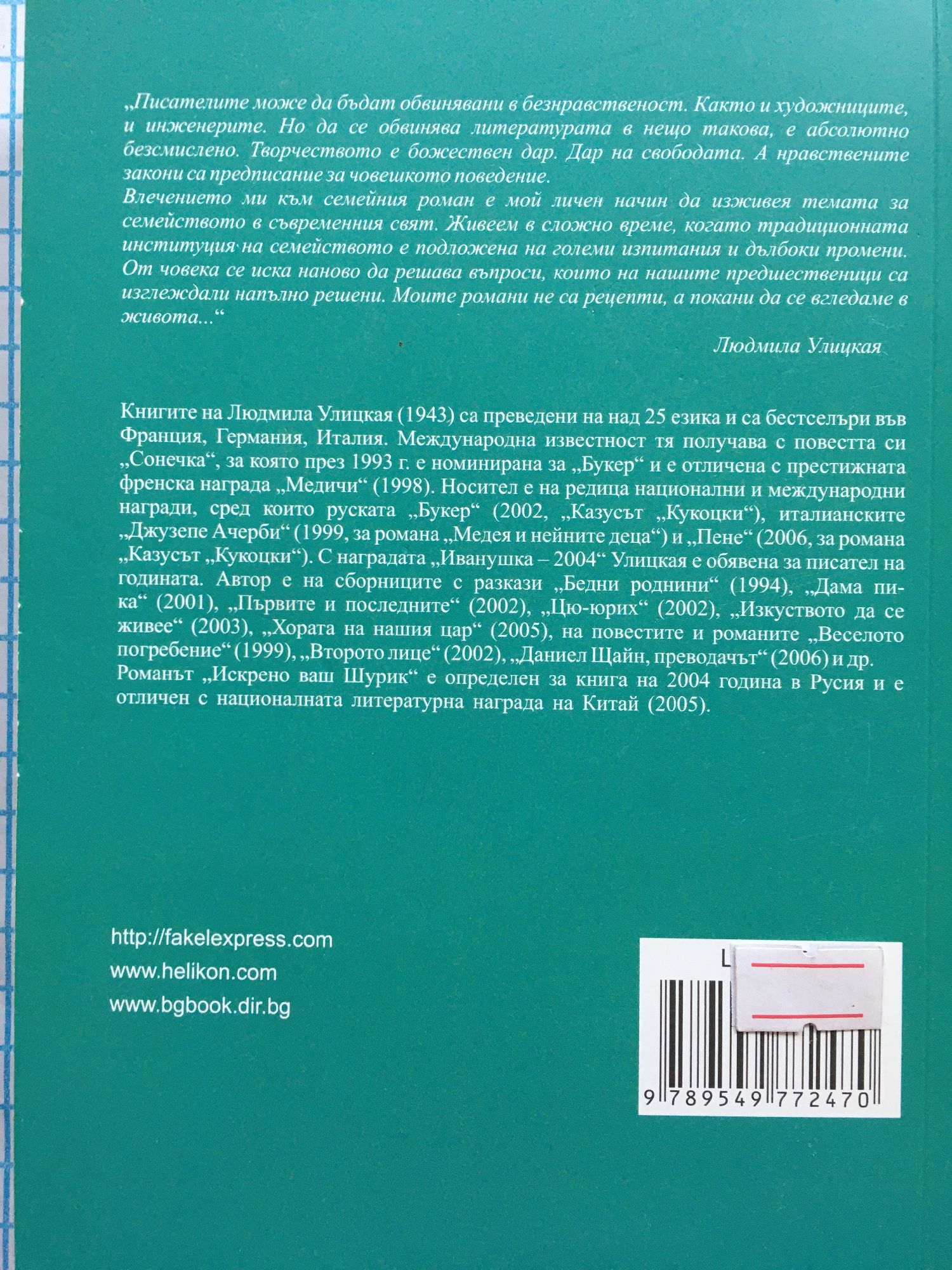 Писателите могат да бъдат обвинявани в безпристрастност. Както и художниците, и инженерите. Но да се обвинява литературата в нещо такова, е абсолютно безмислено. Творчеството е божествен дар. Дар на свободата. А нравствените закони са предписание за човешкото поведение. Влечението ми към семейния роман е мой личен начин да изживея темата за семейството в съвременния свят. Живеем в сложно време, когато традиционната институция на семейството е подложена на големи изпитания и дълбоки промени. От човека се иска наново да решава въпроси, които на нашите предшественици са изглеждали напълно решени. Моите романи не са рецепти, а покани да се вгледаме в живота..." Людмила Улицкая