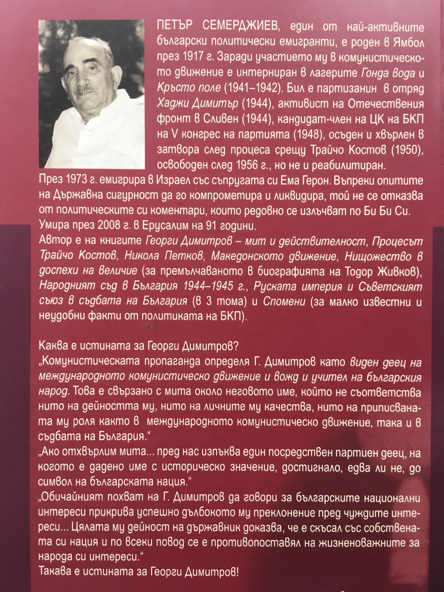 Действително ли всичко онова, което е написано и продължава да се пише за Георги Димитров, е оправдано и съответства на фактите от неговия живот и дейност? Време е обаче най-после цялата, или възможно най-пълната, истина за него да бъде разкрита и припомнена. Българин по произход, той бе въвлечен на чужда служба и остана верен до края на живота си на чуждите интереси. От неговата дейност пострадаха най-напред дейците на неговата собствена партия. С особена преданост той насаждаше в България съветския образец на социализъм, който нанесе само злини на българския народ... Затова Димитров носи пълната отговорност за наложената политическа система, превърнала се в робски ярем за България.