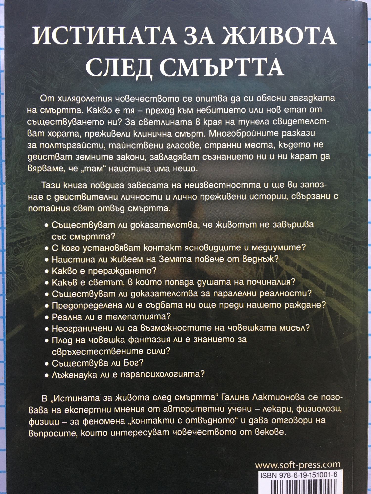 От хилядолетия човечеството се опитва да си обясни загадката на смъртта. Какво е тя – преход към небитието или нов етап от съществуването ни? За светлината в края на тунела свидетелстват хората, преживели клинична смърт. Многобройните разкази за полтъргайсти, тайнствени гласове, странни места, където не действат земните закони, завладяват съзнанието ни и ни карат да вярваме, че „там” наистина има нещо. Тази книга повдига завесата на неизвестността и ще ви запознае с действителни личности и лично преживени истории, свързани с потайния свят отвъд смъртта. Съществуват ли доказателства, че животът не завършва със смъртта? С кого установяват контакт ясновидците и медиумите? Наистина ли живеем на Земята повече от веднъж? Какво е прераждането? Какъв е светът, в който попада душата на починалия? Съществуват ли доказателства за паралелни реалности? Предопределена ли е съдбата ни още преди нашето раждане? Реална ли е телепатията? Неограничени ли са възможностите на човешката мисъл? Плод на човешка фантазия ли е знанието за свръхестествените сили? Съществува ли Бог? Лъженаука ли е парапсихологията? В „Истината за живота след смъртта” Галина Лактионова се позовава на експертни мнения от авторитетни учени – лекари, физиолози, физици – за феномена „контакти с отвъдното” и дава отговори на въпросите, които интересуват човечеството от векове.
