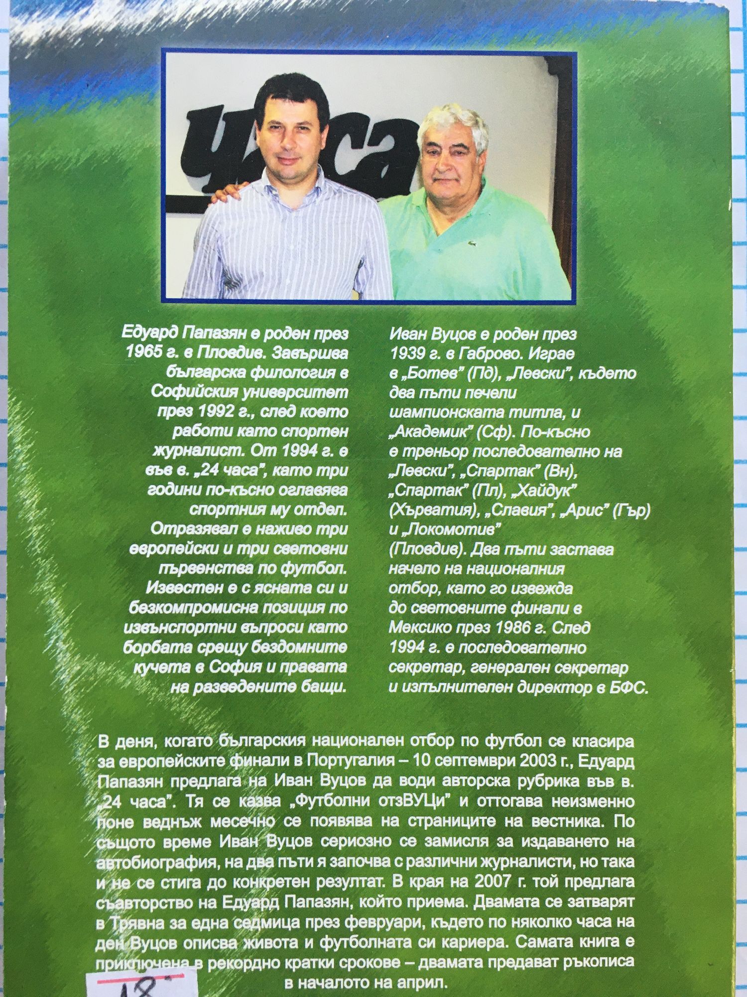 В деня, когато българския национален отбор по футбол се класира за европейските финали в Португалия - 10 септември 2003 г., Едуард Папазян предлага на Иван Вуцов да води авторска рубрика във в. "24 часа". Тя се казва "Футболни отзВУЦи" и оттогава неизменно поне веднъж месечно се появява на страниците на вестника. По същото време Иван Вуцов сериозно се замисля за издаването на автобиография, на два пъти я започва с разни журналисти, но така и не се стига до конкретен резултат. В края на 2007 г. той предлага съавторство на Едуард Папазян, който приема. Двамата се затварят в Трявна за една седмица през февруари, където по няколко часа на ден Вуцов описва живота и футболната си кариера. Самата книга е приключена в рекордно кратки срокове - двамата предават ръкописа в началото на април.