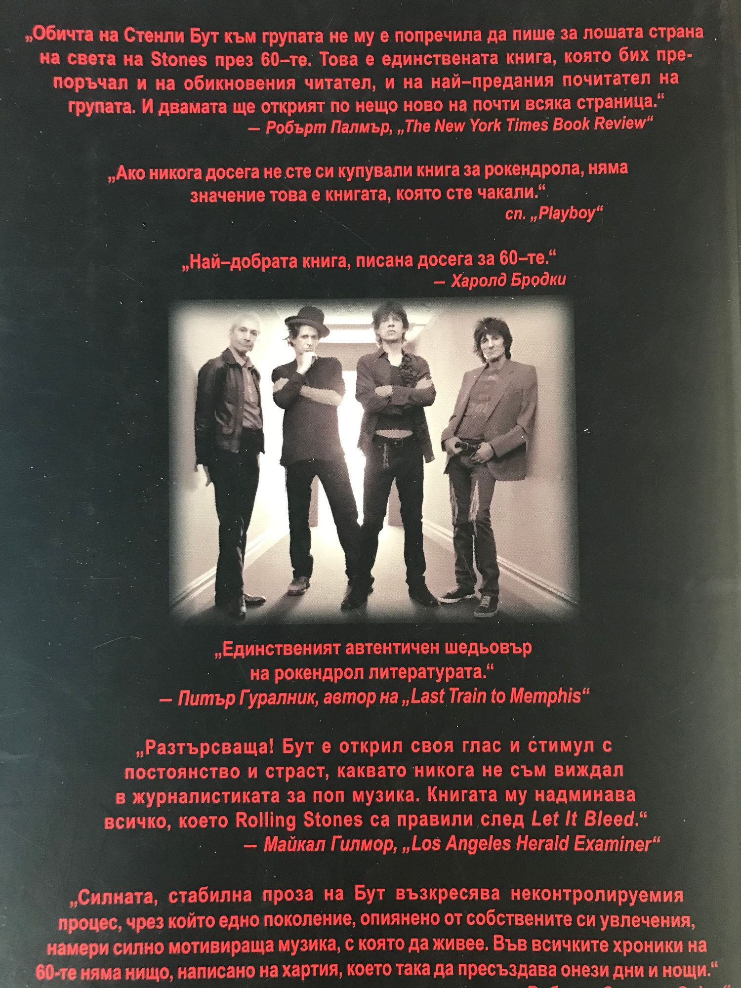 "Книгата на Стенли Бут е единствената, която мога да чета и да кажа: "Да, така беше!" - Кийт Ричардс „Обичта на Стенли Бут към групата не му е попречила да пише за лошата страна на света на Stones през 60–те. Това е единствената книга за Stones, която бих препоръчал и на обикновения читател, и на най–предания почитател на групата. И двамата ще открият по нещо ново на почти всяка страница.“ - Робърт Палмър, „The New York Times Book Review“ „Ако никога досега не сте си купували книга за рокендрола, няма значение – това е книгата, която сте чакали.“ - сп. „Playboy“ „Най–добрата книга, писана досега за 60–те.“ - Харолд Бродки „Единственият автентичен шедьовър на рокендрол литературата.“ - Питър Гуралник, автор на „Last Train to Memphis“ „Удивителна, отчасти устна история и отчасти среднощен дневник в един свят, където е завинаги полунощ!“ - Los Angelis Reader „Разтърсваща! Бут е открил своя глас и стимул с постоянство и страст, каквато никога не съм виждал в журналистиката за поп музиката. Книгата му надминава всичко, което Stones са правили след Let It Bleed.“ - Майкал Гилмор, „Los Angeles Herald Examiner“ „Силната, стабилна проза на Бут възкресява неконтролируемия процес, чрез който едно поколение, опиянено от собствените си увлечения, намери силно мотивираща музика, с която да живее. Във всичките хроники на шестдесетте няма нищо, написано на хартия, което така да пресъздава онези дни и нощи.“ - Робърт Стоун, „Salon“