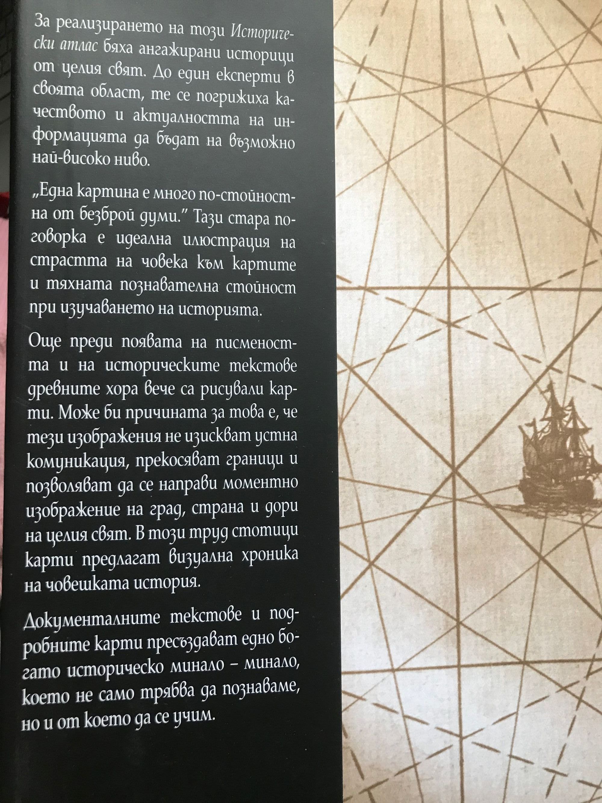 За дадено историческо събитие няма по-представително и по-нагледно нещо от картата. За да вдъхне живот на най-важните исторически събития, изданието Исторически атлас комбинира цветна картография с прецизна хронология и документални текстове, писани от водещи историци от целия свят. Ясни и точни карти на историческите събития отпреди 10 000 г. пр. Хр. чак до наши дни. Цветни изображения на земи и поселения. Хронология за всяка тема. Тематични карти, посветени на социални и културни особености. Историческият атлас представлява исторически, географски и информационен принос към великото пътуване на човечеството.
