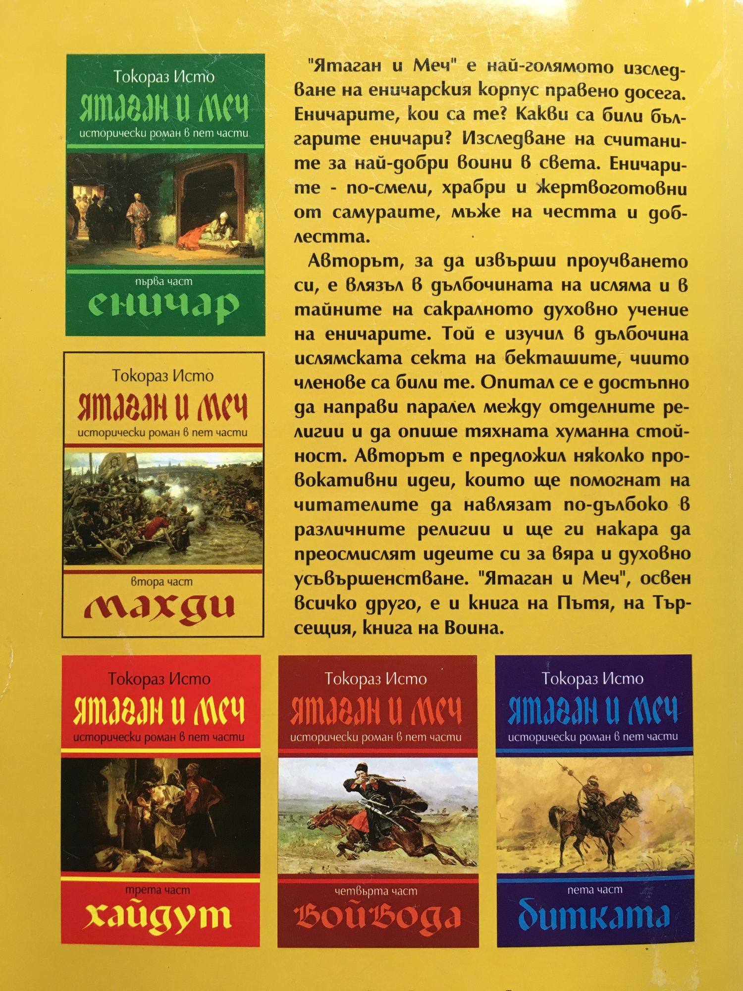 "Ятаган и Меч" е исторически роман в пет части. Това е увлекателен разказ за живота на двама братя, насилствено разделени един от друг. Единият бива избран за еничар, а другият става защитник на народа – хайдут. В книгата се разказва за това как въпреки че двамата се намират на едни и същи места, възприемат живота по различен начин и живеят в различни светове. Петлогията е драматичен разказ в духа на най- добрите балкански истории, в които има страст, любов, предателство, измама, сблъсък на две култури, на две религии и на два характера. Книгата изследва в дълбочина балканската душа и дава отговори на много въпроси за българската народопсихология.