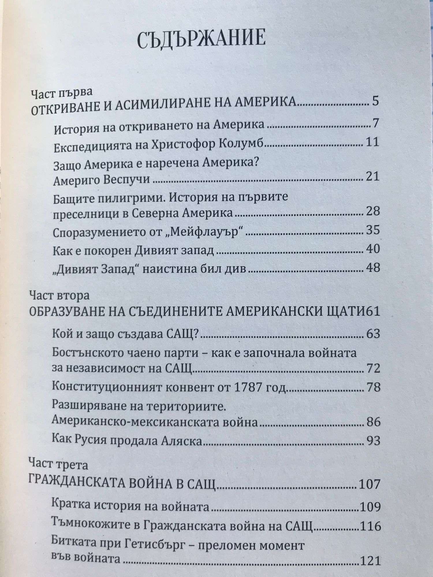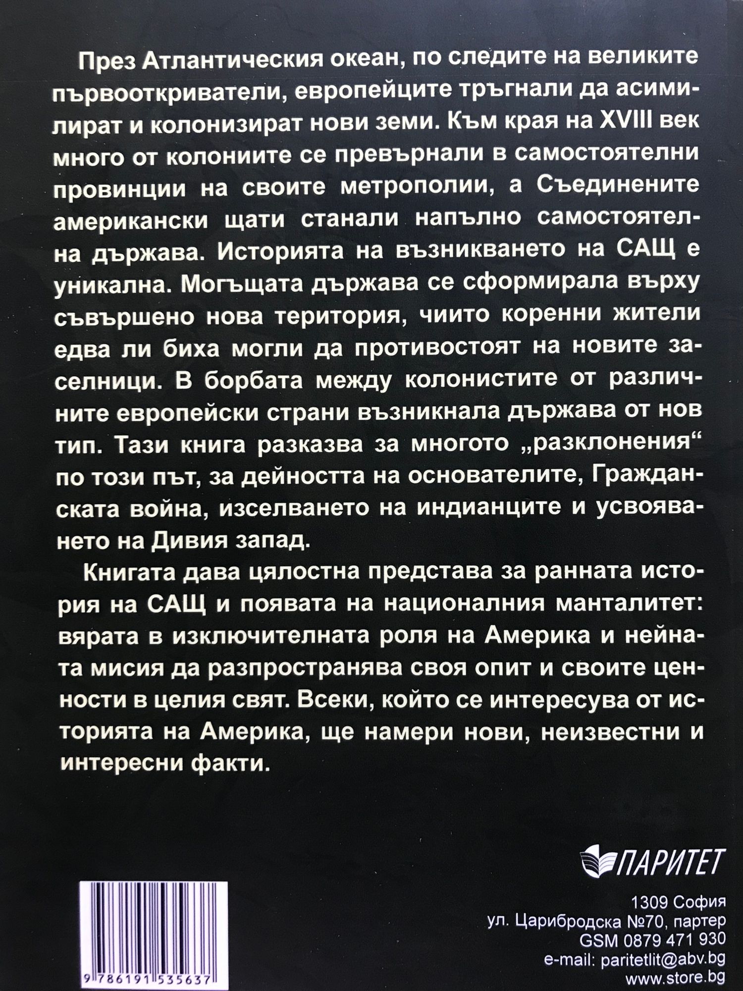 През Атлантическия океан, по следите на великите първооткриватели, европейците тръгнали да асимилират и колонизират нови земи. Към края на XVIII век много от колониите се превърнали в самостоятелни провинции на своите метрополии, а Съединените американски щати станали напълно самостоятелна държава. Историята на възникването на САЩ е уникална. Могъщата държава се сформирала върху съвършено нова територия, чиито коренни жители едва ли биха могли да противостоят на новите заселници. В борбата между колонистите от различните европейски страни възникнала държава от нов тип. Тази книга разказва за многото разклонения по този път, за дейността на основателите, Гражданската война, изселването на индианците и усвояването на Дивия запад. Книгата дава цялостна представа за ранната история на САЩ и появата на националния манталитет: вярата в изключителната роля на Америка и нейната мисия да разпространява своя опит и своите ценности в целия свят. Всеки, който се интересува от историята на Америка, ще намери нови, неизвестни и интересни факти.