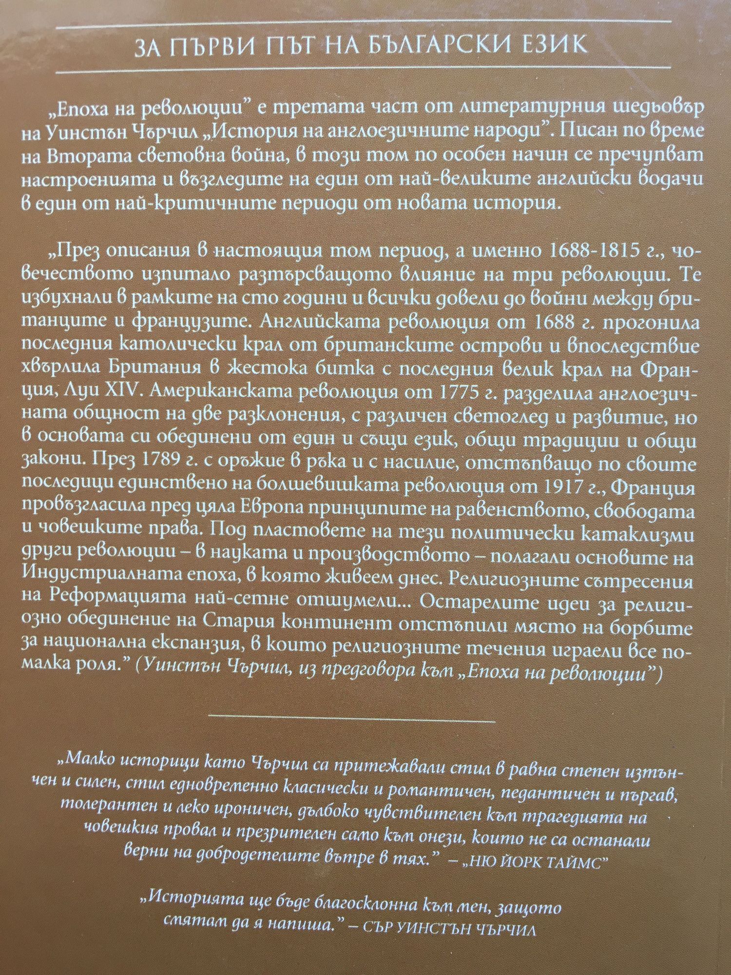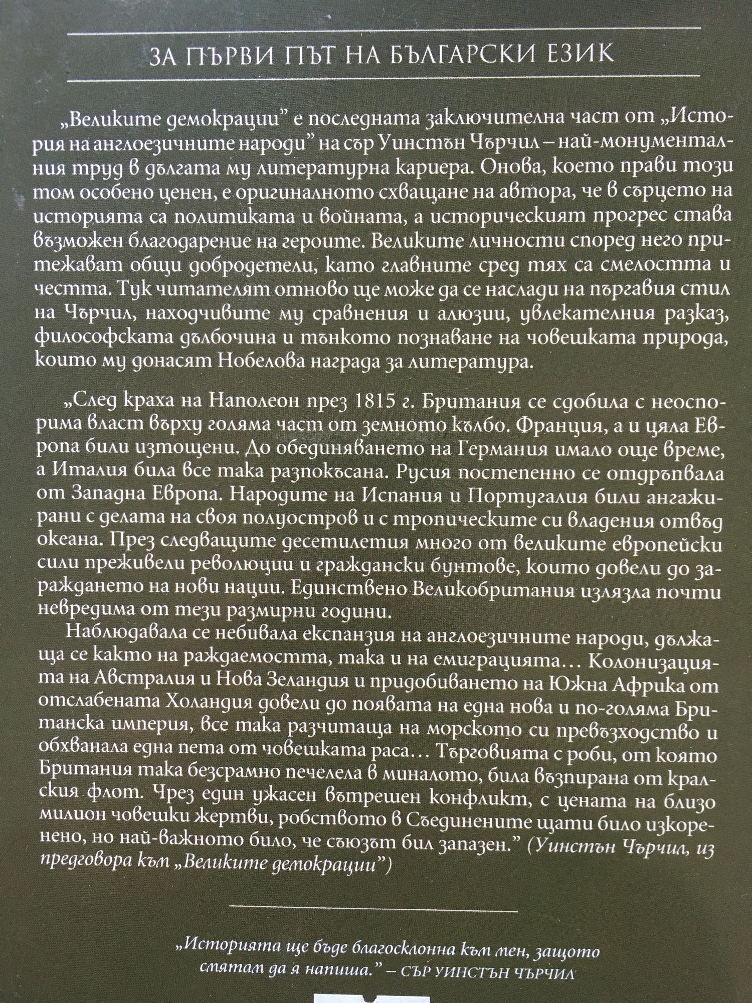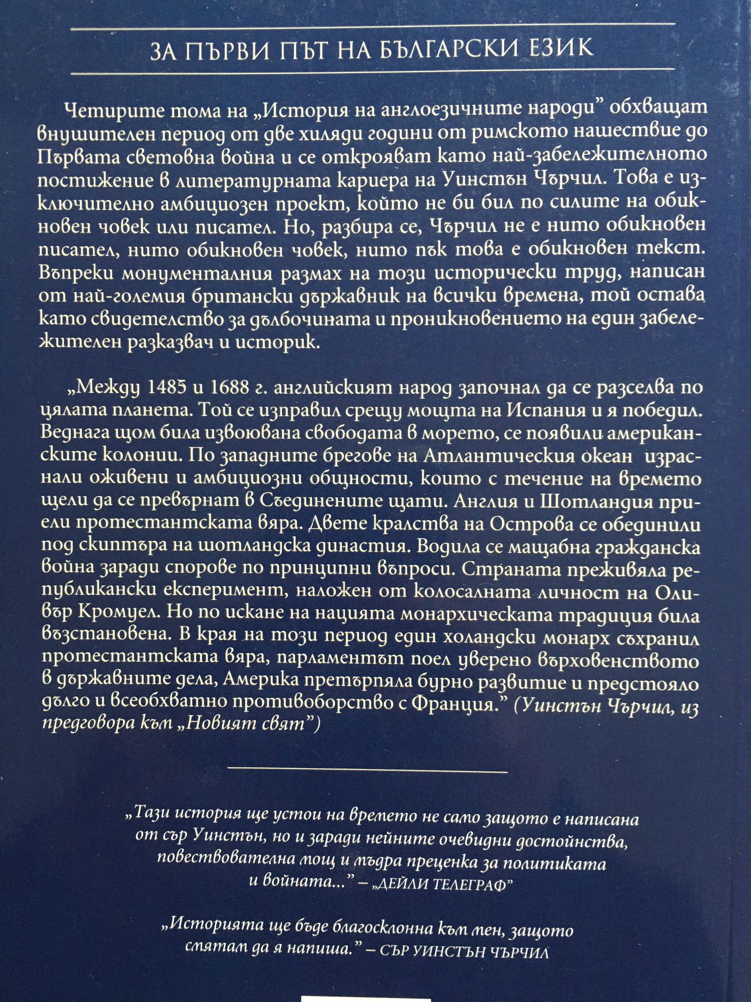 „Раждането на Британия” е първият том от монументалния труд на Уинстън Чърчил, една от най-значимите фигури на XX в., посветен на историята на англоезичните народи. Повествованието започва през 55 г. преди Христа, когато „проконсулът на Галия Гай Юлий Цезар обърнал поглед към Британия”, и завършва с Войната на розите и Битката при Босуърт през 1485 г. И в този отрязък от хилядолетие и половина Чърчил разказва за борбите и вълненията, които съпътстват създаването на една нация, за нашествията на викингите и норманите, за подписването на Великата харта на свободите и изграждането на държавата, дала на света Парламента. В началото на тома в Британия властва племенният закон, а в края му Англия е пред прага на своето имперско величие. Написан от един от майсторите на английския език и Нобелов лауреат за литература, „Раждането на Британия” е завладяващ разказ, който разкрива драмата и патоса на историята и описва делата на големите мъже и жени от миналото. Това не е сух, академичен труд с имена, дати и събития, а литературно постижение, в което страстите на историческите личности са уловени от зашеметяващата проза на Чърчил. Неговата убеденост, че историята е един величав наратив, превръща четенето на книгата във вълнуващо преживяване. Ако потенциалният читател на този том се запита защо трябва да има това издание на своята лавица, отговорът може да бъде кратък: Никога не е имало история като тази, написана от човек, който самият е създавал история; никога политическите и дипломатически решения от миналото не са били анализирани от писател, който през целия си живот е трябвало да взима решения от същия мащаб и величина. „Раждането на Британия” проследява триумфите и трагедиите на английския народ, докато той полага основите на една от най-великите политически системи в световната история.” МАЙКЪЛ ФРАСЕТО, РЕДАКТОР НА „ЕНЦИКЛОПЕДИЯ БРИТАНИКА” „Историята ще бъде благосклонна към мен, защото смятам да я напиша.” СЪР УИНСТЪН ЧЪРЧИЛ Четирите тома на "История на англоезичните народи" обхващат внушителен период от две хиляди години от римското нашествие до Първата световна война и се открояват като най-забележителното постижение в литературната кариера на Уинстън Чърчил. Това е изключително амбициозен проект, който не би бил по силите на обикновен човек или писател. Но, разбира се, Чърчил не е нито обикновен писател, нито обикновен човек, нито пък това е обикновен текст. Въпреки монументалния размах на този исторически труд, написан от най-големия британски държавник на всички времена, той остава като свидетелство за дълбочината и проникновението на един забележителен разказвач и историк. "Между 1485 и 1688 г. английският народ започнал да се разселва по цялата планета. Той се изправил срещу мощта на Испания и я победил. Веднага щом била извоювана свободата в морето, се появили американските колонии. По западните брегове на Атлантическия океан израснали оживени и амбициозни общности, които с течение на времето щели да се превърнат в Съединените щати. Англия и Шотландия приели протестантската вяра. Двете кралства на Острова се обединили под скиптъра на шотландска династия. Водила се мащабна гражданска война заради спорове по принципни въпроси. Страната преживяла републикански експеримент, наложен от колосалната личност Оливър Кромуел. Н