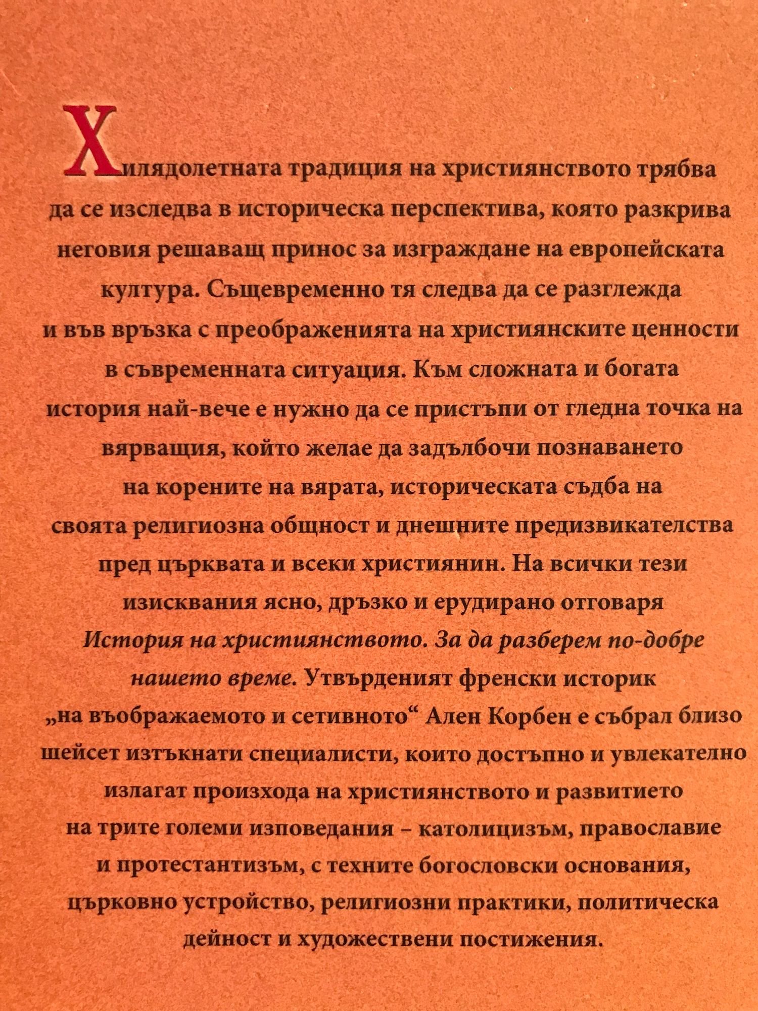Хилядолетната традиция на християнството трябва да се изследва в историческа перспектива, която разкрива неговия решаващ принос за изграждане на европейската култура. Същевременно тя следва да се разглежда и във връзка с преображенията на християнските ценности в съвременната ситуация. Към сложната и богата история най-вече е нужно да се пристъпи от гледна точка на вярващия, който желае да задълбочи познаването на корените на вярата, историческата съдба на своята религиозна общност и днешните предизвикателства пред църквата и всеки християнин. На всички тези изисквания ясно, дръзко и ерудирано отговаря История на християнството. За да разберем по-добре нашето време. Утвърденият френски историк "на въображаемото и сетивното" Ален Корбен е събрал близо шейсет изтъкнати специалисти, които достъпно и увлекателно излагат произхода на християнството и развитието на трите големи изповедания - католицизъм, православие и протестантизъм, с техните богословски основания, църковно устройство, религиозни практики, политическа дейност и художествени постижения.