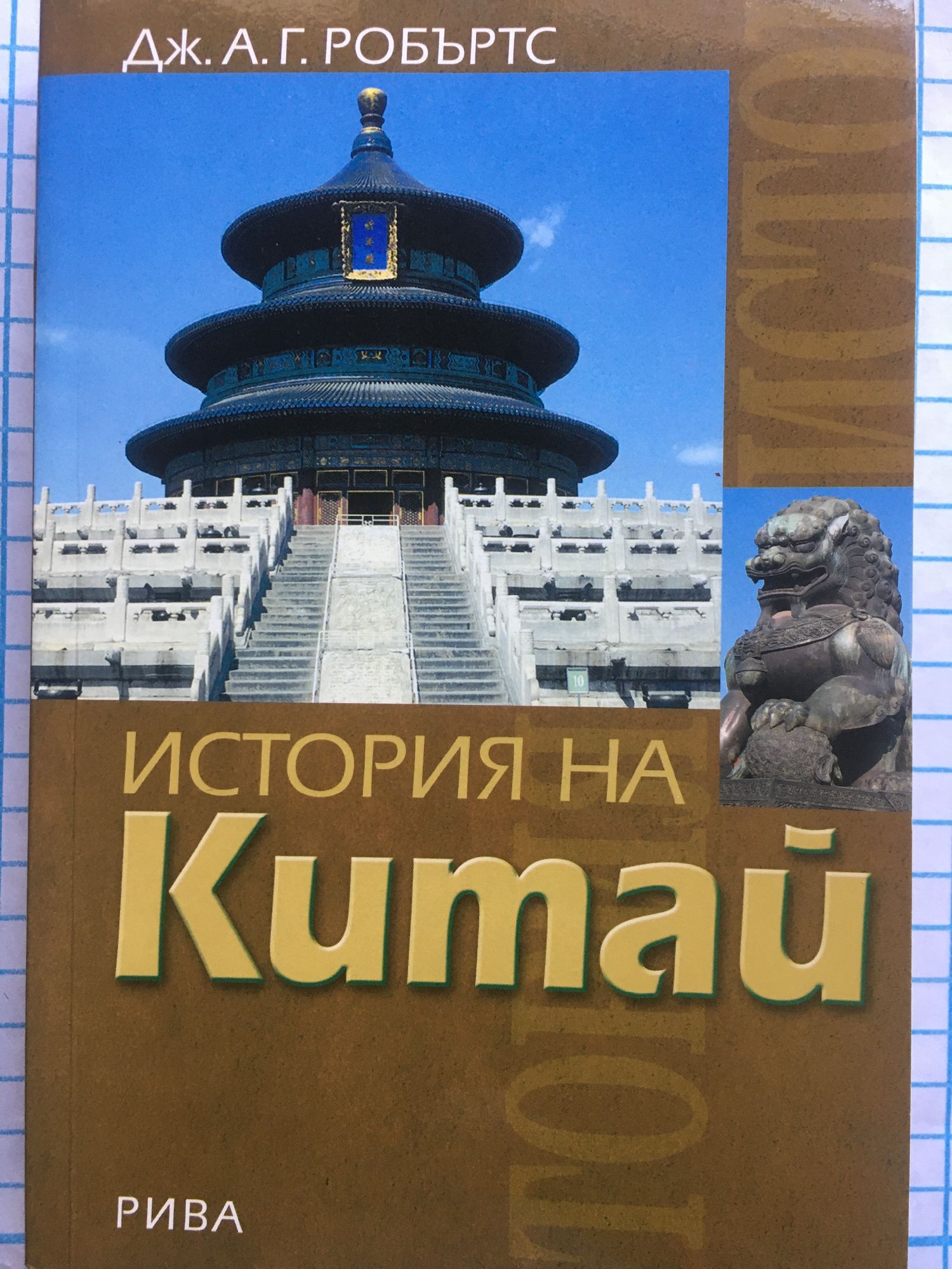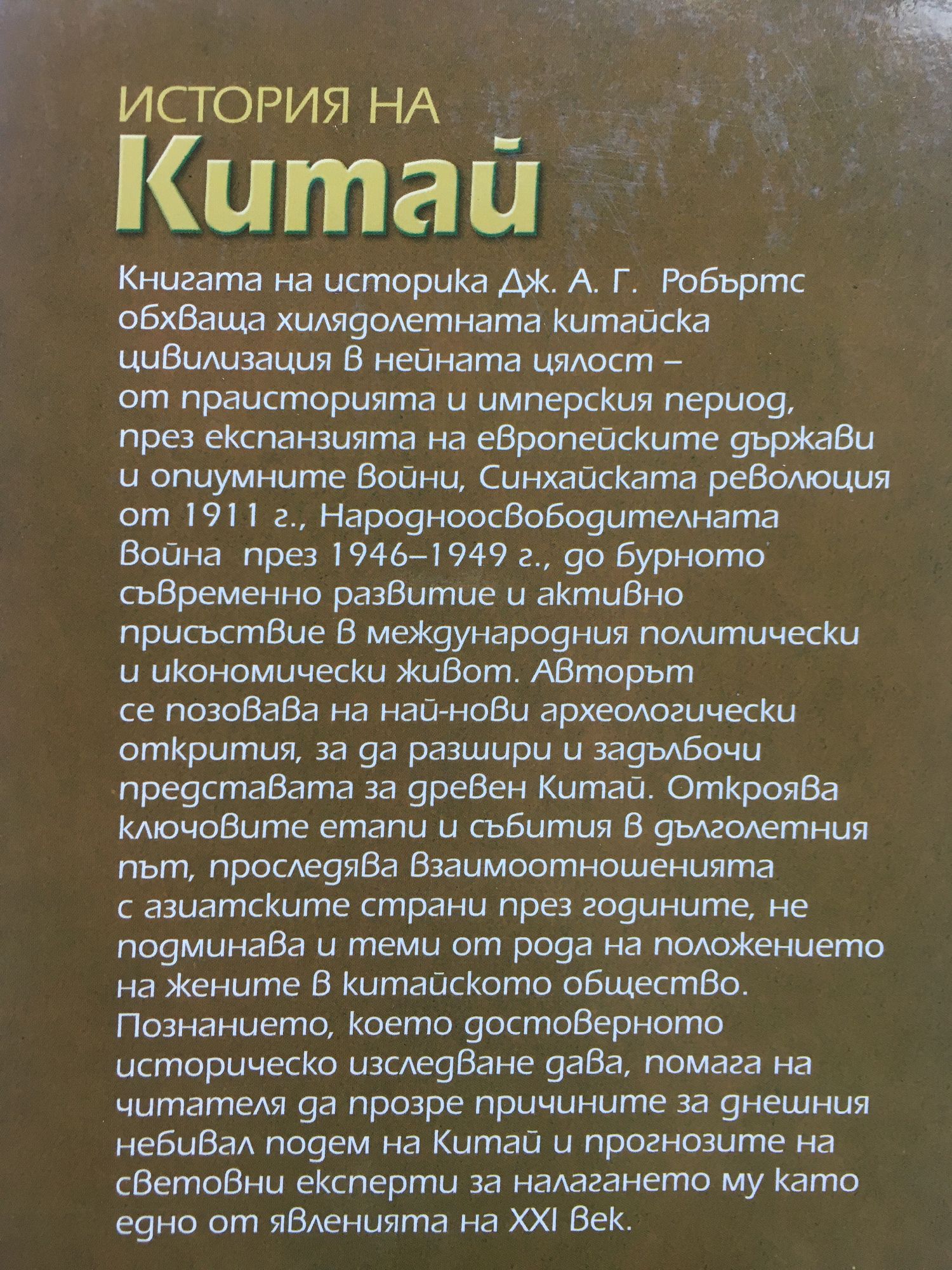 Книгата на историка Дж. А. Г. Робъртс обхваща хилядолетната китайска цивилизация в нейната цялост - от праисторията и имперския период, през експанзията на европейските държави и опиумните войни, Синхайската революция от 1911 г., Народноосвободителната война през 1946-1949 г., до бурното съвременно развитие и активно присъствие в международния политически и икономически живот. Авторът се позовава на най-нови археологически открития, за да разшири и задълбочи представата за древен Китай. Откроява ключовите етапи и събития в дълголетния път, проследява взаимоотношенията с азиатските страни през годините, не подминава и теми от рода на положението на жените в китайското общество. Познанието, което достоверното историческо изследване дава, помага на читателя да прозре причините за днешния небивал подем на Китай и прогнозите на световни експерти за налагането му като едно от явленията на XXI век.