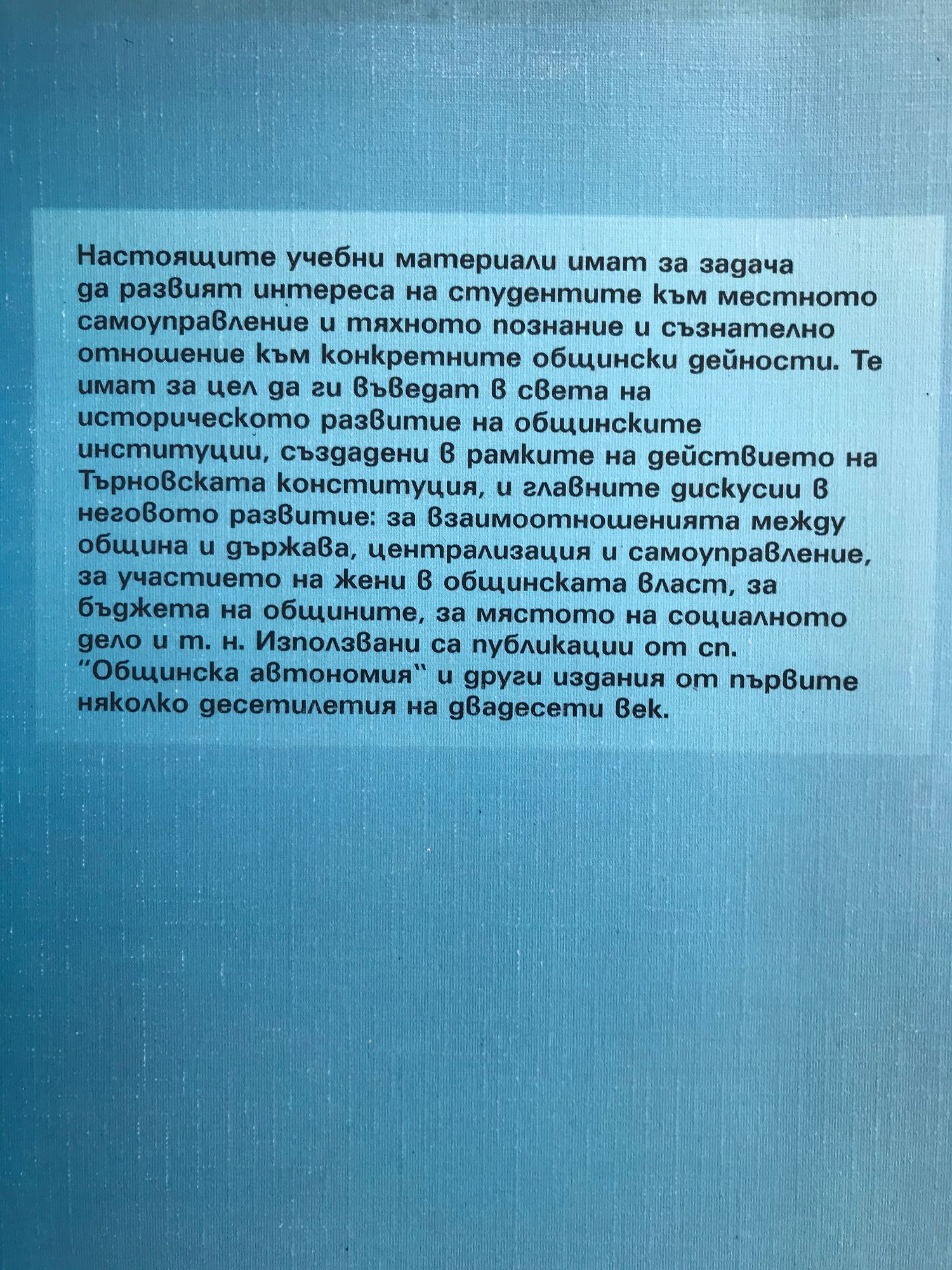 Настоящите учебни материали имат за задача да развият интереса на студентите към местното самоуправление и тяхното познание и съзнателно отношение към конкретните общински дейности.