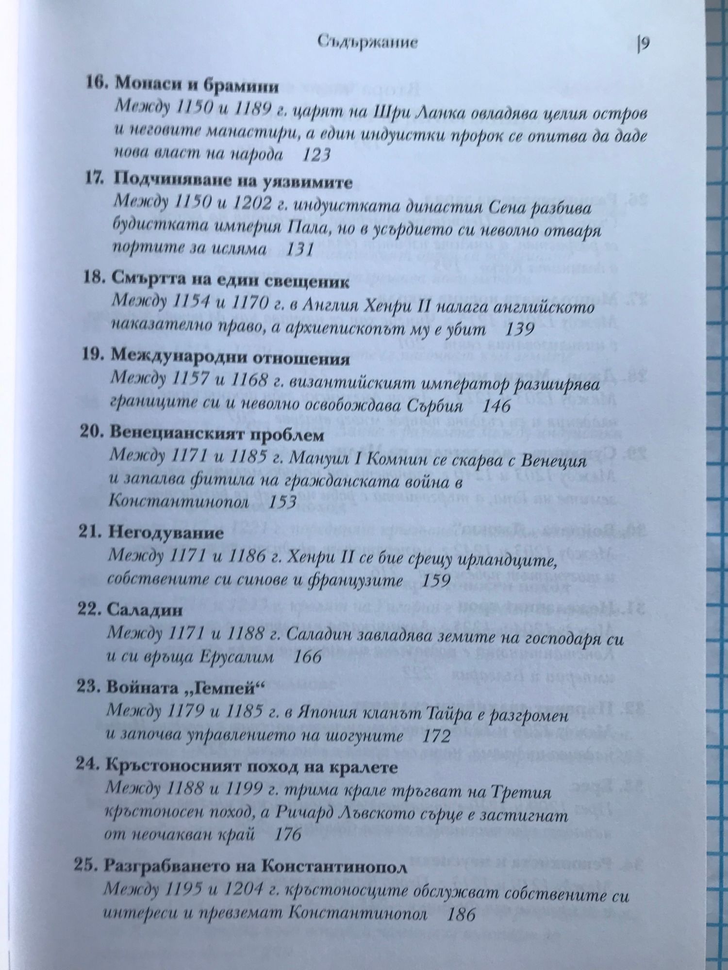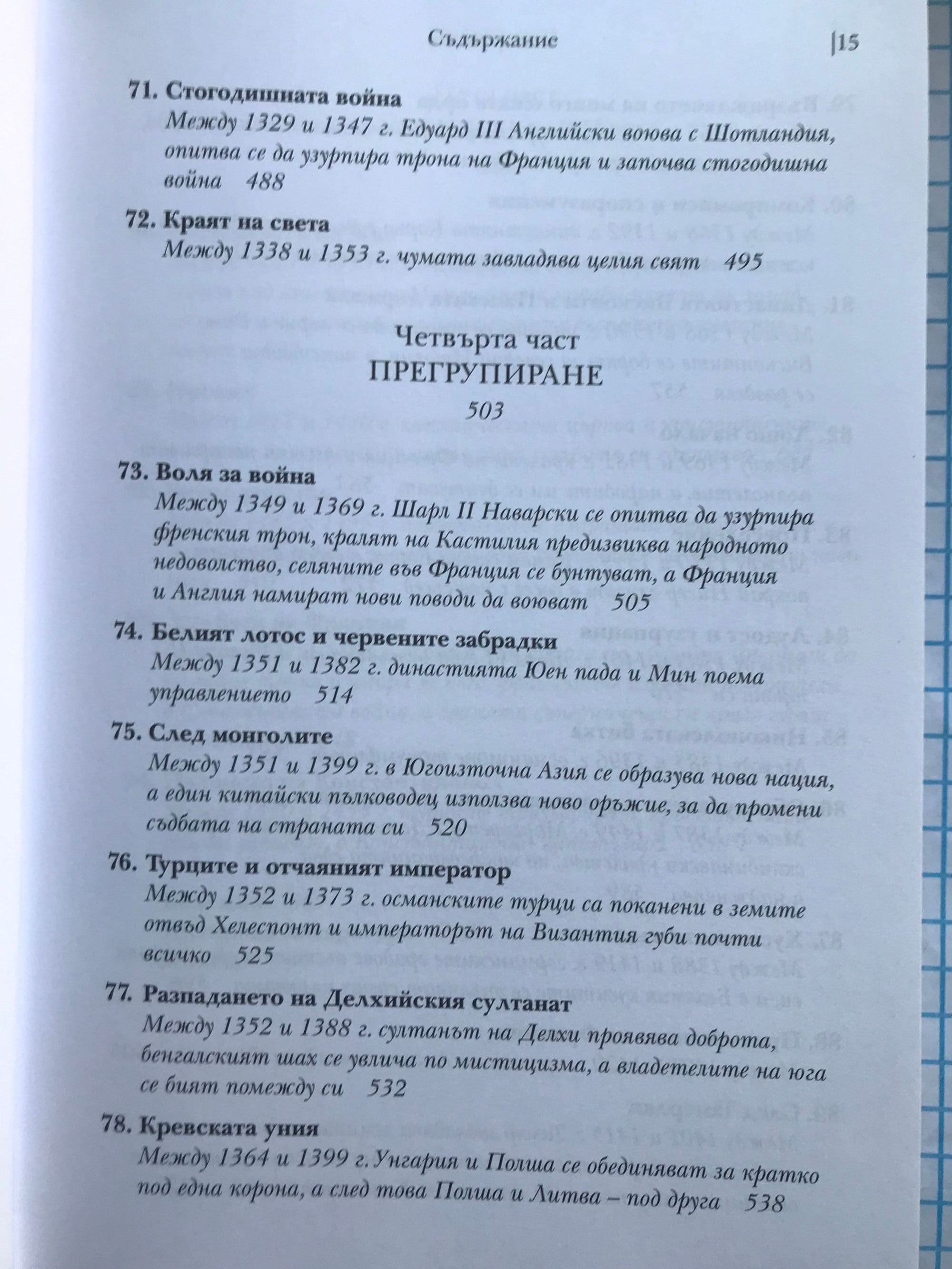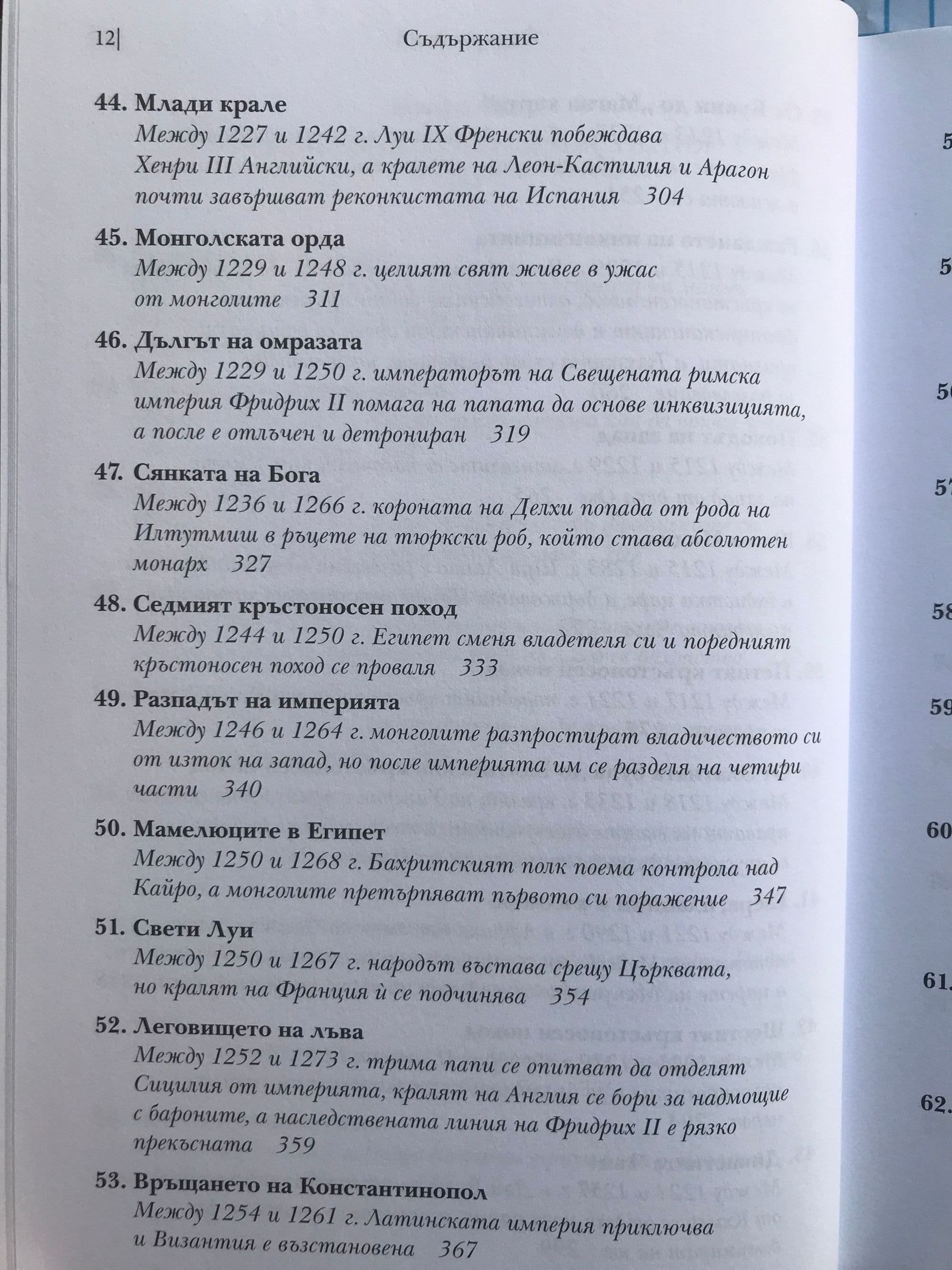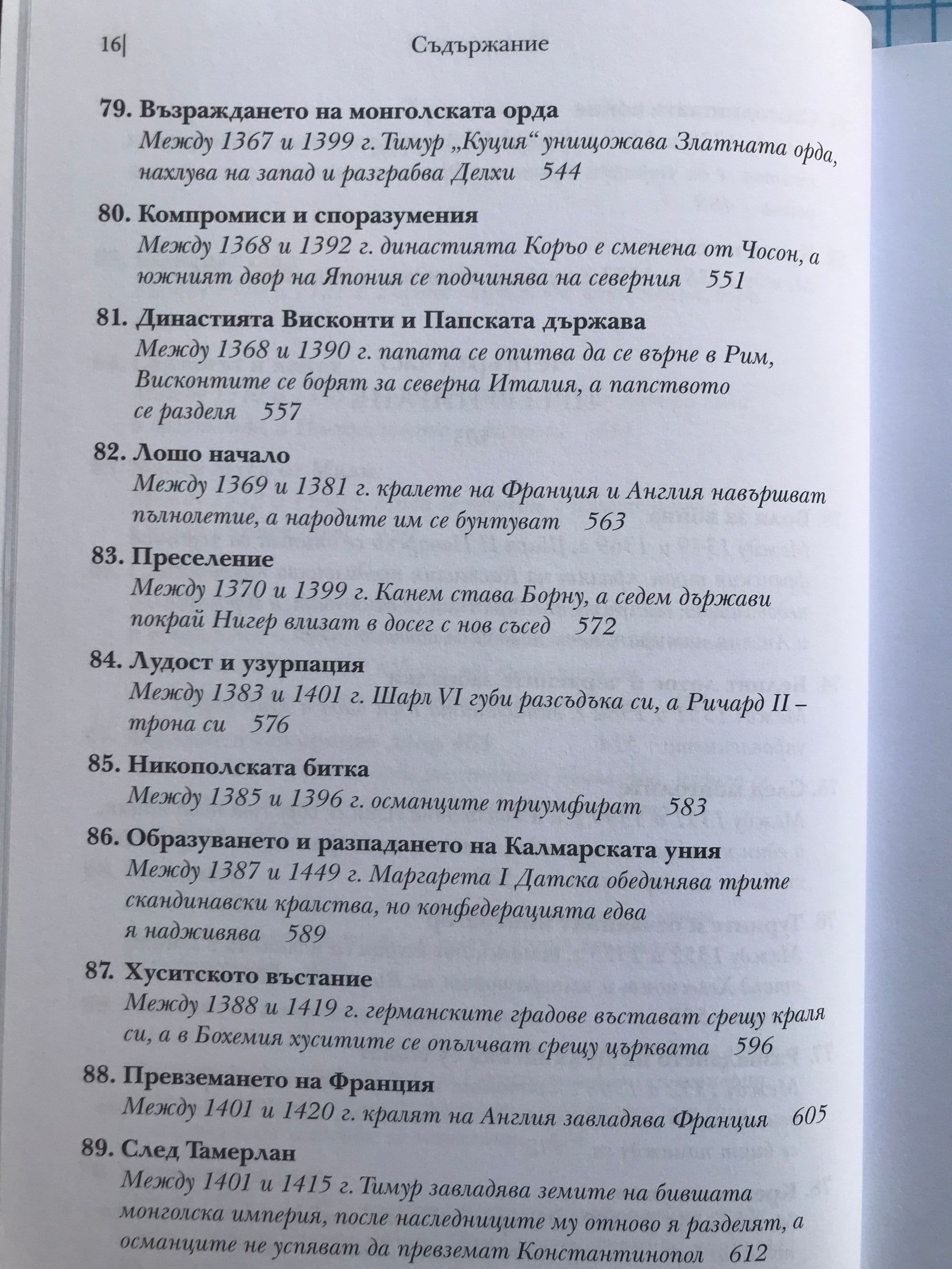 Историческите факти, описани в тази книга, ще ви разкрият някои закономерности и основни правила в икономиката, политиката и медицината, които са валидни в пълна сила и днес. Запознавайки се с миналото, внимателният читател ще може да си извади задълбочени изводи за съвремието, а този, който иска просто да прекара свободното време с интересно четиво, може да се наслади на една увлекателна приказка, напомняща “Война на тронове”, но с тази разлика, че всяко събитие в нея се е случило. Коя болест прекъсва преждевременно живота на най-много монарси и изменя многократно хода на историята. Защо преоткриването на забравени древни знания и философски учения заплашва стабилността и самото съществуване на средновековните общества. Как в рамките на 3 века различни учения от далечна Индия до чешките земи достигат до една и съща религиозна доктрина, заплашваща централната власт. Как се поставят основите на съвременното право и как владетелите използват поръчкови убийства, за да укрепват властта си. Как в продължение на векове европейските политически и духовни водачи се борят за надмощие и кой надделява в крайна сметка. Как религиозните учения се изопачават, за да се използват за политически и икономически цели: за завземане на нови земи от иноверци, за унищожаване на конкуренти, за натрупване на все повече богатства за духовенството и накрая за оправдаване на поробването на цели народи. Кои владетели предприемат гонения срещу евреите и какво постигат с това. Как хитрите на пръв поглед мерки на владетелите за увеличаване на богатството им водят до икономическа катастрофа и кои са първите случаи на инфлация в света. Защо е по-лесно да завладееш голяма империя, но много по-трудно да я задържиш и управляваш. Коя е първата голяма пандемия, обхванала цялото западно полукълбо. Много слабо познати факти от историята на ислямския свят, Югоизточна Азия, Индия, Африка и Америка. Как разединението и борбата за власт на могъщи до неотдавна държави позволяват на бедни и малки племена и царства да ги завладеят.