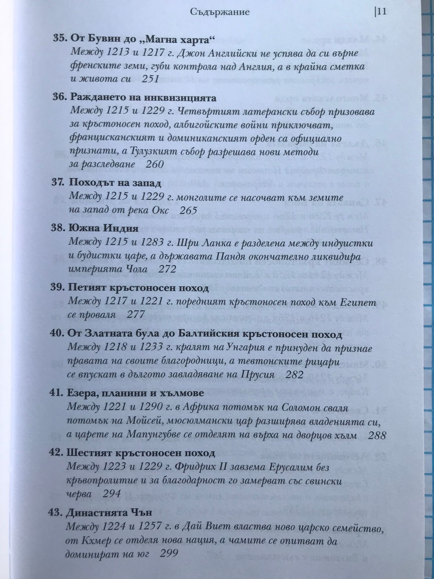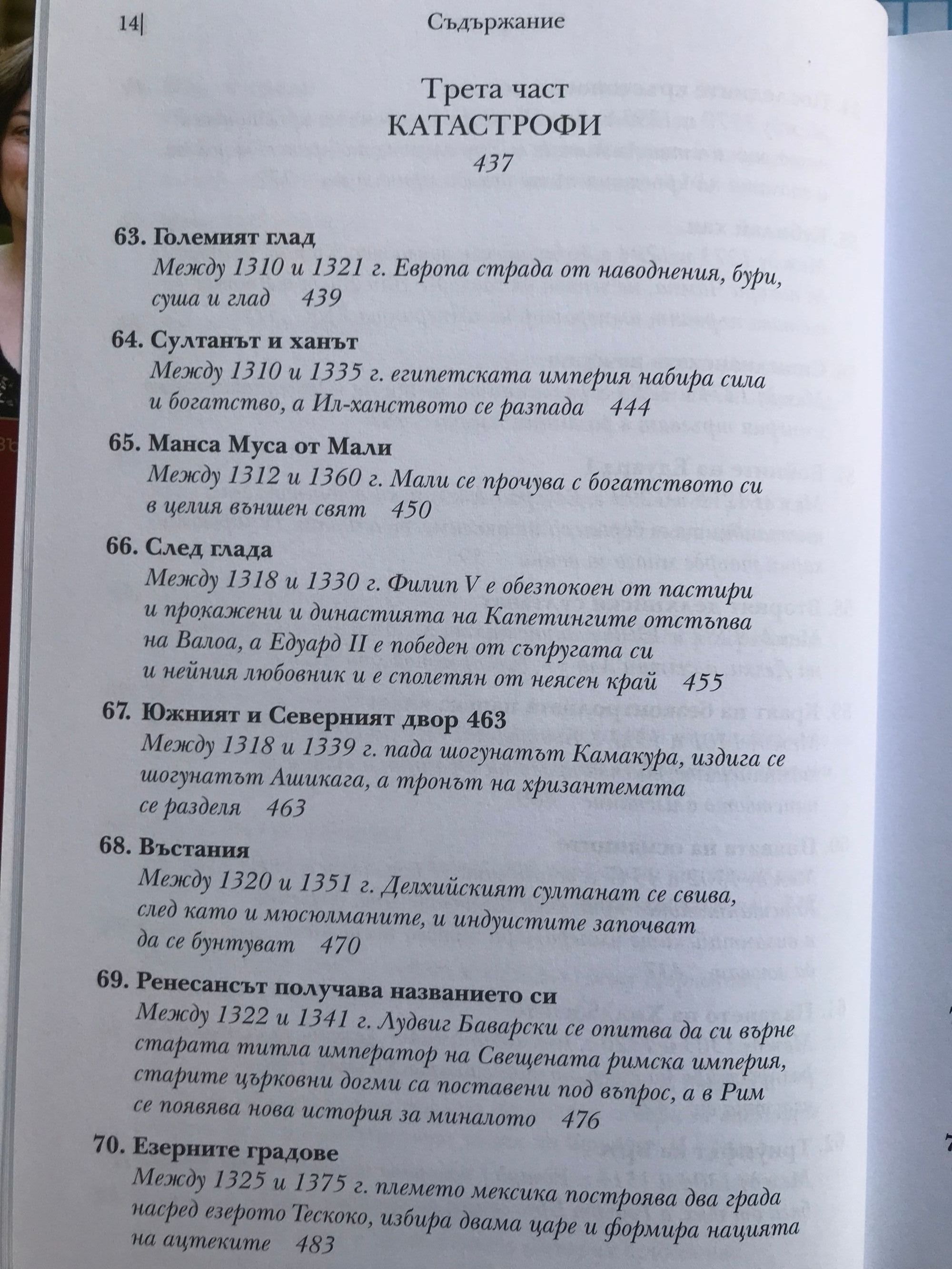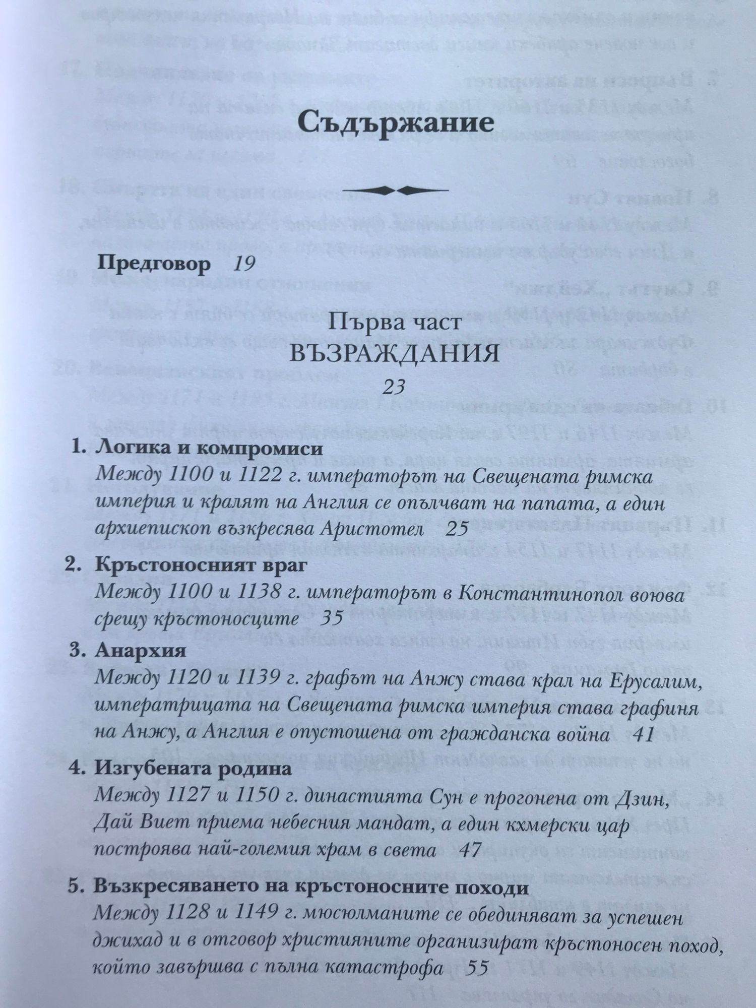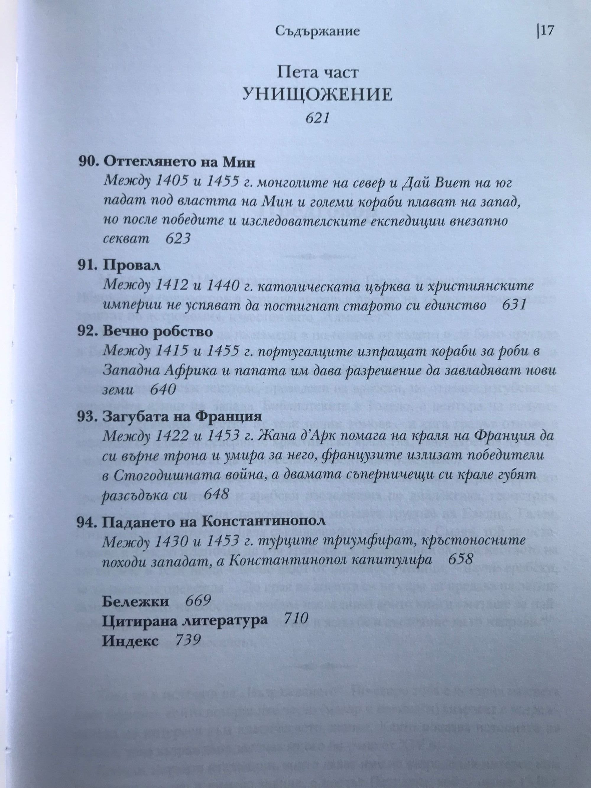 Историческите факти, описани в тази книга, ще ви разкрият някои закономерности и основни правила в икономиката, политиката и медицината, които са валидни в пълна сила и днес. Запознавайки се с миналото, внимателният читател ще може да си извади задълбочени изводи за съвремието, а този, който иска просто да прекара свободното време с интересно четиво, може да се наслади на една увлекателна приказка, напомняща “Война на тронове”, но с тази разлика, че всяко събитие в нея се е случило. Коя болест прекъсва преждевременно живота на най-много монарси и изменя многократно хода на историята. Защо преоткриването на забравени древни знания и философски учения заплашва стабилността и самото съществуване на средновековните общества. Как в рамките на 3 века различни учения от далечна Индия до чешките земи достигат до една и съща религиозна доктрина, заплашваща централната власт. Как се поставят основите на съвременното право и как владетелите използват поръчкови убийства, за да укрепват властта си. Как в продължение на векове европейските политически и духовни водачи се борят за надмощие и кой надделява в крайна сметка. Как религиозните учения се изопачават, за да се използват за политически и икономически цели: за завземане на нови земи от иноверци, за унищожаване на конкуренти, за натрупване на все повече богатства за духовенството и накрая за оправдаване на поробването на цели народи. Кои владетели предприемат гонения срещу евреите и какво постигат с това. Как хитрите на пръв поглед мерки на владетелите за увеличаване на богатството им водят до икономическа катастрофа и кои са първите случаи на инфлация в света. Защо е по-лесно да завладееш голяма империя, но много по-трудно да я задържиш и управляваш. Коя е първата голяма пандемия, обхванала цялото западно полукълбо. Много слабо познати факти от историята на ислямския свят, Югоизточна Азия, Индия, Африка и Америка. Как разединението и борбата за власт на могъщи до неотдавна държави позволяват на бедни и малки племена и царства да ги завладеят.