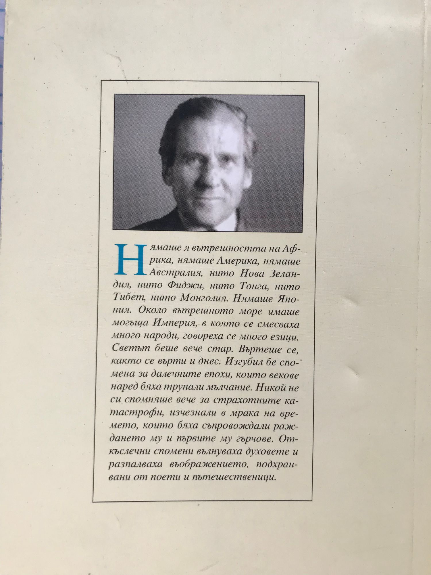 “Нямаше я вътрешността на Африка, нямаше Америка, нямаше Австралия, нито Нова Зеландия, нито Фидщси, нито Гонга, нито Тибет, нито Монголия. Нямаше Япония. Около вътрешното море имаше могъща Империя, в която се смесваха много народи, говореха се много езици. Светът беше вече стар. Въртеше се, както се върти и днес. Изгубил бе спомена за далечните епохи, които векове наред бяха трупали мълчание. Никой не си спомняше вече за страхотните катастрофи, изчезнали в мрака на времето, които бяха съпровождали раждането му и първите му гърчове. Откъслечни спомени вълнуваха духовете и разпалваха въображението, подхранвани от поети и пътешественици.”