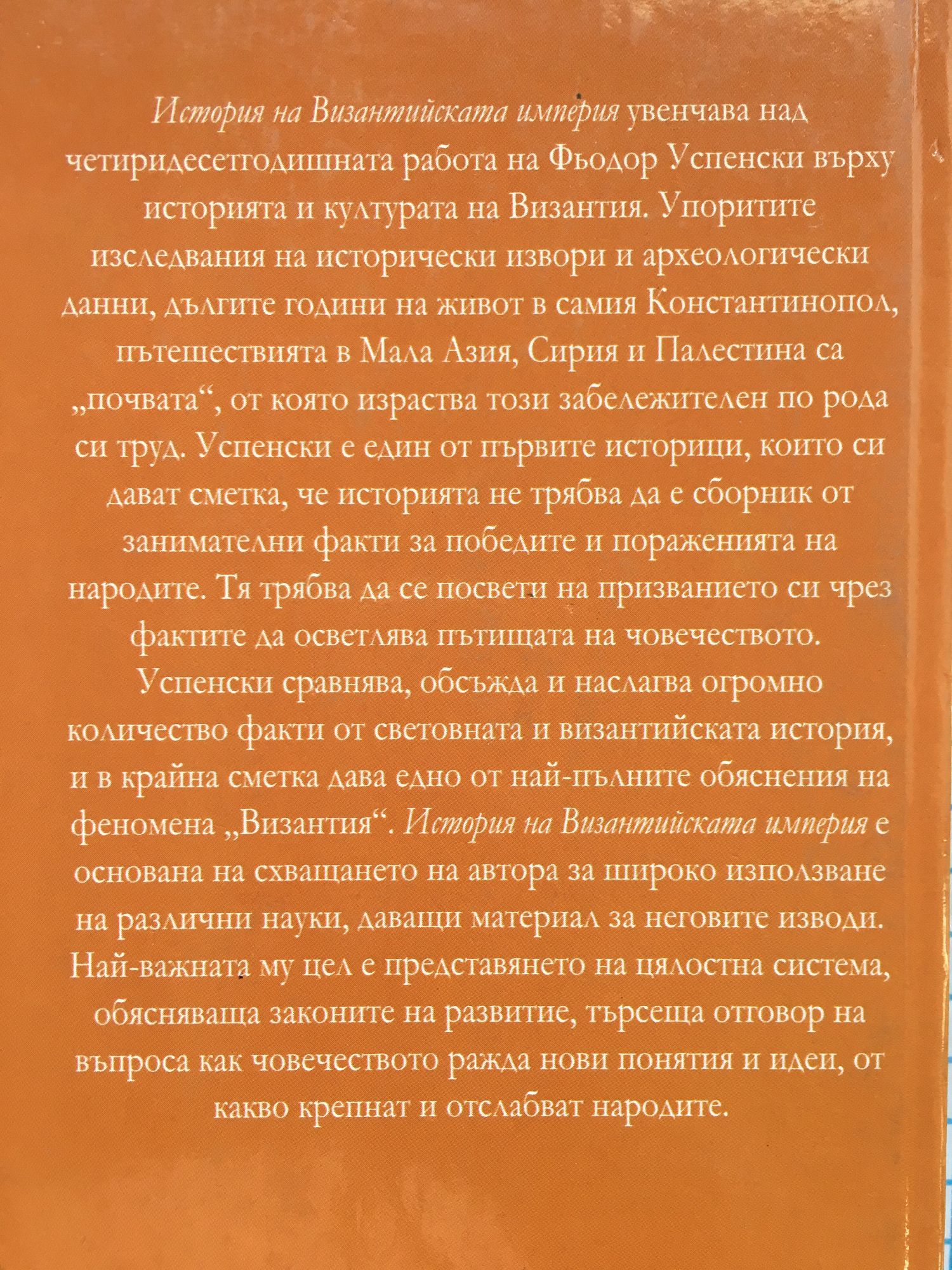 История на Византийската империя увенчава над четиридесетгодишната работа на Фьодор Успенски върху историята и културата на Византия. Упоритите изследвания на исторически извори и археологически данни, дългите години на живот в самия Константинопол, пътешествията в Мала Азия, Сирия и Палестина са "почвата", от която израства този забележителен по рода си труд. Успенски е един от първите историци, които си дават сметка, че историята не трябва да е сборник от занимателни факти за победите и пораженията на народите. Тя трябва да се посвети на признанието си чрез фактите да осветлява пътищата на човечеството. Успенски сравнява, обсъжда и наслагва огромно количество факти от световната и византийската история, и в крайна сметка дава едно от най-пълните обяснения на феномена "Византия". "История на Византийската империя" е основана на схващането на автора за широко използване на различни науки, даващи материал за неговите изводи. Най-важната му цел е представяне на цялостна система, обясняваща законите на развитие, търсеща отговор на въпроса как човечеството ражда нови понятия и идеи, от какво крепнат и отслабват народите.