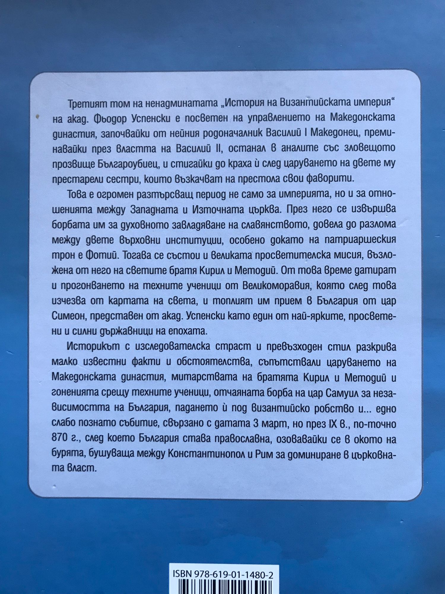 Третият том на ненадминатата „История на Византийската империя“ на акад. Фьодор Успенски е посветен на управлението на Македонската династия, започвайки от нейния родоначалник Василий I Македонец, преминавайки през властта на Василий II, останал в аналите със зловещото прозвище Българоубиец, и стигайки до краха й след царуването на двете му престарели сестри, които възкачват на престола свои фаворити. Това е огромен разтърсващ период не само за империята, но и за отношенията между Западната и Източната църква. През него се извършва борбата им за духовното завладяване на славянството, довела до разлома между двете върховни институции, особено докато на патриаршеския трон е Фотий. Тогава се състои и великата просветителска мисия, възложена от него на светите братя Кирил и Методий. От това време датират и прогонването на техните ученици от Великоморавия, която след това изчезва от картата на света, и топлият им прием в България от цар Симеон, представен от акад. Успенски като един от най-ярките, просветени и силни държавници на епохата. Историкът с изследователска страст и превъзходен стил разкрива малко известни факти и обстоятелства, съпътствали царуването на Македонската династия, митарствата на братята Кирил и Методий и гоненията срещу техните ученици, отчаяната борба на цар Самуил за независимостта на България, падането й под византийско робство и… едно слабо познато събитие, свързано с датата 3 март, но през IX в., по-точно 870 г., след което България става православна, озовавайки се в окото на бурята, бушуваща между Константинопол и Рим за доминиране в църковната власт.