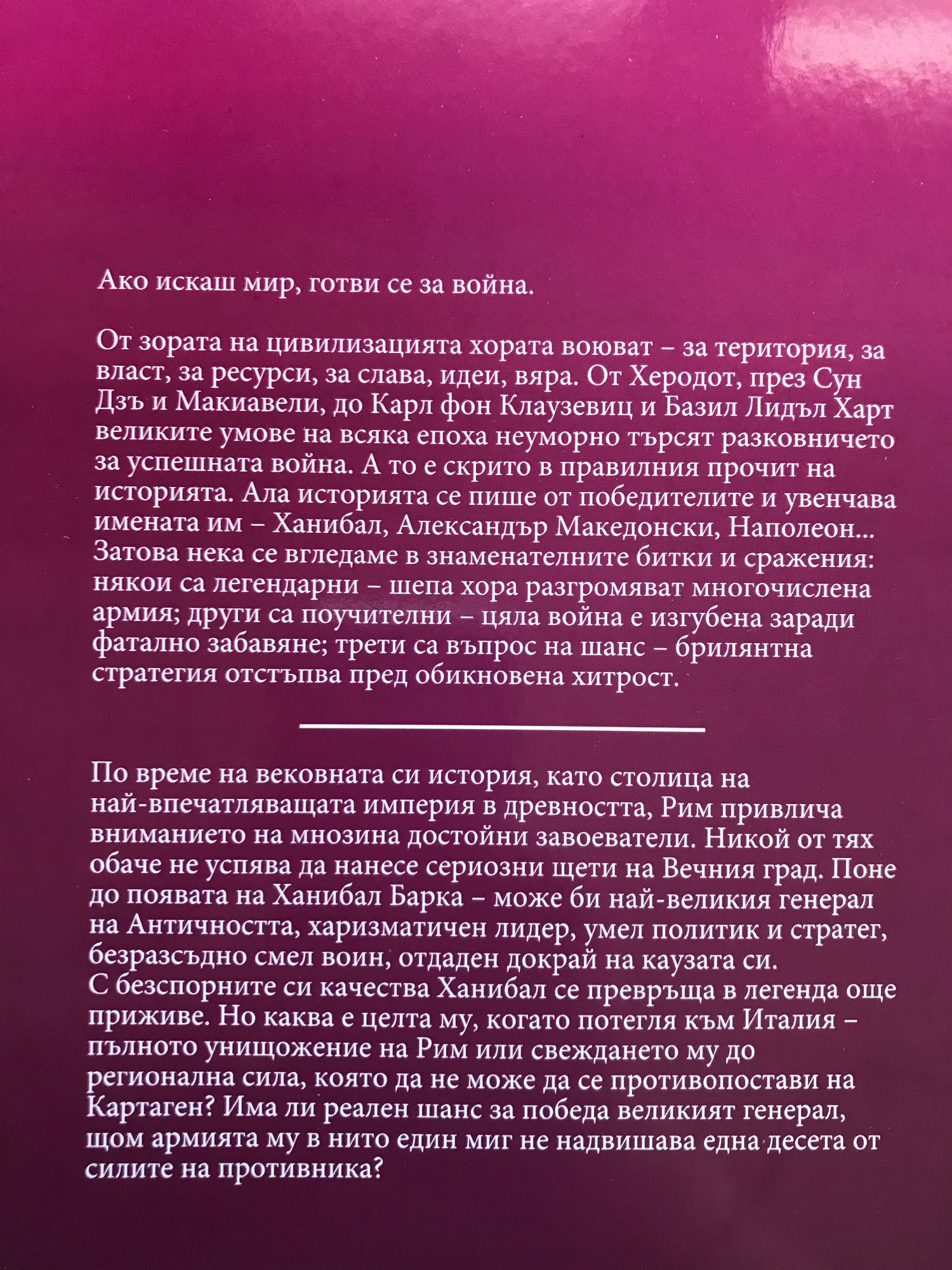 По време на вековната си история, като столица на най-впечатляващата империя в древността, Рим привлича вниманието на мнозина достойни завоеватели. Никой от тях обаче не успява да нанесе сериозни щети на Вечния град. Поне до появата на Ханибал Барка – може би най-великия генерал на Античността, харизматичен лидер, умел политик и стратег, безразсъдно смел воин, отдаден докрай на каузата си. С безспорните си качества Ханибал се превръща в легенда още приживе. Но каква е целта му, когато потегля към Италия – пълното унищожение на Рим или свеждането му до регионална сила, която да не може да се противопостави на Картаген? Има ли реален шанс за победа великият генерал, щом армията му в нито един миг не надвишава една десета от силите на противника?